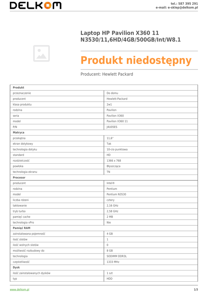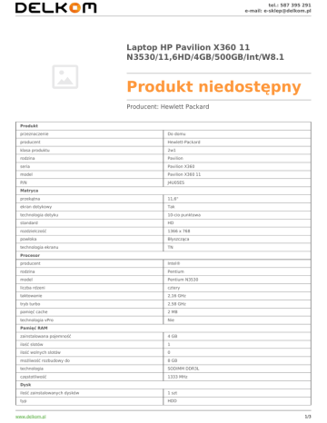 tel.: 587 395 291 e-mail: [email protected] Laptop HP Pavilion X360 11 N3530/11,6HD/4GB/500GB/Int/W8.1 Produkt niedostępny Producent: Hewlett Packard Produkt przeznaczenie Do domu producent Hewlett-Packard klasa produktu 2w1 rodzina Pavilion seria Pavilion X360 model Pavilion X360 11 P/N J4U05ES Matryca przekątna 11,6" ekran dotykowy Tak technologia dotyku 10-cio punktowa standard HD rozdzielczość 1366 x 768 powłoka Błyszcząca technologia ekranu TN Procesor producent Intel® rodzina Pentium model Pentium N3530 liczba rdzeni cztery taktowanie 2,16 GHz tryb turbo 2,58 GHz pamięć cache 2 MB technologia vPro Nie Pamięć RAM zainstalowana pojemność 4 GB ilość slotów 1 ilość wolnych slotów 0 możliwość rozbudowy do 8 GB technologia SODIMM DDR3L częstotliwość 1333 MHz Dysk ilość zainstalowanych dysków 1 szt typ HDD www.delkom.pl 1/3 tel.: 587 395 291 e-mail: [email protected] pojemność 500 GB interfejs SATA III prędkość obrotowa 5400 rpm wolne sloty Brak Karta graficzna producent karty zintegrowanej Intel® model karty zintegrowanej HD Graphics model karty dedykowanej Brak Napędy napęd optyczny Brak Multimedia karta dźwiękowa HD Audio głośniki ilość 2 wbudowana kamera 0,3 Mpix wbudowany mikrofon Tak czytnik kart pamięci Tak obsługiwane formaty pamięci SD Komunikacja karta sieciowa przewodowa 10/100 Mbps typ bezprzewodowej karty sieciowej 802.11 b/g/n wbudowany modem Brak bluetooth 4.0 NFC (near field connection) Nie WiDi (Intel® Wireless Display) Nie Interfejsy WE/WY HDMI 1 szt Display Port Brak VGA (RGB) Brak USB 3.0 1 szt USB 2.0 1 szt thunderbolt Brak RJ-45 [LAN] 1 szt wyjście słuchawkowe Jack 3,5 mm wejście mikrofonu Brak Klawiatura układ klawiatury Qwerty (International) panel numeryczny Nie podświetlenie Nie odporność na zalanie Nie Urządzenie wskazujące typ 1 Touchpad typ 2 Brak System operacyjny wersja Windows 8.1 architektura 64 bit www.delkom.pl 2/3 tel.: 587 395 291 e-mail: [email protected] wersja językowa polska Systemy zabezpieczeń gniazdo na blokadę Kensington Tak czytnik linii papilarnych Nie moduł TPM Nie czytnik Smart Card Nie Akumulator pojemność baterii 29 Wh przybliżony czas pracy Do 5 godzin Właściwości fizyczne materiał obudowy Tworzywo sztuczne z poliwęglanem wzmocniona konstrukcja Nie kolor obudowy Srebrny kolor pokrywy Srebrny kolor klawiatury Czarny kolor ramki matrycy Czarny waga 1,4 kg wysokość (mm) 22 szerokość (mm) 308 głębokość (mm) 215 Gwarancja typ gwarancji Producenta rodzaj gwarancji Carry-In/Door-To-Door (dostarczenie do serwisu) gwarancja czas trwania 24 miesiące międzynarodowa Nie www.delkom.pl 3/3