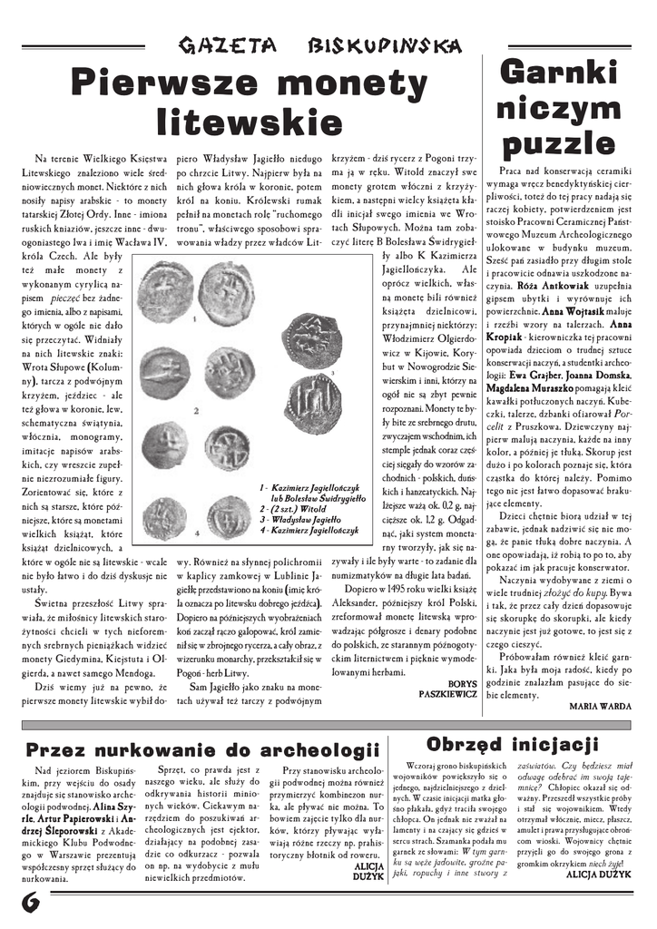 Pierwsze monety litewskie Na terenie Wielkiego Księstwa Litewskiego znaleziono wiele śred− niowiecznych monet. Niektóre z nich nosiły napisy arabskie − to monety tatarskiej Złotej Ordy. Inne − imiona ruskich kniaziów, jeszcze inne − dwu− ogoniastego lwa i imię Wacława IV, króla Czech. Ale były też małe monety z wykonanym cyrylicą na− pisem pieczęć bez żadne− go imienia, albo z napisami, których w ogóle nie dało się przeczytać. Widniały na nich litewskie znaki: Wrota Słupowe (Kolum− ny), tarcza z podwójnym krzyżem, jeździec − ale też głowa w koronie, lew, schematyczna świątynia, włócznia, monogramy, imitacje napisów arabs− kich, czy wreszcie zupeł− nie niezrozumiałe figury. Zorientować się, które z nich są starsze, które póź− niejsze, które są monetami wielkich książąt, które książąt dzielnicowych, a które w ogóle nie są litewskie − wcale nie było łatwo i do dziś dyskusje nie ustały. Świetna przeszłość Litwy spra− wiała, że miłośnicy litewskich staro− żytności chcieli w tych nieforem− nych srebrnych pieniążkach widzieć monety Giedymina, Kiejstuta i Ol− gierda, a nawet samego Mendoga. Dziś wiemy już na pewno, że pierwsze monety litewskie wybił do− krzyżem − dziś rycerz z Pogoni trzy− ma ją w ręku. Witold znaczył swe monety grotem włóczni z krzyży− kiem, a następni wielcy książęta kła− dli inicjał swego imienia we Wro− tach Słupowych. Można tam zoba− czyć literę B Bolesława Świdrygieł− ły albo K Kazimierza Jagiellończyka. Ale oprócz wielkich, włas− ną monetę bili również książęta dzielnicowi, przynajmniej niektórzy: Włodzimierz Olgierdo− wicz w Kijowie, Kory− but w Nowogrodzie Sie− wierskim i inni, którzy na ogół nie są zbyt pewnie rozpoznani. Monety te by− ły bite ze srebrnego drutu, zwyczajem wschodnim, ich stemple jednak coraz częś− ciej sięgały do wzorów za− chodnich − polskich, duńs− 1 − Kazimierz Jagiellończyk kich i hanzeatyckich. Naj− lub Bolesław Świdrygiełło lżejsze ważą ok. 0,2 g, naj− 2 − (2 szt.) Witold 3 − Władysław Jagiełło cięższe ok. 1,2 g. Odgad− 4 − Kazimierz Jagiellończyk nąć, jaki system moneta− rny tworzyły, jak się na− wy. Również na słynnej polichromii zywały i ile były warte − to zadanie dla w kaplicy zamkowej w Lublinie Ja− numizmatyków na długie lata badań. Dopiero w 1495 roku wielki książę giełłę przedstawiono na koniu (imię kró− la oznacza po litewsku dobrego jeźdźca). Aleksander, późniejszy król Polski, Dopiero na późniejszych wyobrażeniach zreformował monetę litewską wpro− koń zaczął rączo galopować, król zamie− wadzając półgrosze i denary podobne nił się w zbrojnego rycerza, a cały obraz, z do polskich, ze starannym późnogoty− wizerunku monarchy, przekształcił się w ckim liternictwem i pięknie wymode− lowanymi herbami. Pogoń − herb Litwy. BORYS Sam Jagiełło jako znaku na mone− PASZKIEWICZ tach używał też tarczy z podwójnym piero Władysław Jagiełło niedugo po chrzcie Litwy. Najpierw była na nich głowa króla w koronie, potem król na koniu. Królewski rumak pełnił na monetach rolę “ruchomego tronu”, właściwego sposobowi spra− wowania władzy przez władców Lit− Przez nurkowanie do archeologii Nad jeziorem Biskupińs− kim, przy wejściu do osady znajduje się stanowisko arche− ologii podwodnej. Alina Szy− rle rle, Artur Papierowski i An− drzej Śleporowski z Akade− mickiego Klubu Podwodne− go w Warszawie prezentują współczesny sprzęt służący do nurkowania. Sprzęt, co prawda jest z naszego wieku, ale służy do odkrywania historii minio− nych wieków. Ciekawym na− rzędziem do poszukiwań ar− cheologicznych jest ejektor, działający na podobnej zasa− dzie co odkurzacz − pozwala on np. na wydobycie z mułu niewielkich przedmiotów. Garnki niczym puzzle Praca nad konserwacją ceramiki wymaga wręcz benedyktyńskiej cier− pliwości, toteż do tej pracy nadają się raczej kobiety, potwierdzeniem jest stoisko Pracowni Ceramicznej Państ− wowego Muzeum Archeologicznego ulokowane w budynku muzeum. Sześć pań zasiadło przy długim stole i pracowicie odnawia uszkodzone na− czynia. Róża Antkowiak uzupełnia gipsem ubytki i wyrównuje ich powierzchnie. Anna Wojtasik maluje i rzeźbi wzory na talerzach. Anna Kropiak − kierowniczka tej pracowni opowiada dzieciom o trudnej sztuce konserwacji naczyń, a studentki archeo− logii: Ewa Grajber Grajber, Joanna Domska Domska, Magdal ena Muraszko pomagają kleić Magdalena kawałki potłuczonych naczyń. Kube− czki, talerze, dzbanki ofiarował Por− celit z Pruszkowa. Dziewczyny naj− pierw malują naczynia, każde na inny kolor, a później je tłuką. Skorup jest dużo i po kolorach poznaje się, która cząstka do której należy. Pomimo tego nie jest łatwo dopasować braku− jące elementy. Dzieci chętnie biorą udział w tej zabawie, jednak nadziwić się nie mo− gą, że panie tłuką dobre naczynia. A one opowiadają, iż robią to po to, aby pokazać im jak pracuje konserwator. Naczynia wydobywane z ziemi o wiele trudniej złożyć do kupy. Bywa i tak, że przez cały dzień dopasowuje się skorupkę do skorupki, ale kiedy naczynie jest już gotowe, to jest się z czego cieszyć. Próbowałam również kleić garn− ki. Jaka była moja radość, kiedy po godzinie znalazłam pasujące do sie− bie elementy. Obrzęd inicjacji Wczoraj grono biskupińskich wojowników powiększyło się o jednego, najdzielniejszego z dziel− nych. W czasie inicjacji matka gło− śno płakała, gdyż traciła swojego chłopca. On jednak nie zważał na lamenty i na czający się gdzieś w sercu strach. Szamanka podała mu garnek ze słowami: W tym garn− ku są węże jadowite, groźne pa− ALICJA DUŻYK jąki, ropuchy i inne stwory z Przy stanowisku archeolo− gii podwodnej 