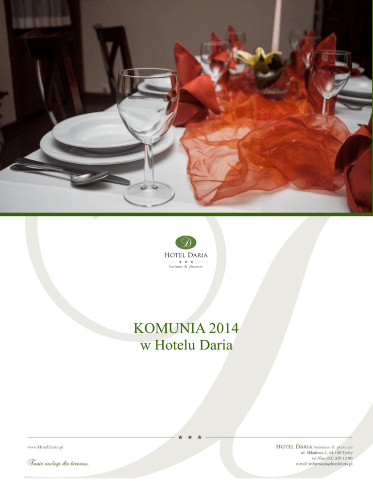 KOMUNIA 2014 w Hotelu Daria MENU KOMUNIJNE WARIANT I – 150 zł/os OBIAD Tradycyjny rosół drobiowo – wołowy z dodatkami Rolada śląska (100%) Filet z kurczaka faszerowany pieczarkami (50%) Polędwiczka wieprzowe nadziewana śliwką i serem pleśniowym (50%) Kluski śląskie, ziemniaczki z koperkiem, talarki ziemniaczane Kapusta czerwona zasmażana z boczkiem Zestaw surówek (surówka z białej kapusty, marchewki na słodko oraz selera) Sos mięsny, sos biały, sos śliwkowy DESER Pudding śmietankowy ze świeżymi owocami lub Panna Cotta z musem malinowym NAPOJE ZIMNE I GORĄCE Napoje gorące: aromatyczna kawa, wybór herbat – smaki świata – open bar, bez limitu Napoje zimne: woda mineralna niegazowana podawana w dzbankach z miętą i limonką – bez limitu, napoje niegazowane podawane w dzbankach 200ml/ osoba BUFET PRZEKĄSEK ZIMNYCH Półmisek mięs pieczonych (schab ze śliwką i morelą, karczek pieczony z ziołami, galantyna drobiowa, boczek na styl francuski) Pasztet mięsny z żurawiną Tymbaliki drobiowe Aromatyczne śledzie w sosie jogurtowym na grillowanym jabłku Jajka faszerowane pastą łososiową z kolorowym pieprzem Kawałki piersi z kurczaka w sezamie z dipami Roladki boczkowe z wątróbką i serem Rolka chińska w sosie słodko-kwaśnym Pomidorki koktajlowe faszerowane serkiem mascarpone Tradycyjna sałatka jarzynowa Wiosenna sałatka z brokułami Świeże pieczywo i smakowe masła KOLACJA GORĄCA Barszczyk z pasztecikiem francuskim MENU KOMUNIJNE WARIANT II – 180 zł/os OBIAD Camembert pieczony w boczku z ziołami Kremowa zupa z leśnych grzybów podawana z groszkiem ptysiowym i świeżą pietruszką Rolada śląska (100%) Polędwiczka wieprzowa ze szparagami (50%) Pierś z kaczki zapiekana z oscypkiem i jarzębiną (30%) Grillowany łosoś (20%) Kluski śląskie, ziemniaczki z koperkiem, szyszki ziemniaczane Kapusta czerwona zasmażana z boczkiem Zestaw surówek ( kapusta biała, marchewka, seler), warzywa gotowane na parze Sos mięsny, sos biały na winie, sos cytrynowy DESER Grillowana brzoskwinia z lodami i mięta lub suflet czekoladowy z żelowanymi wiśniami NAPOJE ZIMNE I GORĄCE Napoje gorące: aromatyczna kawa, wybór herbat – smaki świata – open bar, bez limitu Napoje zimne: woda mineralna niegazowana podawana w dzbankach z miętą i limonką – bez limitu, napoje niegazowane podawane w dzbankach 200ml/ osoba BUFET PRZEKĄSEK ZIMNYCH Półmisek mięs pieczonych (schab ze śliwką i morelą, karczek pieczony z ziołami, galantyna drobiowa, boczek na styl francuski) Pasztet mięsny z żurawiną Deska serów świata z kiścią winogron i orzechów włoskich Roladki z musem chrzanowym pod galaretką Tymbaliki drobiowe Ryba w galarecie (łosoś lub pstrąg) Roladki z szynki i ziołowego omleta Szynka parmeńska z melonem Kolorowe ruloniki z serkiem mascarpone i wędzonym łososiem z kiełkami słonecznika Zapiekana cykoria z sosem serowym Mieszanka sałat ze szpinakiem, fetą, jajkiem i pieczarkami Tradycyjna sałatka jarzynowa i sałatka z avocado Marynaty oraz świeże pieczywo i smakowe masła KOLACJA GORĄCA Zrazik drobiowy z zielonym omletem z sosem bazyliowym podawany z ziemniakami z pieca i warzywami Mamy nadzieję że nasza oferta spełni Państwa oczekiwania. Zapraszamy do kontaktu ! Hotel Daria Recepcja tel: + 48 (32) 329 12 90 e-mail: [email protected] www.HotelDaria.pl