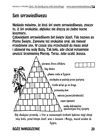 strona z e-booka Quiz. Na każdą porę roku kościelnego - www.pracowniacalamus.pl Sen sprawiedliwego Niekiedy mówimy, ¿e ktoœ œpi snem sprawiedliwego, znaczy to, i¿ œpi spokojnie, g³êboko; nie drêcz¹ go ¿adne nocne koszmary. Cz³owiekiem sprawiedliwym by³ œwiêty Józef. Tak nazywa go Pismo Œwiête. Zapewne te¿ spokojnie spa³, ale miewa³ przedziwne sny. W czasie snu przychodzi³ do niego anio³ i objawia³ mu wolê Bo¿¹. Tak by³o, gdy chcia³ potajemnie opuœciæ brzemienn¹ Maryjê. Teraz, ¿eby ocaliæ Jezusa. pierwsza litera alfabetu bóg s³oñca g³ówna rzeka w Egipcie niezbêdna w podró¿y przez pustyniê trzeba wzi¹æ go na drogê przenoœny dom zwierzê juczne(zdrobniale) zapas ¿ywnoœci osoby dobrowolnie opuszczaj¹ce kraj ojczysty Gdy zbudujesz piramidê, z liter w zaznaczonych kratkach bêdziesz móg³ u³o¿yæ imiê króla, przed którym Józef, wraz z Jezusem i Maryj¹, musia³ uciekaæ do Egiptu. BO¯E NARODZENIE 20
