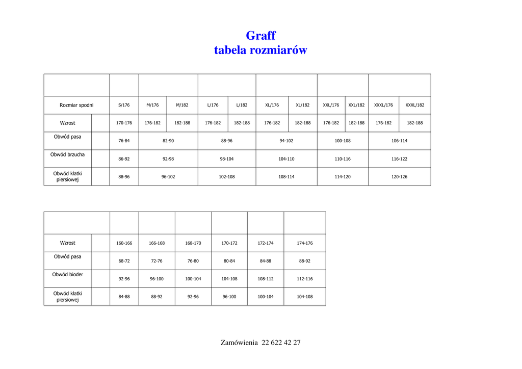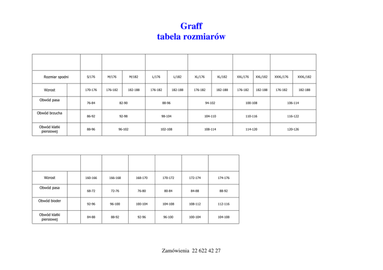 Graff tabela rozmiarów Odzież męska S Rozmiar spodni S/176 M/176 M/182 L/176 L/182 XL/176 XL/182 XXL/176 XXL/182 XXXL/176 XXXL/182 A 170-176 176-182 182-188 176-182 182-188 176-182 182-188 176-182 182-188 176-182 182-188 B 76-84 82-90 88-96 94-102 100-108 106-114 C 86-92 92-98 98-104 104-110 110-116 116-122 D 88-96 96-102 102-108 108-114 114-120 120-126 Wzrost Obwód pasa Obwód brzucha Obwód klatki piersiowej Obwód pasa Obwód bioder Obwód klatki piersiowej L XL XXL S M L XL XXL XXXL A 160-166 166-168 168-170 170-172 172-174 174-176 B 68-72 72-76 76-80 80-84 84-88 88-92 C 92-96 96-100 100-104 104-108 108-112 112-116 D 84-88 88-92 92-96 96-100 100-104 104-108 Bielizna Damska Wzrost M Zamówienia 22 622 42 27 XXXL