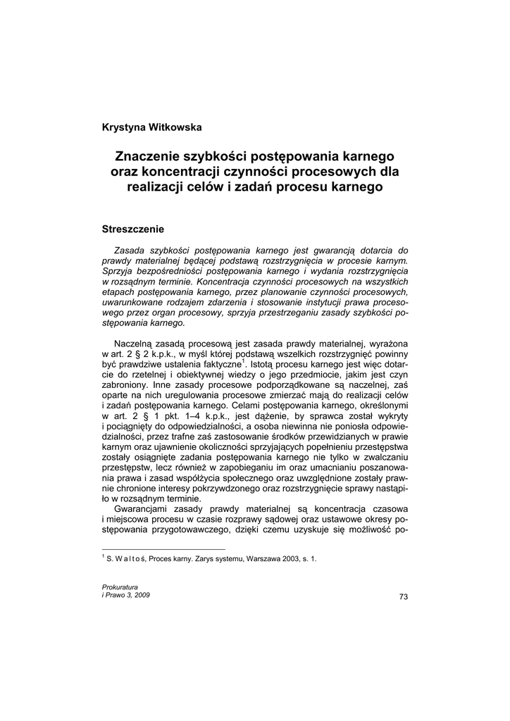Znaczenie szybkości postępowania karnego… Krystyna Witkowska Znaczenie szybkości postępowania karnego oraz koncentracji czynności procesowych dla realizacji celów i zadań procesu karnego Streszczenie Zasada szybkości postępowania karnego jest gwarancją dotarcia do prawdy materialnej będącej podstawą rozstrzygnięcia w procesie karnym. Sprzyja bezpośredniości postępowania karnego i wydania rozstrzygnięcia w rozsądnym terminie. Koncentracja czynności procesowych na wszystkich etapach postępowania karnego, przez planowanie czynności procesowych, uwarunkowane rodzajem zdarzenia i stosowanie instytucji prawa procesowego przez organ procesowy, sprzyja przestrzeganiu zasady szybkości postępowania karnego. Naczelną zasadą procesową jest zasada prawdy materialnej, wyraŜona w art. 2 § 2 k.p.k., w myśl której podstawą wszelkich rozstrzygnięć powinny być prawdziwe ustalenia faktyczne1. Istotą procesu karnego jest więc dotarcie do rzetelnej i obiektywnej wiedzy o jego przedmiocie, jakim jest czyn zabroniony. Inne zasady procesowe podporządkowane są naczelnej, zaś oparte na nich uregulowania procesowe zmierzać mają do realizacji celów i zadań postępowania karnego. Celami postępowania karnego, określonymi w art. 2 § 1 pkt. 1–4 k.p.k., jest dąŜenie, by sprawca został wykryty i pociągnięty do odpowiedzialności, a osoba niewinna nie poniosła odpowiedzialności, przez trafne zaś zastosowanie środków przewidzianych w prawie karnym oraz ujawnienie okoliczności sprzyjających popełnieniu przestępstwa zostały osiągnięte zadania postępowania karnego nie tylko w zwalczaniu przestępstw, lecz równieŜ w zapobieganiu im oraz umacnianiu poszanowania prawa i zasad współŜycia społecznego oraz uwzględnione zostały prawnie chronione interesy pokrzywdzonego oraz rozstrzygnięcie sprawy nastąpiło w rozsądnym terminie. Gwarancjami zasady prawdy materialnej są koncentracja czasowa i miejscowa procesu w czasie rozprawy sądowej oraz ustawowe okresy postępowania przygotowawczego, dzięki czemu uzyskuje się moŜliwość po1 S. W a l t o ś, Proces karny. Zarys systemu, Warszawa 2003, s. 1. Prokuratura i Prawo 3, 2009 73 K. Witkowska równania dowodów, a przede wszystkim skrócenie odstępu czasowego dzielącego przestępstwo od momentu osądzenia2. Dyrektywa, aby proces stanowił zwarty i konsekwentny ciąg czynności i zdarzeń, bez przerw i zahamowań, by postępowanie karne toczyło się sprawnie, co zapewnia dotarcie do ustaleń faktycznych związanych z przedmiotem postępowania, określana jest mianem zasady koncentracji czynności procesowych lub koncentracji procesu i pozostaje w ścisłym związku z zasadą szybkości procesu. Koncentracja czynności procesowych jest konsekwencją tejŜe zasady. Zasada ta znalazła odzwierciedlenie w art. 2 § 1 pkt 4 k.p.k., w myśl którego jednym z celów postępowania karnego jest dąŜenie, by rozstrzygnięcie sprawy nastąpiło w rozsądnym terminie. Kodeks postępowania karnego z 1969 r., przewidując szereg instytucji usprawniających przebieg postępowania karnego, nie zdefiniował wprost tej zasady procesowej. W literaturze przewaŜał pogląd, Ŝe koncentracja czynności procesowych i zachowanie ciągłości postępowania sprzyja jego szybkości, to sama szybkość traktowana była jako realizacja bezpośredniości w dotarciu do prawdy materialnej. Praktyka wymiaru sprawiedliwości doprowadziła do podjęcia działań związanych z zapewnieniem szybkości postępowania karnego, która przyczyni się do pełnej realizacji jego celów. Istotne znaczenie dla dostrzegania tego zagadnienia miało przyjęcie przez Polskę Europejskiej Konwencji o Ochronie Praw Człowieka i Podstawowych Wolności. W myśl art. 6 Konwencji, kaŜdy ma „prawo do sprawiedliwego i publicznego rozpoznania jego sprawy w rozsądnym terminie przez niezawisły i bezstronny sąd ustanowiony ustawą”. W konsekwencji realizacji wymogów Konwencji zasada szybkości postępowania karnego znalazła swoje odzwierciedlenie w kodeksie postępowania karnego z 1997 r., w którym przewidziano szereg instytucji procesowych sprzyjających jej realizacji3. Koncentracja czynności procesowych jest konsekwencją tejŜe zasady, jednak szybkość postępowania karnego jest istotna, o ile nie pozostaje w sprzeczności z interesem prawdy materialnej4. Szybkość postępowania karnego daje gwarancję właściwej realizacji bezpośredniości procesu, a więc moŜliwości zastosowania prawa karnego materialnego w oparciu o ustalenia faktyczne, które bezpośrednio odnoszą się do faktów i okoliczności związanych ze zdarzeniem będącym przedmiotem dowodzenia. Osiągnięcie tego celu zaleŜy właśnie od jego koncentracji, a więc zachowania właściwej dynamiki czynności procesowych, ich logicznego wzajemnego następstwa wynikającego z charakteru zdarzenia, uwarunkowań o charakterze obiek2 S. W a l t o ś, Proces…, s. 217. D. S z u m i ł o - K u l c z y c k a, S. M a j c h e r, Nauka prawa wobec problematyki szybkości postępowania karnego, PiP 2005, nr 8, s. 55–61. 4 M. C i e ś l a k, Polska procedura karna. Podstawowe załoŜenia teoretyczne, Warszawa 1971, s. 351–353. 3 74 Prokuratura i Prawo 3, 2009 Znaczenie szybkości postępowania karnego… tywnym i subiektywnym, leŜących zarówno po stronie organów procesowych, jak i jego uczestników. Istnieje jednak niebezpieczeństwo w zakresie dokonywania właściwych ustaleń faktycznych i tym samym realizacji zadań postępowania karnego, gdy przestrzeganie jego szybkości powoduje pobieŜne gromadzenie dowodów i w konsekwencji prowadzi do uchybień nie tylko w zakresie procesu dowodzenia, ale takŜe do innych błędów procesowych związanych choćby z zagwarantowaniem uprawnień stron procesowych i moŜliwością ich rzeczywistego udziału w procesie karnym. Stąd teŜ właściwe rozumienie zasady koncentracji procesowych i szybkości postępowania karnego musi zmierzać do 