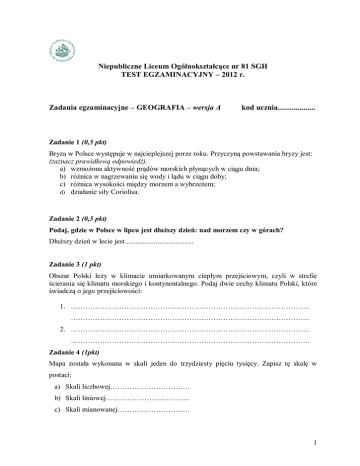 Niepubliczne Liceum Ogólnokształcące nr 81 SGH TEST EGZAMINACYJNY – 2012 r. Zadania egzaminacyjne – GEOGRAFIA – wersja A kod ucznia................... Zadanie 1 (0,5 pkt) Bryza w Polsce występuje w najcieplejszej porze roku. Przyczyną powstawania bryzy jest: (zaznacz prawidłową odpowiedź). a) wzmożona aktywność prądów morskich płynących w ciągu dnia; b) różnica w nagrzewaniu się wody i lądu w ciągu doby; c) różnica wysokości między morzem a wybrzeżem; d) działanie siły Coriolisa. Zadanie 2 (0,5 pkt) Podaj, gdzie w Polsce w lipcu jest dłuższy dzień: nad morzem czy w górach? Dłuższy dzień w lecie jest...................................... Zadanie 3 (1 pkt) Obszar Polski leży w klimacie umiarkowanym ciepłym przejściowym, czyli w strefie ścierania się klimatu morskiego i kontynentalnego. Podaj dwie cechy klimatu Polski, które świadczą o jego przejściowości: 1. ……………………………………………………………………………………… ……………………………………………………………………………………… 2. ……………………………………………………………………………………… ……………………………………………………………………………………… Zadanie 4 (1pkt) Mapa została wykonana w skali jeden do trzydziesty pięciu tysięcy. Zapisz tę skalę w postaci: a) Skali liczbowej…………………………… b) Skali liniowej…………………………….. c) Skali mianowanej………………………… 1 Zadanie 5 (2 pkt) Podaj nazwy województw, z którymi sąsiaduje województwo mazowieckie (podpisz na mapie nazwy województw): Zadanie 6 (0,5 pkt) Wymień 4 obiekty Polski znajdujące się na Liście Światowego Dziedzictwa (UNESCO) 1............................................................................................................................................... 2............................................................................................................................................... 3............................................................................................................................................... 4............................................................................................................................................... Zadanie 7 (0,5 pkt) Wybierz i zaznacz zdanie fałszywe. a) b) c) d) Polska leży w strefie umiarkowanej ciepłej; Najcieplejszym obszarem Polski jest Pojezierze Suwalskie; W Polsce są 23 parki narodowe; Prądy morskie nie mają wpływu na wielkość temperatur na wybrzeżach, które opływają. Zadanie 8 (0,5 pkt) Formacja roślinna będąca zbiorowiskiem niskich traw oraz wysokich bylin zwana w Ameryce Północnej prerią to: a) b) c) d) tundra; sawanna; półpustynia; step. 2 Zadanie 9 (1 pkt) Podaj dwa czynniki, które przyczyniły się do dużej gęstości zaludnienia kontynentu europejskiego. 1.............................................................................................................................................. ……………………………………………………………………………………………… 2............................................................................................................................................... ……………………………………………………………………………………………….. Zadanie 10 (1 pkt) Wymienione poniżej nazwy rzek przyporządkuj do odpowiedniej grupy. Wieprz, Pilica, Warta, Bzura, Nysa Kłodzka, Raba, Noteć a) Dopływy Wisły: .............................................................................................................. b) Dopływy Odry: ............................................................................................................... Zadanie 11 (0,5 pkt) Południki położone na półkuli zachodniej oznaczamy symbolem: a) W b) E c) N d) S Zadanie 12 (0,5 pkt) Poniżej podano cechy charakterystyczne dla kilku krain geograficznych. Zaznacz opis, który dotyczy Żuław Wiślanych. Pasmo Łysogór, Puszcza Jodłowa, zjawiska krasowe, gołoborza; Rzeźba młodoglacjalna, teren silnie pagórkowaty, Hańcza, jezioro Wigry; Doliny U-kształtne, jeziora cyrkowe, jaskinie, piętra roślinne. Depresja, brak lasów, teren równinny, liczne kanały i rowy melioracyjne, deficyt wody pitnej. e) Rzeźba falista i pagórkowata, krajobraz rolniczy, wąwozy lessowe. a) b) c) d) Zadanie 13 (0,5 pkt) Szerokość geograficzna to: a) Kąt zawarty między płaszczyzną równika(0º) a promieniem ziemskim przechodzącym przez dany punkt na powierzchni Ziemi; b) Kąt zawarty między półpłaszczyzną południka (0º) a płaszczyzną równika; c) Kąt zawarty między płaszczyzną równika a promieniem ziemskim; d) Stosunek odległości na mapie do odległości w terenie. 3 Zadanie 14 (0,5 pkt) Równik to: a) najdłuższy południk; b) najkrótszy południk; c) najkrótszy równoleżnik; d) najdłuższy równoleżnik. Zadanie 15 (0,5 pkt) Wiatry zachodnie wieją: a) b) c) d) ze wschodu na zachód; z północy na południe; z zachodu na wschód; z południa na północ. Zadanie 16 (0,5 pkt) Ostańce skalne, np.: „Maczuga Herkulesa” znajdują się w: a) Ojcowskim Parku Narodowym; b) Wolińskim Parku Narodowym; c) Tatrzańskim Parku Narodowym; d) Karkonoskim Parku Narodowym. Zadanie 17 (0,5 pkt) Ruchome wydmy nadmorskie znajdują się w: a) Wolińskim PN b) Słowińskim PN c) Wielkopolskim PN d) Kampinoskim PN Zadanie 18 (0,5 pkt) Które parki narodowe można zwiedzić będąc w Karpatach? a) Roztoczański Park Narodowy, Karkonoski Park Narodowy; b) Babiogórski Park Narodowy, Park Narodowy Gór Stołowych; c) Poleski Park Narodowy, Park Tatrzański Park Narodowy; d) Magurski Park Narodowy, Pieniński Park Narodowy. Zadanie 19 (0,5 pkt) Niedźwiedź brunatny występuje w: a) Słowiński