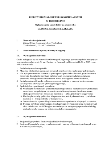 KIEROWNIK ZAKŁADU USŁUG KOMUNALNYCH W TRZEBIELINIE Ogłasza nabór kandydatów na stanowisko GŁÓWNY KSIĘGOWY ZAKŁADU I. Nazwa i adres jednostki Zakład Usług Komunalnych w Trzebielinie Trzebielino 43, 77-235 Trzebielino II. Nazwa stanowiska pracy: Główny Księgowy III. Wymagania niezbędne: Osoba ubiegająca się na stanowisko Głównego Księgowego powinna spełniać następujące wymagania zgodnie z art. 54 ust. 2 ustawy o finansach publicznych (Dz.U. z 2013 r. poz. 885 ze zmianami): 1. Posiada obywatelstwo polskie, 2. Ma pełną zdolność do czynności prawnych oraz korzysta z pełni praw publicznych, 3. Nie była prawomocnie skazana za przestępstwa przeciwko obrotowi gospodarczemu, przeciwko działalności instytucji państwowych oraz samorządu terytorialnego, przeciwko wiarygodności dokumentów lub za przestępstwo karne skarbowe, 4. Posiada znajomość języka polskiego w mowie i piśmie w zakresie koniecznym do wykonywania obowiązków głównego księgowego, 5. Spełnia jeden z poniższych warunków: a) Ukończyła ekonomiczne jednolite studia magisterskie, ekonomiczne wyższe studia zawodowe, uzupełniające ekonomiczne studia magisterskie lub ekonomiczne studia podyplomowe i posiada co najmniej 3 – letnią praktykę w księgowości, b) Ukończyła średnią, policealną lub pomaturalną szkołę ekonomiczną i posiada co najmniej 6 – letnią praktykę w księgowości, c) Jest wpisana do rejestru biegłych rewidentów na podstawie odrębnych przepisów, d) Posiada certyfikat uprawniający do usługowego prowadzenia ksiąg rachunkowych albo świadectwo kwalifikacyjne uprawniające do usługowego prowadzenia ksiąg rachunkowych, wydane na podstawie odrębnych przepisów. IV. Wymagania dodatkowe 1. Znajomość gospodarki finansowej zakładów budżetowych, 2. Znajomość przepisów stawy o rachunkowości i ustawy o finansach publicznych wraz z aktami wykonawczymi, 3. Znajomość przepisów z prawa pracy, ubezpieczeń społecznych oraz podatku dochodowego od osób fizycznych i prawnych, 4. Znajomość przepisów z zakresu sprawozdawczości budżetowej i planu kont, 5. Znajomość przepisów ustawy o podatku od towarów i usług VAT, 6. Dobra znajomość obsługi komputera w środowisku Windows, programów pakietu MS Office oraz programów księgowości budżetowej RADIX, 7. Samodzielność, dokładność, odpowiedzialność, rzetelność, kreatywność, dyspozycyjność. V. Zakres wykonywanych zadań na stanowisku 1. Prowadzenie rachunkowości jednostki: a) Zgodnie z przyjętymi zasadami (polityki) rachunkowości, b) Prowadzenie na podstawie dowodów księgowych ksiąg rachunkowych, c) Okresowe ustalania lub sprawdzania drogą inwentaryzacji rzeczywistego stanu aktywów i pasywów, rozliczanie inwentaryzacji, d) Wyceny aktywów i pasywów oraz ustalanie wyniku finansowego, e) Sporządzanie sprawozdań finansowych, 2. Wykonywanie dyspozycji środkami pieniężnymi. 3. Dokonywanie wstępnej kontroli: a) Zgodności operacji gospodarczych i finansowych z planem finansowym, b) Dokonywanie wstępnej kontroli kompletności i rzetelności dokumentów dotyczących operacji gospodarczych i finansowych, 4. Przygotowywanie planu finansowego zakładu budżetowego. 5. Wykonywanie innych czynności i zadań dotyczących pracowników samorządowych wynikających z obowiązujących przepisów prawa. VI. Informacja o warunkach pracy na stanowisku 1. Miejsce świadczenia pracy: budynek administracyjny Zakładu Usług Komunalnych w Trzebielinie, Trzebielino 43 2. Zatrudnienie na podstawie umowy o pracę z możliwością skierowania do służby przygotowawczej, 3. Wymiar czasu pracy – pełny wymiar czasu pracy, 4. Stanowisko pracy związane z pracą przy komputerze, 5. Termin rozpoczęcia zatrudnienia – maj 2016 rok. VII. Wymagane dokumenty 1. Życiorys (CV) 2. List motywacyjny 3. Kserokopie dokumentów potwierdzających wykształcenie (poświadczone przez kandydata za zgodność z oryginałem) 4. Kserokopie świadectw pracy (poświadczone przez kandydata za zgodność z oryginałem) lub zaświadczenie o zatrudnieniu potwierdzające doświadczenie zawodowe, 5. Kwestionariusz osobowy osoby ubiegającej się o zatrudnienie, 6. Oświadczenie kandydata o posiadaniu pełnej zdolności do czynności prawnej oraz korzystaniu z pełni praw publicznych, 7. Oświadczenie kandydata o niekaralności prawomocnym wyrokiem sądu za przestępstwo przeciwko mieniu, przeciwko obrotowi gospodarczemu, przeciwko działalności instytucji państwowych oraz samorządu terytorialnego, przeciwko wiarygodności dokumentów lub za przestępstwo skarbowe (osoba wybrana do zatrudnienia będzie zobowiązana do przedstawienia oryginału aktualnego „Zapytania o udzielenie informacji o osobie” z Krajowego rejestru Karnego” 8. Oświadczenie kandydata o braku orzeczonej kary za naruszenie dyscypliny finansów publicznych w postaci zakazu pełnienia funkcji związanych z dysponowaniem środkami publicznymi, 9. Oświadczenie kandydata o stanie zdrowia pozwalającym na pracę na wskazanym stanowisku, 10. Dodatkowym atutem będzie przedłożenie referencji z miejsc pracy. VIII. Procedura naboru Postępowanie związane z naborem przeprowadzi Komisja Rekrutacyjna powołana zarządzeniem Kierownika Zakładu Usług Komunalnych w Trzebielinie. Konkurs przeprowadza się w dwóch etapach, na które składają się: 1. Wstępna analiza dokumentów aplikacyjnych i ustalenie listy kandydatów, którzy spełniają wymagania formalne określone w ogłoszeniu o naborze; oferty niekompletne i nie spełniające wymagań określonych w ogłoszeniu zostaną odrzucone, 2. Postępowanie sprawdzające wyłonionych w I etapie kandydatów poprzez rozmowę kwalifikacyjną, 3. Niezwłocznie po przeprowadzonym naborze informacja o wyniku naboru będzie upowszechniona przez umieszczenie na tablicy ogłoszeń w zakładzie oraz opublikowana w Biuletynie Informacji Publicznej. Kierownik zakładu zastrzega sobie prawo odwołania naboru, przedł