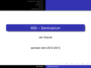 Powiazanie ˛ z wykładem Zaliczenie Prezentacja Tematy Organizacja zajeć ˛ MSI – Seminarium Jan Daciuk semestr letni 2012-2013 Jan Daciuk MSI Seminarium Powiazanie ˛ z wykładem Zaliczenie Prezentacja Tematy Organizacja zajeć ˛ Powiazanie ˛ z wykładem W skład wykładu wchodza˛ dwie tematyki: biometria, rozpoznawanie i synteza mowy. Biometria jest potraktowana na wykładzie bardzo skrótowo. Tematy omawiane na seminarium maja˛ rozwijać wykład. Rozpoznawanie i synteza mowy omawiane sa˛ na wykładzie bardziej szczegółowo, ale teoretycznie. Tematy seminarium dotycza˛ konkretnych rozwiaza ˛ ń. Jan Daciuk MSI Seminarium Powiazanie ˛ z wykładem Zaliczenie Prezentacja Tematy Organizacja zajeć ˛ Zaliczenie Prezentacja na uczelnianym laptopie – PDF lub PPT, na własnym sprz˛ecie – dowolny format, programy, multimedia itp. Sprawozdanie min. 5 stron tekstu – odpowiada treści przekazanej podczas wystapienia, ˛ PDF lub PS najpóźniej tydzień przed wystapieniem ˛ (-3 pkt za tydzień spóźnienia), zawiera wykaz źródeł. Punktacja 0-30 pkt. Nieusprawiedliwiona nieobecność: -5 pkt Jan Daciuk MSI Seminarium Powiazanie ˛ z wykładem Zaliczenie Prezentacja Tematy Organizacja zajeć ˛ folie wystapienie ˛ sprawozdanie Prezentacja – folie Bez tekstu wystapienia. ˛ Odpowiednia czcionka. Barwy i jasność. Obrazy, schematy, wykresy, filmy. Ortografia. Treść: przydatna dla słuchaczy i zdolna ich zaciekawić, bez powtarzania wykładu. Dla programów/urzadze ˛ ń także cena, jakość, instalacja, wymagania itp. Jan Daciuk MSI Seminarium Powiazanie ˛ z wykładem Zaliczenie Prezentacja Tematy Organizacja zajeć ˛ folie wystapienie ˛ sprawozdanie Prezentacja – wystapienie ˛ Przygotowanie (znajomość tematu, czas, treść). Czytanie z kartki. Głośność i intonacja. Wzory. Synchronizacja z ekranem. Interakcja. Jan Daciuk MSI Seminarium Powiazanie ˛ z wykładem Zaliczenie Prezentacja Tematy Organizacja zajeć ˛ folie wystapienie ˛ sprawozdanie Sprawozdanie Cel: przygotowanie do wystapienia. ˛ Długość zmusza do zapoznania sie˛ z materiałem, termin ogranicza przygotowanie wystapienia ˛ noca˛ przed seminarium, wykaz źródeł wyklucza przepisywanie wikipedii. Forma: zwykła forma sprawozdania (podrozdziały). Nie sa˛ to folie z wystapienia! ˛ Długość: min. 5 stron. Załacznik: ˛ wykaz źródeł. Termin doreczenia: ˛ min. tydzień przed wystapieniem ˛ (-3pkt za tydzień spóźnienia). Forma doreczenia: ˛ PDF ∨ PS. Jan Daciuk MSI Seminarium Powiazanie ˛ z wykładem Zaliczenie Prezentacja Tematy Organizacja zajeć ˛ biometria synteza mowy rozpoznawanie mowy Źródła wiedzy Tematy – biometria 1 Czytniki linii papilarnych (nie zbieranie odcisków). 2 Rozpoznawanie twarzy. 3 Rozpoznawanie dłoni. 4 Rozpoznawanie uszu. 5 Rozpoznawanie teczówki. ˛ 6 Rozpoznawanie siatkówki. 7 Rozpoznawanie podpisu. 8 Rozpoznawanie głosu (rozpoznawanie mówcy). 9 Rozpoznawanie zapachu. 10 Rozpoznawanie chodu. 11 Rozpoznawanie cz˛estości uderzeń w klawisze. Jan Daciuk MSI Seminarium Powiazanie ˛ z wykładem Zaliczenie Prezentacja Tematy Organizacja zajeć ˛ biometria synteza mowy rozpoznawanie mowy Źródła wiedzy Tematy – synteza mowy 1 Syntetyzatory polskiej mowy (także ETI). 2 Komercyjne syntetyzatory mowy. 3 Festival. 4 Festvox. 5 MBROLA. 6 GalateaTalk i TVML. 7 Syntetyzator Klatta. 8 Gnuspeech. 9 EMU. 10 Praat. 11 OLAC i VoxForge. Jan Daciuk MSI Seminarium Powiazanie ˛ z wykładem Zaliczenie Prezentacja Tematy Organizacja zajeć ˛ biometria synteza mowy rozpoznawanie mowy Źródła wiedzy Tematy – rozpoznawanie mowy 1 Rozpoznawanie polskiej mowy. 2 Komercyjne systemy rozpoznawania mowy. 3 CMU Sphinx. 4 Julius. 5 HTK. Jan Daciuk MSI Seminarium Powiazanie ˛ z wykładem Zaliczenie Prezentacja Tematy Organizacja zajeć ˛ biometria synteza mowy rozpoznawanie mowy Źródła wiedzy Skad ˛ czerpać wiedz˛e do sprawozdania i wystapienia? ˛ 1 Literatura podana na wykładzie (folie na stronie przedmiotu). 2 Bioblioteka (może sa˛ tam jeszcze inne ciekawe pozycje?). Internet: 3 Jest wiele materiałów z konferencji biometrycznych dostepnych ˛ ze stron tych konferencji. W przypadku tematów dotyczacych ˛ rozpoznawania lub syntezy mowy warto do zapytania dodać słowo speech. Warto szukać haseł anglojezycznych ˛ (tłumaczenie tytułu wystapienia ˛ na stronie przedmiotu po wybraniu jezyka ˛ angielskiego). Użyteczne moga˛ być wyszukiwarki Google Scholar i CiteSeer. Jan Daciuk MSI Seminarium Powiazanie ˛ z wykładem Zaliczenie Prezentacja Tematy Organizacja zajeć ˛ Organizacja zajeć ˛ Od połowy semestru. 2 h w tygodniu. 2÷3 prezentacji na godzine˛ lekcyjna. ˛ Temat należy wybrać w ciagu ˛ 3 tygodni. Jan Daciuk MSI Seminarium