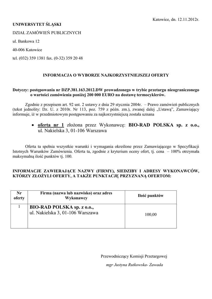 Katowice, dn. 12.11.2012r. UNIWERSYTET ŚLĄSKI DZIAŁ ZAMÓWIEŃ PUBLICZNYCH ul. Bankowa 12 40-006 Katowice tel. (032) 359 1381 fax. (0-32) 359 20 48 INFORMACJA O WYBORZE NAJKORZYSTNIEJSZEJ OFERTY Dotyczy: postępowania nr DZP.381.163.2012.DW prowadzonego w trybie przetargu nieograniczonego o wartości zamówienia poniżej 200 000 EURO na dostawę termocyklerów. Zgodnie z przepisem art. 92 ust. 2 ustawy z dnia 29 stycznia 2004r. – Prawo zamówień publicznych (tekst jednolity: Dz. U. z 2010r. Nr 113, poz. 759 z późn. zm.), zwanej dalej „Ustawą”, Zamawiający informuje, iż w przedmiotowym postępowaniu za najkorzystniejszą została uznana oferta nr 1 złożona przez Wykonawcę: BIO-RAD POLSKA sp. z o.o., ul. Nakielska 3, 01-106 Warszawa Oferta ta spełnia wszystkie warunki i wymagania określone przez Zamawiającego w Specyfikacji Istotnych Warunków Zamówienia. Oferta ta, zgodnie z kryterium oceny ofert, tj. cena – 100% otrzymała maksymalną ilość punktów tj. 100. INFORMACJE ZAWIERAJĄCE NAZWY (FIRMY), SIEDZIBY I ADRESY WYKONAWCÓW, KTÓRZY ZŁOŻYLI OFERTY, A TAKŻE PUNKTACJĘ PRZYZNANĄ OFERTOM: Nr oferty 1 Firma (nazwa lub nazwisko) oraz adres Wykonawcy BIO-RAD POLSKA sp. z o.o., ul. Nakielska 3, 01-106 Warszawa Ilość punktów 100,00 Przewodniczący Komisji Przetargowej mgr Justyna Rutkowska- Zawada