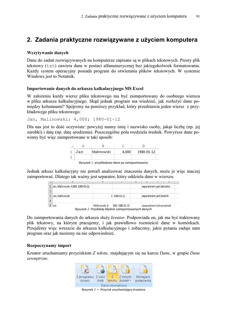 2. Zadania praktyczne rozwiązywane z użyciem komputera 91 2. Zadania praktyczne rozwiązywane z użyciem komputera Wczytywanie danych Dane do zadań rozwiązywanych na komputerze zapisane są w plikach tekstowych. Prosty plik tekstowy (txt) zawiera dane w postaci alfanumerycznej bez jakiegokolwiek formatowania. Każdy system operacyjny posiada program do otwierania plików tekstowych. W systemie Windows jest to Notatnik. Importowanie danych do arkusza kalkulacyjnego MS Excel W założeniu każdy wiersz pliku tekstowego ma być zaimportowany do osobnego wiersza w pliku arkusza kalkulacyjnego. Skąd jednak program ma wiedzieć, jak rozłożyć dane pomiędzy kolumnami? Spójrzmy na poniższy przykład, który przedstawia jeden wiersz z przykładowego pliku tekstowego: Jan, Malinowski; 4,000; 1980-01-12 Dla nas jest to dość oczywiste: powyżej mamy imię i nazwisko osoby, jakąś liczbę (np. jej zarobki) i datę (np. datę urodzenia). Poszczególne pola rozdziela średnik. Powyższe dane powinny być więc zaimportowane w taki sposób: Rysunek 1- przykładowe dane po zaimportowaniu Jednak arkusz kalkulacyjny nie potrafi analizować znaczenia danych, może je więc inaczej zaimportować. Dlatego tak ważny jest separator, który oddziela dane w wierszu. Rysunek 2- Przykłady błędnie zaimportowanych danych Do zaimportowania danych do arkusza służy kreator. Podpowiada on, jak ma być traktowany plik tekstowy, na którym pracujemy, i jak prawidłowo rozmieścić dane w komórkach. Przejdźmy więc wreszcie do arkusza kalkulacyjnego i zobaczmy, jakie pytania zadaje nam program oraz jak możemy na nie odpowiedzieć. Rozpoczynamy import Kreator uruchamiamy przyciskiem Z tekstu, znajdującym się na karcie Dane, w grupie Dane zewnętrzne. Rysunek 3 — Przycisk uruchamiający kreatora 92 Egzamin maturalny. Informatyka. Poziom rozszerzony. Zbiór zadań W nowym oknie wskazujemy plik źródłowy (w naszym przypadku będzie to plik szkoly.txt). Załóżmy, że jest to plik zawierający informacje o różnych szkołach. Poszczególne kolumny oddzielone są znakiem średnika. Przechodzimy do pierwszego kroku kreatora. Krok 1 z 3 Rysunek 4 — Krok pierwszy importu pliku Pierwsza decyzja dotyczy rodzaju pliku: • Czy jest to plik rozdzielany? W pliku rozdzielanym kolejne kolumny wyróżnione są jakimś znakiem (spacja, tabulator, średnik). Arkusz, napotykając taki znak w wierszu pliku, wie, że kolejne dane ma wpisywać w następnej kolumnie. • Czy jest to plik z polami o stałej szerokości? W takim pliku kolejne kolumny zajmują określoną liczbę znaków. Na przykład pierwsza kolumna zajmuje dziesięć znaków, a druga — osiem. Po wpisaniu do pierwszej kolumny dziesięciu znaków kreator wpisze do kolejnej następne osiem i tak dalej. Nasz plik jest rozdzielany średnikiem. Zdarza się, że dane są w pliku poprzedzone nagłówkiem. System generujący plik tekstowy może umieścić w nim datę wygenerowania pliku, swoją nazwę lub inny komentarz do danych. Pole Rozpocznij import od wiersza pozwala nam ominąć te informacje i zacząć pobieranie danych od odpowiedniego miejsca. W naszym pliku szkoly.txt w pierwszym wierszu są nagłówki kolumn, znowu więc zostawiamy domyślne ustawienia. Pole Pochodzenie pliku najczęściej zostawiamy bez zmian. Jeżeli w podglądzie pliku poniżej zamiast liter widać "krzaczki", niezrozumiałe znaki, trzeba zmienić tę opcję. Krok drugi wygląda różnie, zależnie od tego, jaki rodzaj pliku wybraliśmy przed chwilą. 2. Zadania praktyczne rozwiązywane z użyciem komputera 93 Krok 2 z 3 — plik rozdzielany Rysunek 5 — Krok drugi — dla pliku rozdzielanego W tym kroku określamy, jaki znak rozdziela kolumny — w naszym pliku to średnik. Poniżej widać podgląd importowanego pliku, odpowiednie dane są już w swoich kolumnach. Krok 2 z 3 — stała szerokość Nie dotyczy to naszego pliku, jednak spójrzmy na chwilę, jak wygląda krok drugi w tym przypadku, oczywiście dla innego pliku. Rysunek 6 — Krok drugi dla pliku o stałej szerokości pól 94 Egzamin maturalny. Informatyka. Poziom rozszerzony. Zbiór zadań W powyższym oknie musimy wskazać, gdzie zaczynają się kolejne kolumny danych, zaznaczając kursorem miejsce podziału. Krok 3 z 3 Rysunek 7 — Krok trzeci importu W trzecim kroku na ogół akceptujemy domyślne ustawienia kreatora importu. Zwróćmy jednak uwagę na dostępne tu opcje. Wybierając kolumny w podglądzie danych, możemy zmieniać sposób, w jaki są one importowane. Możemy też zdecydować, które kolumny powinny być pominięte w procesie importu. Szczególnie należy zwrócić uwagę na przycisk Zaawansowane. W tym miejscu potrzebna jest mała dygresja. W polskim systemie Windows część całkowita i ułamkowa oddzielane są przecinkiem. Ustawienia stosowane przez system Windows można sprawdzić w opcji Ustawienia regionalne Panelu sterowania. Plik tekstowy może pochodzić z innego systemu, w którym na przykład do tego stosowana jest. Rysunek 8 — Ustawienia zaawansowane importu liczb 2. Zadania praktyczne rozwiązywane z użyciem komputera 95 Na przykład liczba 1982,45 zostanie zinterpretowana w polskim systemie prawidłowo, ale ta liczba może być też zapisana jako 1,982.45 (w zapisie amerykańskim). Przy poniższych ustawieniach podpowiadamy, jak zapisać liczby w naszym pliku w taki sposób, aby w jego komórkach ostatecznie pojawiły się właściwe liczby. Dzięki temu będziemy mogli wykonywać różne działania (sumy, średnie itp.). Przy błędnych ustawieniach Excel zaimportuje ciąg znaków „1,982.45”, będzie go traktował jako tekst i nie pozwoli nam na działania, jakie byłyby dostępne w przypadku liczb. W przypadku naszego pliku możemy jednak zostawić ustawienia domyślne. Naciskam więc Zakończ i następnie OK, aby zaobserwować, jak mój arkusz wypełnia się danymi z pliku. Importowanie danych do MS Access Dane importujemy do założonej pustej bazy danych, przy czy
