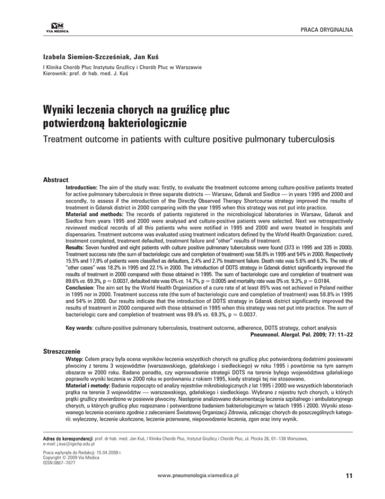 PRACA ORYGINALNA Izabela Siemion-Szcześniak, Jan Kuś I Klinika Chorób Płuc Instytutu Gruźlicy i Chorób Płuc w Warszawie Kierownik: prof. dr hab. med. J. Kuś Wyniki leczenia chorych na gruźlicę płuc potwierdzoną bakteriologicznie Treatment outcome in patients with culture positive pulmonary tuberculosis Abstract Introduction: The aim of the study was: firstly, to evaluate the treatment outcome among culture-positive patients treated for active pulmonary tuberculosis in three separate districts — Warsaw, Gdansk and Siedlce — in years 1995 and 2000 and secondly, to assess if the introduction of the Directly Observed Therapy Shortcourse strategy improved the results of treatment in Gdansk district in 2000 comparing with the year 1995 when this strategy was not put into practice. Material and methods: The records of patients registered in the microbiological laboratories in Warsaw, Gdansk and Siedlce from years 1995 and 2000 were analysed and culture-positive patients were selected. Next we retrospectively reviewed medical records of all this patients who were notified in 1995 and 2000 and were treated in hospitals and dispensaries. Treatment outcome was evaluated using treatment indicators defined by the World Health Organization: cured, treatment completed, treatment defaulted, treatment failure and “other” results of treatment. Results: Seven hundred and eight patients with culture positive pulmonary tuberculosis were found (373 in 1995 and 335 in 2000). Treatment success rate (the sum of bacteriologic cure and completion of treatment) was 58.8% in 1995 and 54% in 2000. Respectively 15.5% and 17,9% of patients were classified as defaulters, 2.4% and 2.7% treatment failure. Death rate was 5.6% and 6.3%. The rate of “other cases” was 18.2% in 1995 and 22.1% in 2000. The introduction of DOTS strategy in Gdansk district significantly improved the results of treatment in 2000 compared with those obtained in 1995. The sum of bacteriologic cure and completion of treatment was 89.6% vs. 69.3%, p = 0.0037, defaulted rate was 0% vs. 14.7%, p = 0.0005 and mortality rate was 0% vs. 9.3%, p = 0.0184. Conclusion: The aim set by the World Health Organization of a cure rate of at least 85% was not achieved in Poland neither in 1995 nor in 2000. Treatment success rate (the sum of bacteriologic cure and completion of treatment) was 58.8% in 1995 and 54% in 2000. Our results indicate that the introduction of DOTS strategy in Gdansk district significantly improved the results of treatment in 2000 compared with those obtained in 1995 when this strategy was not put into practice. The sum of bacteriologic cure and completion of treatment was 89.6% vs. 69.3%, p = 0.0037. Key words: culture-positive pulmonary tuberculosis, treatment outcome, adherence, DOTS strategy, cohort analysis Pneumonol. Alergol. Pol. 2009; 77: 11–22 Streszczenie Wstęp: Celem pracy była ocena wyników leczenia wszystkich chorych na gruźlicę płuc potwierdzoną dodatnimi posiewami plwociny z terenu 3 województw (warszawskiego, gdańskiego i siedleckiego) w roku 1995 i powtórnie na tym samym obszarze w 2000 roku. Badano ponadto, czy wprowadzenie strategii DOTS na terenie byłego województwa gdańskiego poprawiło wyniki leczenia w 2000 roku w porównaniu z rokiem 1995, kiedy strategii tej nie stosowano. Materiał i metody: Badanie rozpoczęto od analizy rejestrów mikrobiologicznych z lat 1995 i 2000 we wszystkich laboratoriach prątka na terenie 3 województw — warszawskiego, gdańskiego i siedleckiego. Wybrano z rejestru tych chorych, u których prątki gruźlicy stwierdzono w posiewie plwociny. Następnie analizowano dokumentację leczenia szpitalnego i ambulatoryjnego chorych, u których gruźlicę płuc rozpoznano i potwierdzono badaniem bakteriologicznym w latach 1995 i 2000. Wyniki stosowanego leczenia oceniano zgodnie z zaleceniami Światowej Organizacji Zdrowia, zaliczając chorych do poszczególnych kategorii: wyleczony, leczenie ukończone, leczenie przerwane, niepowodzenie leczenia, zgon oraz inny wynik. Adres do korespondencji korespondencji: prof. dr hab. med. Jan Kuś, I Klinika Chorób Płuc, Instytut Gruźlicy i Chorób Płuc, ul. Płocka 26, 01–138 Warszawa, e-mail: [email protected] Praca wpłynęła do Redakcji: 15.04.2008 r. Copyright © 2009 Via Medica ISSN 0867–7077 www.pneumonologia.viamedica.pl 11 Pneumonologia i Alergologia Polska 2009, tom 77, nr 1, strony 11–22 Wyniki: Do badania włączono 708 chorych: 373 z 1995 roku i 335 z 2000 roku. Zgodnie z kryteriami Światowej Organizacji Zdrowia odsetek chorych, którzy zakończyli leczenie z dobrym wynikiem (suma chorych wyleczonych i tych, którzy ukończyli leczenie) wynosił 58,8% w 1995 roku i 54% w 2000 roku. Samowolnie przerwało leczenie odpowiednio 15,5% i 17,9% chorych, niepowodzeniem zakończyło się leczenie 2,4% i 2,7% chorych, odsetek zgonów wynosił 5,6% i 6,3% chorych. Odsetek chorych, którzy zakończyli leczenie z wynikiem „inny”, wynosił 18,2% w roku 1995 i 22,1% w 2000 roku. Po wprowadzeniu strategii DOTS wyniki leczenia chorych w 2000 roku na obszarze województwa gdańskiego poprawiły się w sposób istotny w porównaniu z rokiem 1995. Z dobrym wynikiem leczenie ukończyło 89,6% chorych (w 1995 roku 69,3%, p = 0,0037), żaden chory nie przerwał leczenia (w 1995 roku przerwało leczenie 14,7% chorych, p = 0,0005), nie stwierdzono zgonów (w 1995 roku odsetek zgonów wynosił 9,3%, p = 0,0184). Wnioski: Odsetek chorych, którzy zakończyli leczenie z dobrym wynikiem (wyleczeni i leczenie ukończono) wynosił 58,8% w roku 1995 i 54% w 2000 roku i był niższy od zalecanego przez WHO, który powinien wynosić co najmniej 85%. Wynik badania wykazał, że rezultaty leczenia uzyskane na terenie byłego województwa gdańskiego w 2000 roku po wprowadzeniu strategii DOTS były istotnie lepsze niż w roku 1995, kiedy strategii tej nie stosowano. Z dobrym wynikiem leczenie ukończyło odpowiednio 89,6% i 69,3% c