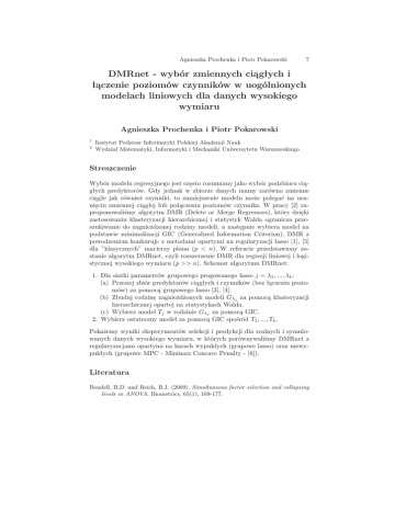 Agnieszka Prochenka i Piotr Pokarowski 7 DMRnet - wybór zmiennych ciągłych i łączenie poziomów czynników w uogólnionych modelach liniowych dla danych wysokiego wymiaru Agnieszka Prochenka i Piotr Pokarowski 1 2 Instytut Podstaw Informatyki Polskiej Akademii Nauk Wydział Matematyki, Informatyki i Mechaniki Uniwersytetu Warszawskiego Streszczenie Wybór modelu regresyjnego jest często rozumiany jako wybór podzbioru ciągłych predyktorów. Gdy jednak w zbiorze danych mamy zarówno zmienne ciągłe jak również czynniki, to zmniejszenie modelu może polegać na usunięciu zmiennej ciągłej lub połączeniu poziomów czynnika. W pracy [2] zaproponowaliśmy algorytm DMR (Delete or Merge Regressors), który dzięki zastosowaniu klasteryzacji hierarchicznej i statystyk Walda ogranicza przeszukiwanie do zagnieżdzonej rodziny modeli, a następnie wybiera model na podstawie minimalizacji GIC (Generalized Information Criterion). DMR z powodzeniem konkuruje z metodami opartymi na regularyzacji lasso [1], [5] dla ”klasycznych” macierzy planu (p < n). W referacie przedstawiony zostanie algorytm DMRnet, czyli rozszerzenie DMR dla regresji liniowej i logistycznej wysokiego wymiaru (p >> n). Schemat algorytmu DMRnet: 1. Dla siatki parametrów grupowego progowanego lasso j = λ1 , ..., λk : (a) Przesiej zbiór predyktorów ciągłych i czynników (bez łączenia poziomów) za pomocą grupowego lasso [3], [4]. (b) Zbuduj rodzinę zagnieżdżonych modeli Gλj za pomocą klasteryzacji hierarchicznej opartej na statystykach Walda. (c) Wybierz model Tj w rodzinie Gλj za pomocą GIC. 2. Wybierz ostateczny model za pomocą GIC spośród T1 , ..., Tk . Pokażemy wyniki eksperymentów selekcji i predykcji dla realnych i symulowanych danych wysokiego wymiaru, w których porównywaliśmy DMRnet z regularyzacjami opartymi na karach wypukłych (grupowe lasso) oraz niewypukłych (grupowe MPC - Minimax Concave Penalty - [6]). Literatura Bondell, H.D. and Reich, B.J. (2009). Simultaneous factor selection and collapsing levels in ANOVA. Biometrics, 65(1), 169-177. 8 Agnieszka Prochenka i Piotr Pokarowski Maj-Kańska, A., Pokarowski, P. and Prochenka, A. (2015). Delete or merge regressors for linear model selection. Electron. J. Statist., 9(2), 1749-1778. Yuan, M. and Lin, Y. (2006). Model selection and estimation in regression with grouped variables. Journal of the Royal Statistical Society: Series B (Statistical Methodology), 68(1), 49-67. Meier, L., Van De Geer, S. and Bühlmann, P. (2008). The group lasso for logistic regression. Journal of the Royal Statistical Society: Series B (Statistical Methodology), 70(1), 53-71. Gertheiss, J. and Tutz, G. (2010). Sparse modeling of categorial explanatory variables. The Annals of Applied Statistics, 2150-2180. Breheny, P. and Huang, J. (2015). Group descent algorithms for nonconvex penalized linear and logistic regression models with grouped predictors. Statistics and Computing, 25: 173-187.