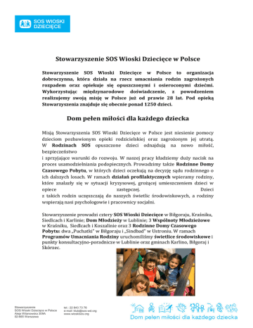 Stowarzyszenie SOS Wioski Dziecięce w Polsce Stowarzyszenie SOS Wioski Dziecięce w Polsce to organizacja dobroczynna, która działa na rzecz umacniania rodzin zagrożonych rozpadem oraz opiekuje się opuszczonymi i osieroconymi dziećmi. Wykorzystując międzynarodowe doświadczenie, z powodzeniem realizujemy swoją misję w Polsce już od prawie 28 lat. Pod opieką Stowarzyszenia znajduje się obecnie ponad 1250 dzieci. Dom pełen miłości dla każdego dziecka Misją Stowarzyszenia SOS Wioski Dziecięce w Polsce jest niesienie pomocy dzieciom pozbawionym opieki rodzicielskiej oraz zagrożonym jej utratą. W Rodzinach SOS opuszczone dzieci odnajdują na nowo miłość, bezpieczeństwo i sprzyjające warunki do rozwoju. W naszej pracy kładziemy duży nacisk na proces usamodzielniania podopiecznych. Prowadzimy także Rodzinne Domy Czasowego Pobytu, w których dzieci oczekują na decyzję sądu rodzinnego o ich dalszych losach. W ramach działań profilaktycznych wpieramy rodziny, które znalazły się w sytuacji kryzysowej, grożącej umieszczeniem dzieci w opiece zastępczej. Dzieci z takich rodzin uczęszczają do naszych świetlic środowiskowych, a rodziny wspierają nasi psychologowie i pracownicy socjalni. Stowarzyszenie prowadzi cztery SOS Wioski Dziecięce w Biłgoraju, Kraśniku, Siedlcach i Karlinie; Dom Młodzieży w Lublinie; 3 Wspólnoty Młodzieżowe w Kraśniku, Siedlcach i Koszalinie oraz 3 Rodzinne Domy Czasowego Pobytu: dwa „Puchatki” w Biłgoraju i „Sindbad” w Ustroniu. W ramach Programów Umacniania Rodziny uruchomiliśmy świetlice środowiskowe i punkty konsultacyjno-poradnicze w Lublinie oraz gminach Karlino, Biłgoraj i Skórzec. Stowarzyszenie SOS Wioski Dziecięce w Polsce Aleja Wilanowska 309A 02-665 Warszawa tel.: 22 843 73 76 e-mail: [email protected] www.wioskisos.org