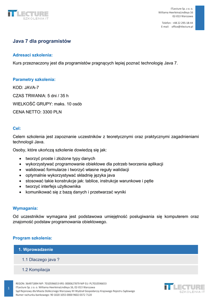 ITLecture Sp. z o. o. Williama HeerleinaLindleya 16 02-013 Warszawa Telefon: +48 22 295-18-44 E-mail: [email protected] Java 7 dla programistów Adresaci szkolenia: Kurs przeznaczony jest dla programistów pragnących lepiej poznać technologię Java 7. Parametry szkolenia: KOD: JAVA-7 CZAS TRWANIA: 5 dni / 35 h WIELKOŚĆ GRUPY: maks. 10 osób CENA NETTO: 3300 PLN Cel: Celem szkolenia jest zapoznanie uczestników z teoretycznymi oraz praktycznymi zagadnieniami technologii Java. Osoby, które ukończą szkolenie dowiedzą się jak: tworzyć proste i złożone typy danych wykorzystywać programowanie obiektowe dla potrzeb tworzenia aplikacji walidować formularze i tworzyć własne reguły walidacji optymalnie wykorzystywać składnię języka java stosować takie konstrukcje jak: tablice, instrukcje warunkowe i pętle tworzyć interfejs użytkownika komunikować się z bazą danych i przetwarzać wyniki Wymagania: Od uczestników wymagana jest podstawowa umiejętność posługiwania się komputerem oraz znajomość podstaw programowania obiektowego. Program szkolenia: 1. Wprowadzenie 1.1 Dlaczego java ? 1.2 Kompilacja 1 REGON: 364971894 NIP: 7010596653 KRS: 0000627879 NIP EU: PL7010596653 ITLecture Sp. z o. o. Williama HeerleinaLindleya 16, 02-013 Warszawa Sąd Rejonowy dla Miasta Stołecznego Warszawy XII Wydział Gospodarczy Krajowego Rejestru Sądowego Numer rachunku bankowego: 90 1020 1055 0000 9602 0372 7120 ITLecture Sp. z o. o. Williama HeerleinaLindleya 16 02-013 Warszawa Telefon: +48 22 295-18-44 E-mail: [email protected] 1.3 Mój pierwszy program 2. Wprowadzenie do obiektowości 2.1 Interfejsy 2.2 Serwisy 2.3 Reużywalność implementacji 2.4 Kontenery 2.5 Tworzenie obiektów i ich cykl życia 2.6 Garbage Collector 2.7 Metody, argumenty oraz typy zwracanej wartości 3. Operatory 3.1 Przypisanie 3.2 Rzutowanie 3.3 Operatory matematyczne 3.4 Inkrementacja oraz dekrementacja 3.5 Operatory logiczne oraz bitowe 4. Kontrola wykonania 4.1 Zastosowanie true oraz false 4.2 Wykorzystanie if oraz else 4.3 Pętle 4.3.1 for 4.3.2 while 4.3.3 do-while 4.4 Inne słowa kluczowe 2 REGON: 364971894 NIP: 7010596653 KRS: 0000627879 NIP EU: PL7010596653 ITLecture Sp. z o. o. Williama HeerleinaLindleya 16, 02-013 Warszawa Sąd Rejonowy dla Miasta Stołecznego Warszawy XII Wydział Gospodarczy Krajowego Rejestru Sądowego Numer rachunku bankowego: 90 1020 1055 0000 9602 0372 7120 ITLecture Sp. z o. o. Williama HeerleinaLindleya 16 02-013 Warszawa Telefon: +48 22 295-18-44 E-mail: [email protected] 4.4.1 switch 4.4.2 return 4.4.3 break 4.4.4 continue 5. Polimorfizm 5.1 Metody prywatne 5.2 Nadpisywanie "Overriding" 5.3 Konstruktory 5.4 Kowariancyjne typy zwracanych wartości 5.5 Projektowanie wraz z dziedziczeniem 6. Interfejsy 6.1 Zastosowanie 6.2 Do czego służą ? 6.2 Rozszerzanie interfejsu poprzez dziedziczenie 6.3 Dostarczanie implementacji dla interfejsu 7. Klasy wewnętrzne 7.1 Tworzenie klas wewnętrznych 7.2 Wykorzystanie słów kluczowych "this" oraz "new" 7.3 Anonimowe klasy wewnętrzne 7.4 Dziedziczenie z klas wewnętrznych 8. Przechowywanie obiektów 8.1 Kontenery 8.2 Tworzenie grup elementów 3 REGON: 364971894 NIP: 7010596653 KRS: 0000627879 NIP EU: PL7010596653 ITLecture Sp. z o. o. Williama HeerleinaLindleya 16, 02-013 Warszawa Sąd Rejonowy dla Miasta Stołecznego Warszawy XII Wydział Gospodarczy Krajowego Rejestru Sądowego Numer rachunku bankowego: 90 1020 1055 0000 9602 0372 7120 ITLecture Sp. z o. o. Williama HeerleinaLindleya 16 02-013 Warszawa Telefon: +48 22 295-18-44 E-mail: [email protected] 8.3 Interfejsy związane z kolekcją 8.3.1 Iterator 8.3.2 Collection 8.3.3 List 8.3.4 Stack 8.3.5 Set 8.3.6 Map 9. Zgłaszanie i obsługa wyjątków 9.1 Standardowe wyjątki Java 9.2 Tworzenie własnych wyjątków 9.3 Przechwytywanie wyjątków poprzez try / catch oraz throws 9.4 Przesłanianie metod deklarujących wyjątki 9.5 Przesłanianie konstruktorów deklarujących wyjątki 9.6 Zastosowanie słowa kluczowego final 10. Wyrażenia regularne oraz formatowanie 10.1 Struktura patternów 10.2 Zastosowanie klas Pattern oraz Matcher 10.3 Zastosowanie klasy Scanner 10.4 pobieranie danych z konsoli 11. Typy generyczne 11.1 Zastosowanie oraz po co je stosujemy 11.2 Tworzenie generycznych interfejsów 11.3 Tworzenie generycznych metod 4 REGON: 364971894 NIP: 7010596653 KRS: 0000627879 NIP EU: PL7010596653 ITLecture Sp. z o. o. Williama HeerleinaLindleya 16, 02-013 Warszawa Sąd Rejonowy dla Miasta Stołecznego Warszawy XII Wydział Gospodarczy Krajowego Rejestru Sądowego Numer rachunku bankowego: 90 1020 1055 0000 9602 0372 7120 ITLecture Sp. z o. o. Williama HeerleinaLindleya 16 02-013 Warszawa Telefon: +48 22 295-18-44 E-mail: [email protected] 11.4 Anonimowe klasy wewnętrzne 11.5 Wykorzystanie "wildcards" 11.6 Typy generyczne w kolekcjach 12. Głebsze zrozumienie kontenerów 12.1 Kolejność przechowywania w List, Collection i Set 12.2 Zrozumienie Map 12.3 Wykorzystanie hashcode i equals 12.4 Wydajność a wybór implementacji kolekcji 12.4.1 Wybór w obrębie implementacji List 12.4.2 Wybór w obrębie implementacji Set 12.4.3 Wybór w obrębie implementacji Map 13. Operacje wejścia / wyjścia 13.1 Zastosowanie klasy File 13.2 Zapis i odczyt z plików 13.3 Łańcuchy tekstowe oraz bitowe 13.3.1 Reader oraz Writer 13.3.2 InputStream oraz OutputStream 13.4 Zastosowanie filtrów w strumieniach 13.4.1 Obsługa danych w buforach 13.4.2 Pobieranie konkretnych typów danych 14. Zastosowanie Enumeracji 14.1 Zastosowanie enum 14.1.1 Statyczne importy 5 REGON: 364971894 NIP: 7010596653 KRS: 0000627879 NIP EU: PL7010596653 ITLecture Sp. z o. o. Williama HeerleinaLindleya 16, 02-013 Warszawa Sąd Rejonowy dla Miasta Stołecznego Warszawy XII Wydział Gospodarczy Krajowego Rejestru Sądowego Numer rachunku bankowego: 90 1020 1055 0000 9602 0372 7120 ITLecture Sp. z o. o. Williama HeerleinaLindleya 16 02-013 Warszawa Telefon: +48 22 295-18-44 E-mail: [email protected] 14.1.2 Dodawanie metod 14.1.3