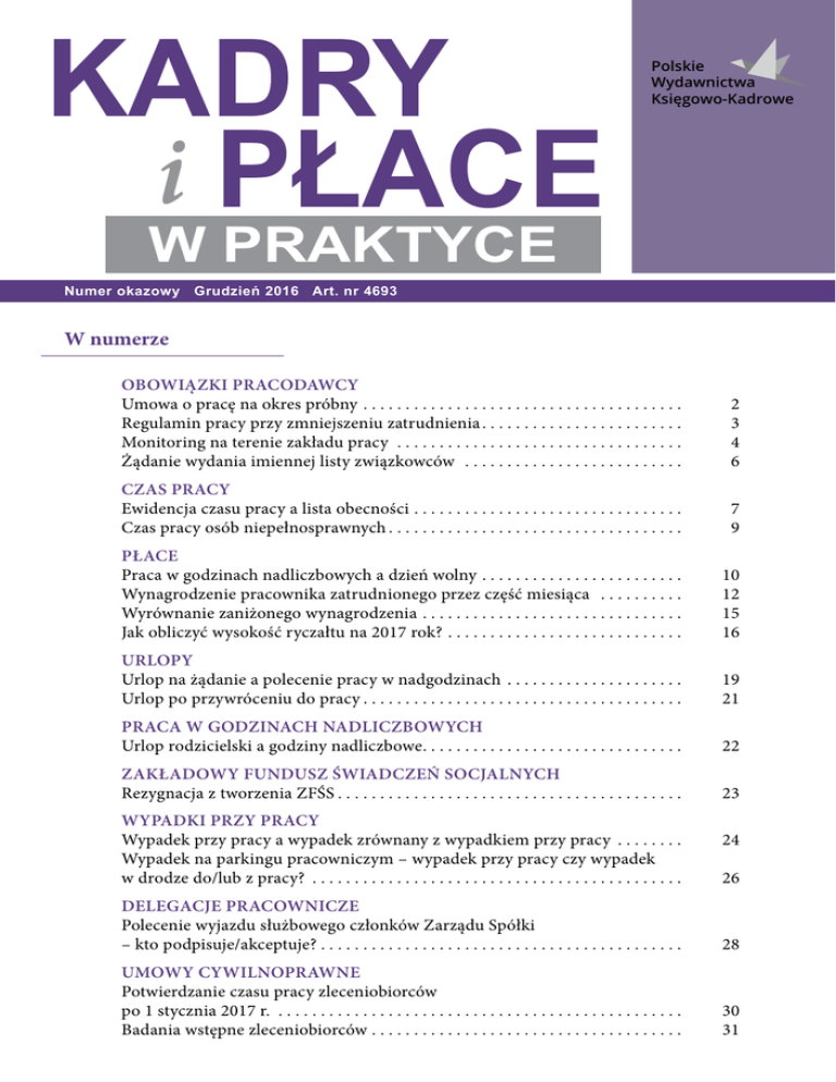 KADRY i PŁACE Polskie Wydawnictwa Księgowo-Kadrowe W PRAKTYCE Numer okazowy Grudzień 2016 Art. nr 4693 W numerze OBOWIĄZKI PRACODAWCY Umowa o pracę na okres próbny . . . . . . . . . . . . . . . . . . . . . . . . . . . . . . . . . . . . . 2 Regulamin pracy przy zmniejszeniu zatrudnienia . . . . . . . . . . . . . . . . . . . . . . . 3 Monitoring na terenie zakładu pracy . . . . . . . . . . . . . . . . . . . . . . . . . . . . . . . . . . 4 Żądanie wydania imiennej listy związkowców . . . . . . . . . . . . . . . . . . . . . . . . . . 6 CZAS PRACY Ewidencja czasu pracy a lista obecności . . . . . . . . . . . . . . . . . . . . . . . . . . . . . . . . 7 Czas pracy osób niepełnosprawnych . . . . . . . . . . . . . . . . . . . . . . . . . . . . . . . . . . 9 PŁACE Praca w godzinach nadliczbowych a dzień wolny . . . . . . . . . . . . . . . . . . . . . . . . 10 Wynagrodzenie pracownika zatrudnionego przez część miesiąca . . . . . . . . . . 12 Wyrównanie zaniżonego wynagrodzenia . . . . . . . . . . . . . . . . . . . . . . . . . . . . . . 15 Jak obliczyć wysokość ryczałtu na 2017 rok? . . . . . . . . . . . . . . . . . . . . . . . . . . . . 16 URLOPY Urlop na żądanie a polecenie pracy w nadgodzinach . . . . . . . . . . . . . . . . . . . . . 19 Urlop po przywróceniu do pracy . . . . . . . . . . . . . . . . . . . . . . . . . . . . . . . . . . . . . 21 PRACA W GODZINACH NADLICZBOWYCH Urlop rodzicielski a godziny nadliczbowe . . . . . . . . . . . . . . . . . . . . . . . . . . . . . . 22 ZAKŁADOWY FUNDUSZ ŚWIADCZEŃ SOCJALNYCH Rezygnacja z tworzenia ZFŚS . . . . . . . . . . . . . . . . . . . . . . . . . . . . . . . . . . . . . . . . 23 WYPADKI PRZY PRACY Wypadek przy pracy a wypadek zrównany z wypadkiem przy pracy . . . . . . . . 24 Wypadek na parkingu pracowniczym – wypadek przy pracy czy wypadek w drodze do/lub z pracy? . . . . . . . . . . . . . . . . . . . . . . . . . . . . . . . . . . . . . . . . . . . . 26 DELEGACJE PRACOWNICZE Polecenie wyjazdu służbowego członków Zarządu Spółki – kto podpisuje/akceptuje? . . . . . . . . . . . . . . . . . . . . . . . . . . . . . . . . . . . . . . . . . . 28 UMOWY CYWILNOPRAWNE Potwierdzanie czasu pracy zleceniobiorców po 1 stycznia 2017 r. . . . . . . . . . . . . . . . . . . . . . . . . . . . . . . . . . . . . . . . . . . . . . . . .30 Badania wstępne zleceniobiorców. . . . . . . . . . . . . . . . . . . . . . . . . . . . . . . . . . . . . 31 Weź udział w darmowych szkoleniach online! • Bogaty zestaw bezpłatnych szkoleń merytorycznych • Wyłącznie eksperci praktycy • Tylko aktualne tematy www.doradcaksiegowej.pl Co zrobić, aby wziąć udział w darmowych szkoleniach: krok 1 - wejdź na stronę www.doradcaksiegowej.pl krok 2 - wybierz webinarium krok 3 - zostań z nami na dłużej i zamów prenumeratę Kadry i Płace w Praktyce Szanowni Państwo! Z przyjemnością oddaję w Państwa ręce okazowy egzemplarz nowego biuletynu dla osób zajmujących się kadrami – „Kadry i Płace w Praktyce”. Czasopismo powstało z potrzeby niesienia praktycznego wsparcia osobom, które na co dzień muszą rozstrzygać wątpliwości prawne i potrzebują fachowej porady. W czasach dynamicznie zmieniającego się otoczenia biznesowego, firmy potrzebują rozwiązań dostosowanych do aktualnych wymogów rynku pracy. Takie zagadnienia, jak elastyczne formy zatrudnienia, zadaniowy czas pracy czy zatrudnienie cudzoziemców już za chwilę będą codziennością wszystkich działów kadrowych. Jako kierownik działu zasobów ludzkich z wieloletnim doświadczeniem dobrze znam Państwa największe problemy, m.in. takie jak: konieczność znalezienia najkorzystniejszych rozwiązań księgowo-kadrowych i optymalizacja kosztów, ciągle zmieniające się regulacje prawne oraz brak jednoznacznej wykładni przepisów. Rozumiejąc Państwa potrzeby, wraz z grupą specjalistów związanych z Państwową Inspekcją Pracy i Zakładem Ubezpieczeń Społecznych, przygotowaliśmy praktyczne czasopismo, którego celem jest wymiana wiedzy i doświadczeń z zakresu przepisów prawa pracy oraz promowanie najlepszych praktyk dotyczących prowadzenia kadr. „Kadry i Płace w Praktyce” to czasopismo, które w przystępny i konkretny sposób omawia aktualne problemy prawne. Wszystkie tematy zostały wyselekcjonowane na podstawie rozmów ze specjalistami ds. kadr i płac, dzięki czemu mamy gwarancję, że publikacja ta będzie dla Państwa pomocna w codziennej pracy. Ponadto, wraz z prenumeratą otrzymują Państwo dostęp do portalu www.doradcaksiegowej.pl, w którym umieściliśmy filmy szkoleniowe będące praktycznym uzupełnieniem czasopisma. Szczerze zachęcam Państwa do zapoznania się z naszym biuletynem. Zapraszam do lektury! Anna Wolińska Kierownik działu zasobów ludzkich Redaktor merytoryczna Polskie Wydawnictwa Księgowo-Kadrowe POLSKIE WYDAWNICTWA KADROWO-KSIĘGOWE należące do Forum Media Polska Sp. z o.o. ul. Polska 13, 60-595 Poznań REGON 631046924, NIP 781-15-51-223 KRS nr 0000037307, Wydział VIII Gospodarczy KRS Poznań, Wysokość kapitału zakładowego 300 000 PLN PREZES ZARZĄDU Magdalena Balanicka DYREKTOR WYDAWNICZY Radosław Lewandowski REDAKTOR MERYTORYCZNA Anna Wolińska www.doradcaksiegowej.pl SEKRETARIAT REDAKCJI Paulina Pietrzak, Małgorzata Mrówczyńska DZIAŁ OBSŁUGI KLIENTA/PRENUMERATA tel. 61 66 55 765; 61 66 83 104 e-mail: [email protected] SKŁAD I ŁAMANIE Igawa KOREKTA Grażyna Jaworska, Krzysztof Krzemień KOORDYNATOR WYDAWNICZY Krzysztof Krzemień DRUK I OPRAWA Paper & Tinta NAKŁAD 5000 egz. Redakcja nie zwraca nadesłanych materiałów i zastrzega sobie prawo dokonywania formalnych zmian w tekstach artykułów. Grudzień 2016 1 Kadry i Płace w Praktyce OBOWIĄZKI PRACODAWCY Umowa o pracę na okres próbny Podobno zmieniły się przepisy i teraz można zatrudniać pracownika kilka razy na umowę na okres próbny? Czy są jakieś ograniczenia? Ustawa z dnia 25 czerwca 2015 r. o zmianie ustawy Kodeks prac