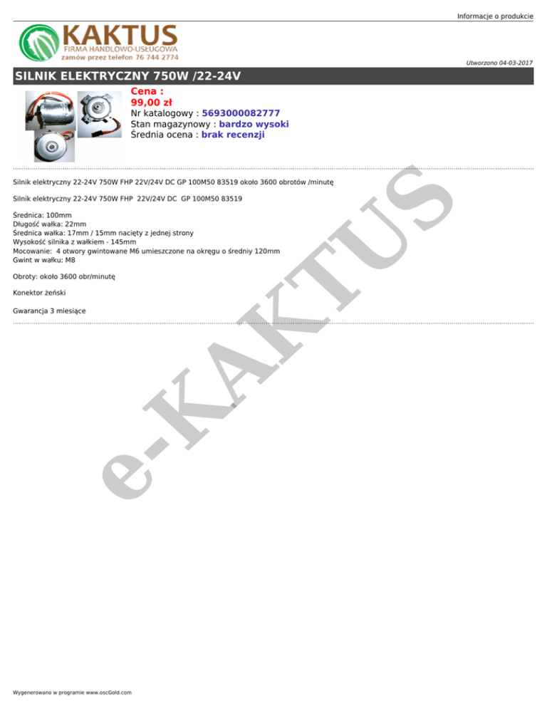 Informacje o produkcie Utworzono 04-03-2017 SILNIK ELEKTRYCZNY 750W /22-24V Cena : 99,00 zł Nr katalogowy : 5693000082777 Stan magazynowy : bardzo wysoki Średnia ocena : brak recenzji Silnik elektryczny 22-24V 750W FHP 22V/24V DC GP 100M50 83519 Obroty: około 3600 obr/minutę Konektor żeński eK Gwarancja 3 miesiące AK TU Średnica: 100mm Długość wałka: 22mm Średnica wałka: 17mm / 15mm nacięty z jednej strony Wysokość silnika z wałkiem - 145mm Mocowanie: 4 otwory gwintowane M6 umieszczone na okręgu o średniy 120mm Gwint w wałku: M8 Wygenerowano w programie www.oscGold.com S Silnik elektryczny 22-24V 750W FHP 22V/24V DC GP 100M50 83519 około 3600 obrotów /minutę
