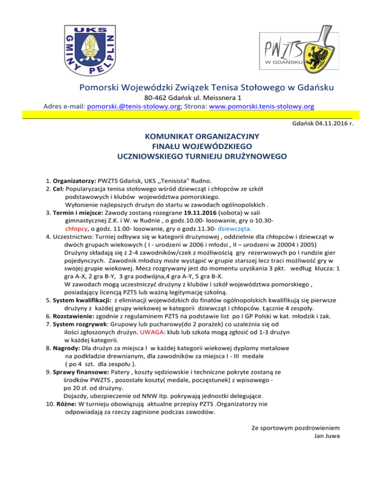 Pomorski Wojewódzki Związek Tenisa Stołowego w Gdańsku 80-‐462 Gdańsk ul. Meissnera 1 Adres e-‐mail: pomorski.@tenis-‐stolowy.org; Strona: www.pomorski.tenis-‐stolowy.org _____________________________________________________________________________________ Gdańsk 04.11.2016 r. KOMUNIKAT ORGANIZACYJNY FINAŁU WOJEWÓDZKIEGO UCZNIOWSKIEGO TURNIEJU DRUŻYNOWEGO 1. Organizatorzy: PWZTS Gdańsk, UKS ,,Tenisista” Rudno. 2. Cel: Popularyzacja tenisa stołowego wśród dziewcząt i chłopców ze szkół podstawowych i klubów województwa pomorskiego. Wyłonienie najlepszych drużyn do startu w zawodach ogólnopolskich . 3. Termin i miejsce: Zawody zostaną rozegrane 19.11.2016 (sobota) w sali gimnastycznej Z.K. i W. w Rudnie , o godz.10.00-‐ losowanie, gry o 10.30-‐ chłopcy, o godz. 11.00-‐ losowanie, gry o godz.11.30-‐ dziewczęta. 4. Uczestnictwo: Turniej odbywa się w kategorii drużynowej , oddzielnie dla chłopców i dziewcząt w dwóch grupach wiekowych ( I -‐ urodzeni w 2006 i młodsi , II – urodzeni w 20004 i 2005) Drużyny składają się z 2-‐4 zawodników/czek z możliwością gry rezerwowych po I rundzie gier pojedynczych. Zawodnik młodszy może wystąpić w grupie starszej lecz traci możliwość gry w swojej grupie wiekowej. Mecz rozgrywany jest do momentu uzyskania 3 pkt. według klucza: 1 gra A-‐X, 2 gra B-‐Y, 3 gra podwójna,4 gra A-‐Y, 5 gra B-‐X. W zawodach mogą uczestniczyć drużyny z klubów i szkół województwa pomorskiego , posiadający licencją PZTS lub ważną legitymację szkolną. 5. System kwalifikacji: z eliminacji wojewódzkich do finałów ogólnopolskich kwalifikują się pierwsze drużyny z każdej grupy wiekowej w kategorii dziewcząt i chłopców. Łącznie 4 zespoły. 6. Rozstawienie: zgodnie z regulaminem PZTS na podstawie list po I GP Polski w kat. młodzik i żak. 7. System rozgrywek: Grupowy lub pucharowy(do 2 porażek) co uzależnia się od ilości zgłoszonych drużyn. UWAGA: klub lub szkoła mogą zgłosić od 1-‐3 drużyn w każdej kategorii. 8. Nagrody: Dla drużyn za miejsca I w każdej kategorii wiekowej dyplomy metalowe na podkładzie drewnianym, dla zawodników za miejsca I -‐ III medale ( po 4 szt. dla zespołu ). 9. Sprawy finansowe: Patery , koszty sędziowskie i techniczne pokryte zostaną ze środków PWZTS , pozostałe koszty( medale, poczęstunek) z wpisowego -‐ po 20 zł. od drużyny. Dojazdy, ubezpieczenie od NNW itp. pokrywają jednostki delegujące. 10. Różne: W turnieju obowiązują aktualne przepisy PZTS .Organizatorzy nie odpowiadają za rzeczy zaginione podczas zawodów. Ze sportowym pozdrowieniem Jan Juwa