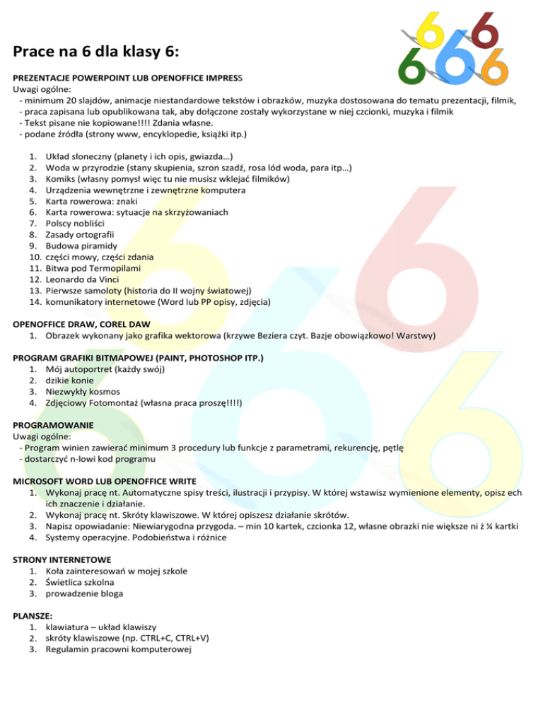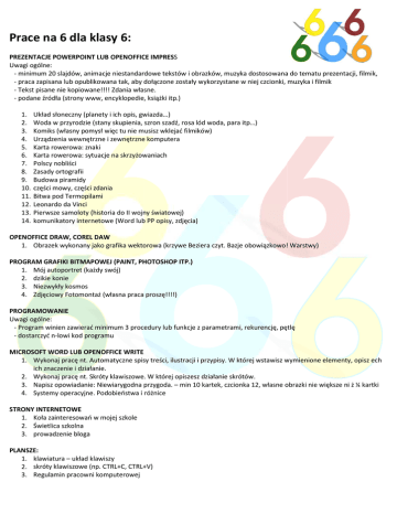 Prace na 6 dla klasy 6: PREZENTACJE POWERPOINT LUB OPENOFFICE IMPRESS IMPRES Uwagi ogólne: - minimum 20 slajdów, animacje niestandardowe tekstów i obrazków, muzyka dostosowana do tematu prezentacji, filmik, - praca zapisana lub opublikowana tak, aby dołączone zostały wykorzystane w niej czcionki, muzyka i filmik - Tekst pisane nie kopiowane!!!! Zdania własne. - podane źródła (strony www, encyklopedie, książki itp.) 1. 2. 3. 4. 5. 6. 7. 8. 9. 10. 11. 12. 13. 14. Układ słoneczny (planety i ich opis, gwiazda…) Woda w przyrodzie (stany skupienia, szron szadź, rosa lód woda, para itp…) Komiks (własny pomysł więc tu nie musisz wklejać filmików) Urządzenia rządzenia wewnętrzne i zewnętrzne komputera Karta rowerowa: znaki Karta rowerowa: sytuacje na skrzyżowaniach Polscy nobliści Zasady ortografii Budowa piramidy części mowy, części zdania Bitwa pod Termopilami Leonardo da Vinci Pierwsze samoloty (historia do II wojny światowej) komunikatory internetowe (Word lub PP opisy, zdjęcia) OPENOFFICE DRAW, COREL DAW 1. Obrazek wykonany jako grafika wektorowa (krzywe Beziera czyt. Bazje obowiązkowo! Warstwy) PROGRAM GRAFIKI BITMAPOWEJ (PAINT, PHOTOSHOP ITP.) ITP. 1. Mój autoportret (każdy swój) 2. dzikie konie 3. Niezwykły kosmos 4. Zdjęciowy Fotomontaż (własna praca proszę!!!!) PROGRAMOWANIE Uwagi ogólne: - Program winien zawierać minimum 3 procedury lub funkcje z parametrami, rekurencję, pętlę - dostarczyć n-lowi kod programu MICROSOFT WORD LUB OPENOFFICE WRITE 1. Wykonaj pracę nt. Automatyczne spisy treści, ilustracji i przypisy. W której wstawisz wymienione elementy, opisz ech ich znaczenie i działanie. 2. Wykonaj pracę nt. Skróty klawiszowe. W której opiszesz działanie skrótów. 3. Napisz opowiadanie: Niewiarygodna przygoda. – min 10 kartek, czcionka 12, własne obrazki nie większe ni ż ¼ kartki 4. Systemy operacyjne. Podobieństwa i różnice STRONY INTERNETOWE 1. Koła zainteresowań w mojej szkole 2. Świetlica szkolna 3. prowadzenie bloga PLANSZE: 1. klawiatura – układ klawiszy 2. skróty klawiszowe (np. CTRL+C, CTRL+V) 3. Regulamin pracowni komputerowej