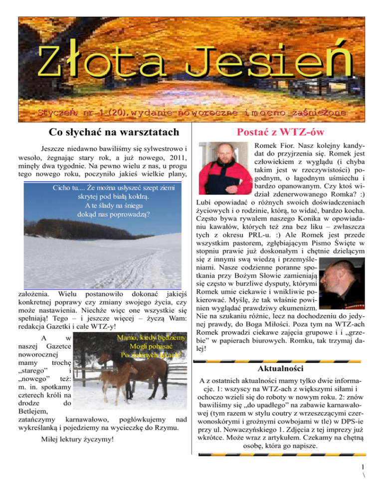 Złota Jesień Styczeń, nr 1 (20),wydanie no woroczne i m ocno zaśnieżone Co słychać na warsztatach Jeszcze niedawno bawiliśmy się sylwestrowo i wesoło, żegnając stary rok, a już nowego, 2011, minęły dwa tygodnie. Na pewno wielu z nas, u progu tego nowego roku, poczyniło jakieś wielkie plany, Cicho tu.... Że można usłyszeć szept ziemi skrytej pod białą kołdrą. A te ślady na śniegu dokąd nas poprowadzą? założenia. Wielu postanowiło dokonać jakiejś konkretnej poprawy czy zmiany swojego życia, czy może nastawienia. Niechże więc one wszystkie się spełniają! Tego – i jeszcze więcej – życzą Wam: redakcja Gazetki i całe WTZ-y! Mamo, kiedy będziemy A w naszej Gazetce Mogli pohasać noworocznej Po zielonych łąkach? mamy trochę „starego” i „nowego” też: m. in. spotkamy czterech króli na drodze do Betlejem, zatańczymy karnawałowo, pogłówkujemy nad wykreślanką i pojedziemy na wycieczkę do Rzymu. Miłej lektury życzymy! Postać z WTZ-ów Romek Fior. Nasz kolejny kandydat do przyjrzenia się. Romek jest człowiekiem z wyglądu (i chyba takim jest w rzeczywistości) pogodnym, o łagodnym uśmiechu i bardzo opanowanym. Czy ktoś widział zdenerwowanego Romka? :) Lubi opowiadać o różnych swoich doświadczeniach życiowych i o rodzinie, którą, to widać, bardzo kocha. Często bywa rywalem naszego Konika w opowiadaniu kawałów, których też zna bez liku – zwłaszcza tych z okresu PRL-u. :) Ale Romek jest przede wszystkim pastorem, zgłębiającym Pismo Święte w stopniu prawie już doskonałym i chętnie dzielącym się z innymi swą wiedzą i przemyśleniami. Nasze codzienne poranne spotkania przy Bożym Słowie zamieniają się często w burzliwe dysputy, którymi Romek umie ciekawie i wnikliwie pokierować. Myślę, że tak właśnie powinien wyglądać prawdziwy ekumenizm. Nie na szukaniu różnic, lecz na dochodzeniu do jedynej prawdy, do Boga Miłości. Poza tym na WTZ-ach Romek prowadzi ciekawe zajęcia grupowe i i „grzebie” w papierach biurowych. Romku, tak trzymaj dalej! Aktualności A z ostatnich aktualności mamy tylko dwie informacje. 1: wszyscy na WTZ-ach z większymi siłami i ochoczo wzieli się do roboty w nowym roku. 2: znów bawiliśmy się „do upadłego” na zabawie karnawałowej (tym razem w stylu coutry z wrzeszczącymi czerwonoskórymi i groźnymi cowbojami w tle) w DPS-ie przy ul. Nowaczyńskiego 1. Zdjęcia z tej imprezy już wkrótce. Może wraz z artykułem. Czekamy na chętną osobę, która go napisze. 1 \ Mały Kącik Turystyczny RZYM Rzym to ważny punkt Europy. Założony aż 800 lat p..n. e. Kwitnie do dziś. Jest stolicą Włoch i liczy ponad trzy miliony mieszkańców. Położony nad Tybrem Rzym przewał wiele wojen i najazdów to po prostu wieczne miasto! Jest też żywą historią starego kontynentu, dawnym imperium, w którym kwitnie sztuka, literatura, architektura. W środku Rzymu leży Watykan – terytorium kościelne. Tzw. państwo w państwie. Dla każdego polaka, który dumny jest z tego, że nasz rodak Jan Paweł II był papieżem, najważniejszym punktem wycieczki będzie Watykan. Państwo kościelne, założone zostało 11 lutego1929 roku. Obejmuje teren Ager Vaticanum i mieści się na prawym brzegu rzeki. To tu umierali piersi chrześcijanie. Do Watykanu należy również Bazylika Świętego Piotra, z której transmitowane są msze św. Tu znajduje się najważniejsze istniejące centrum architektoniczne - Pałace Watykańskie. Każdy chce tu wrócić. Inne,warte polecenia miejsce to Fontana di Trevi 20m szerokości i 26 wysokości. Turyści wrzucają tu pieniądze, bo istnieje przesąd,że dzięki temu wrócą do Rzymu. Jednym z najciekawszych zabytków europejskich jest Koloseum amfiteatr, założony w latach 80. p. n. e. Odbyły się tu ostatnie igrzyska i walki gladiatorów. Przygotowała Małgorzata Zawisza Trzej królowie Nie wiadomo o nich nic, a mimo to są znani wszystkim. Zagadkowe postacie mędrców ze Wschodu, którzy złożyli hołd Jezusowi, były przez stulecia przedmiotem rozważań teologów i inspiracją wyobraźni artystów. Wspomina o nich tylko Ewangelia wg św. Mateusza. Ewangelista nie podaje ich imion, ani nawet liczby. Nie pisze też skąd konkretnie przybyli, tylko, że ze Wschodu. Wiadomo też, że kierowali się „gwiazdą”, jak to nazywa Ewangelista. To astronomiczne zjawisko pojawiło się niespodziewanie na niebie i zwróciło ich uwagę. W ciągu stuleci istniało wiele hipotez próbujących dokładnie określić o jaką gwiazdę chodzi. Sądzono na przykład, że mogła to być planeta Wenus, jasno świecąca nad horyzontem. Planeta Wenus była jednak doskonale znana w tamtych czasach i wydaje się niemożliwe, by zadziwiła swym pojawieniem się trzech mędrców, którzy niewątpliwie byli dobrymi astronomami. Ich święto ustanowiono w Kościele w wieku V. Św. Mateusz nie określił ilu magów przybyło do Jezusa. Na rysunkach w rzymskich katakumbach, w pierwszych wiekach chrześcijaństwa, aż do IV w., przedstawiano ich dwóch, trzech, czterech lub sześciu. W Syrii i Armenii przyjęła się wówczas tradycja, że było ich dwunastu, co miało symbolizować dwunastu Apostołów i dwanaście plemion Izraela. Z kolei Kościół koptyjski w Egipcie uznał, że było ich aż sześćdziesięciu. Liczba „trzy” pojawiła się u Orygenesa (najsławniejszego i najbardziej 2 \ wpływowego filozofa i teologa chrześcijańskiego Wschodu). Stwierdził on, że skoro były trzy dary, to tylu musiało być również wręczających je. W wieku IV ten pogląd stopniowo wszędzie został przyjęty. Trzy znane nam dziś imiona królów: Kacper, Melchior, Baltazar, pojawiły się po raz pierwszy ok. roku 520 na mozaice zdobiącej kościół San Apollinare Nuovo w Rawennie, która wówczas była stolicą posiadłości bizantyńskich w Italii. Nad postaciami umieszczono tam wyraźne napisy: Balthassar, Melchior, Gaspar". Tylko jedno nie ulega wątpliwo