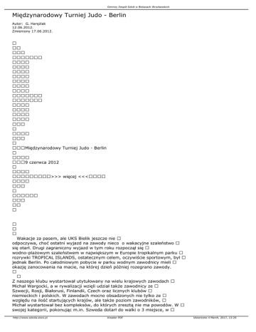 Gminny Zespół Szkół w Bielanach Wrocławskich Międzynarodowy Turniej Judo - Berlin Autor: G. Harężlak 12.06.2012. Zmieniony 17.06.2012. Międzynarodowy Turniej Judo - Berlin 9 czerwca 2012 >>> więcej <<< Wakacje za pasem, ale UKS Bielik jeszcze nie odpoczywa, choć ostatni wyjazd na zawody nieco o wakacyjne szaleństwo się otarł. Drugi zagraniczny wyjazd w tym roku rozpoczął się wodno-plażowym szaleństwem w największym w Europie tropikalnym parku rozrywki TROPICAL ISLANDS, ostatecznym celem, oczywiście sportowym, był jednak Berlin. Po całodniowym pobycie w parku wodnym zawodnicy mieli okazję zanocowania na macie, na której dzień później rozegrano zawody. Z naszego klubu wystartował utytułowany na wielu krajowych zawodach Michał Wargocki, a w rywalizacji wzięli udział także zawodnicy ze Szwecji, Rosji, Białorusi, Finlandii, Czech oraz licznych klubów niemieckich i polskich. W zawodach mocno obsadzonych nie tylko ze względu na ilość startujących krajów, ale także poziom zawodników, Michał wystartował bez kompleksów, do których zresztą nie ma powodów. W swojej kategorii, pokonując m.in. Szweda dotarł do walki o 3 miejsce, w http://www.szkola.sisco.pl Kreator PDF Utworzono 4 March, 2017, 13:29 Gminny Zespół Szkół w Bielanach Wrocławskich której przez dłuższy czas prowadził. I choć chwila nieuwagi i zakończenie walki przez zawodnika z Niemiec przed czasem, uplasowała Michała ostatecznie na 5 miejscu, to był to niewątpliwie start, który Michał może zaliczyć do udanych, a zdobyte doświadczenie dopisać do tych, które z pewnością zaowocują w przyszłości. Niesamowita atmosfera zawodów i niecodzienne przeżycia skupione wokół spraw nie tylko związanych z matą zapadną w pamięć nie tylko młodym adeptom sztuk walki. Na zakończenie bardzo udanego sezonu zawodników Bielika czeka jeszcze start w Strzegomiu już w najbliższą sobotę. Trzymamy kciuki. Link do strony z fotorelacją http://uksbielikjudo.dbv.pl/readarticle.php?article_id=27 Trener Grzegorz Harężlak http://www.szkola.sisco.pl Kreator PDF Utworzono 4 March, 2017, 13:29