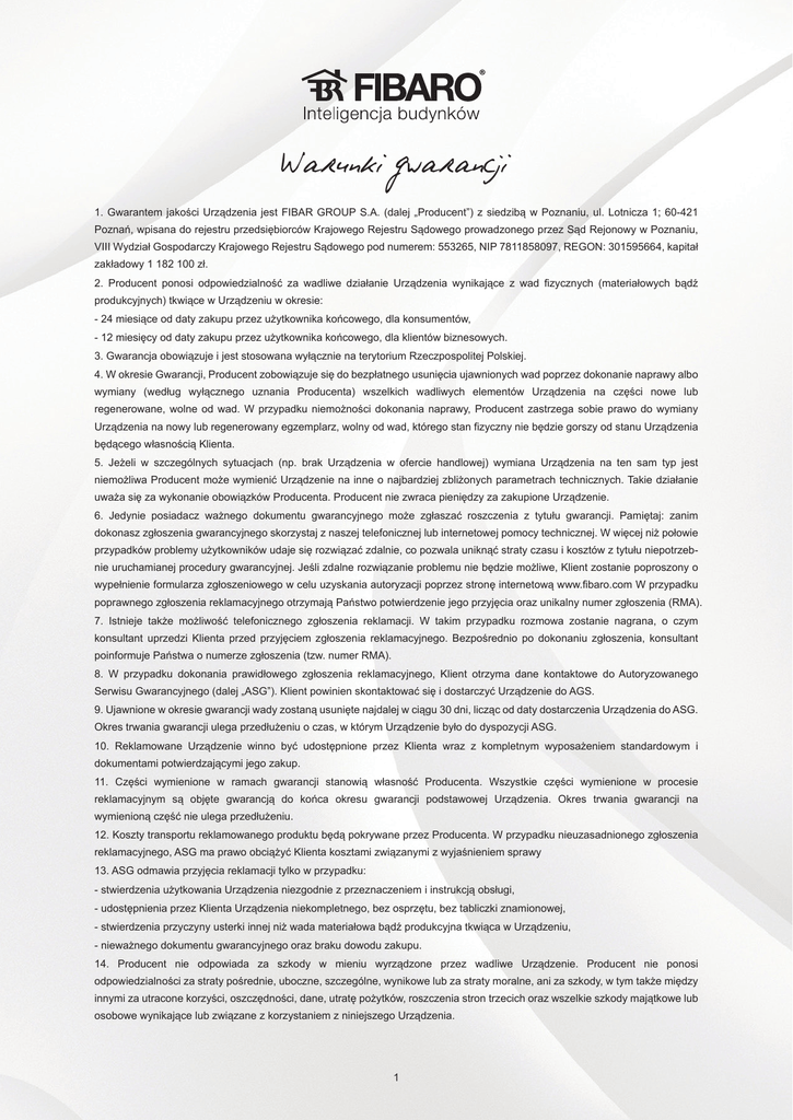 Warunki gwarancji 1. Gwarantem jakości Urządzenia jest FIBAR GROUP S.A. (dalej „Producent”) z siedzibą w Poznaniu, ul. Lotnicza 1; 60-421 Poznań, wpisana do rejestru przedsiębiorców Krajowego Rejestru Sądowego prowadzonego przez Sąd Rejonowy w Poznaniu, VIII Wydział Gospodarczy Krajowego Rejestru Sądowego pod numerem: 553265, NIP 7811858097, REGON: 301595664, kapitał zakładowy 1 182 100 zł. 2. Producent ponosi odpowiedzialność za wadliwe działanie Urządzenia wynikające z wad fizycznych (materiałowych bądź produkcyjnych) tkwiące w Urządzeniu w okresie: - 24 miesiące od daty zakupu przez użytkownika końcowego, dla konsumentów, - 12 miesięcy od daty zakupu przez użytkownika końcowego, dla klientów biznesowych. 3. Gwarancja obowiązuje i jest stosowana wyłącznie na terytorium Rzeczpospolitej Polskiej. 4. W okresie Gwarancji, Producent zobowiązuje się do bezpłatnego usunięcia ujawnionych wad poprzez dokonanie naprawy albo wymiany (według wyłącznego uznania Producenta) wszelkich wadliwych elementów Urządzenia na części nowe lub regenerowane, wolne od wad. W przypadku niemożności dokonania naprawy, Producent zastrzega sobie prawo do wymiany Urządzenia na nowy lub regenerowany egzemplarz, wolny od wad, którego stan fizyczny nie będzie gorszy od stanu Urządzenia będącego własnością Klienta. 5. Jeżeli w szczególnych sytuacjach (np. brak Urządzenia w ofercie handlowej) wymiana Urządzenia na ten sam typ jest niemożliwa Producent może wymienić Urządzenie na inne o najbardziej zbliżonych parametrach technicznych. Takie działanie uważa się za wykonanie obowiązków Producenta. Producent nie zwraca pieniędzy za zakupione Urządzenie. 6. Jedynie posiadacz ważnego dokumentu gwarancyjnego może zgłaszać roszczenia z tytułu gwarancji. Pamiętaj: zanim dokonasz zgłoszenia gwarancyjnego skorzystaj z naszej telefonicznej lub internetowej pomocy technicznej. W więcej niż połowie przypadków problemy użytkowników udaje się rozwiązać zdalnie, co pozwala uniknąć straty czasu i kosztów z tytułu niepotrzebnie uruchamianej procedury gwarancyjnej. Jeśli zdalne rozwiązanie problemu nie będzie możliwe, Klient zostanie poproszony o wypełnienie formularza zgłoszeniowego w celu uzyskania autoryzacji poprzez stronę internetową www.fibaro.com W przypadku poprawnego zgłoszenia reklamacyjnego otrzymają Państwo potwierdzenie jego przyjęcia oraz unikalny numer zgłoszenia (RMA). 7. Istnieje także możliwość telefonicznego zgłoszenia reklamacji. W takim przypadku rozmowa zostanie nagrana, o czym konsultant uprzedzi Klienta przed przyjęciem zgłoszenia reklamacyjnego. Bezpośrednio po dokonaniu zgłoszenia, konsultant poinformuje Państwa o numerze zgłoszenia (tzw. numer RMA). 8. W przypadku dokonania prawidłowego zgłoszenia reklamacyjnego, Klient otrzyma dane kontaktowe do Autoryzowanego Serwisu Gwarancyjnego (dalej „ASG”). Klient powinien skontaktować się i dostarczyć Urządzenie do AGS. 9. Ujawnione w okresie gwarancji wady zostaną usunięte najdalej w ciągu 30 dni, licząc od daty dostarczenia Urządzenia do ASG. Okres trwania gwarancji ulega przedłużeniu o czas, w którym Urządzenie było do dyspozycji ASG. 10. Reklamowane Urządzenie winno być udostępnione przez Klienta wraz z kompletnym wyposażeniem standardowym i dokumentami potwierdzającymi jego zakup. 11. Części wymienione w ramach gwarancji stanowią własność Producenta. Wszystkie części wymienione w procesie reklamacyjnym są objęte gwarancją do końca okresu gwarancji podstawowej Urządzenia. Okres trwania gwarancji na wymienioną część nie ulega przedłużeniu. 12. Koszty transportu reklamowanego produktu będą pokrywane przez Producenta. W przypadku nieuzasadnionego zgłoszenia reklamacyjnego, ASG ma prawo obciążyć Klienta kosztami związanymi z wyjaśnieniem sprawy 13. ASG odmawia przyjęcia reklamacji tylko w przypadku: - stwierdzenia użytkowania Urządzenia niezgodnie z przeznaczeniem i instrukcją obsługi, - udostępnienia przez Klienta Urządzenia niekompletnego, bez osprzętu, bez tabliczki znamionowej, - stwierdzenia przyczyny usterki innej niż wada materiałowa bądź produkcyjna tkwiąca w Urządzeniu, - nieważnego dokumentu gwarancyjnego oraz braku dowodu zakupu. 14. Producent nie odpowiada za szkody w mieniu wyrządzone przez wadliwe Urządzenie. Producent nie ponosi odpowiedzialności za straty pośrednie, uboczne, szczególne, wynikowe lub za straty moralne, ani za szkody, w tym także między innymi za utracone korzyści, oszczędności, dane, utratę pożytków, roszczenia stron trzecich oraz wszelkie szkody majątkowe lub osobowe wynikające lub związane z korzystaniem z niniejszego Urządzenia. 1 15. Gwarancja jakości nie obejmuje: - uszkodzeń mechanicznych (pęknięcia, złamania, przecięcia, przetarcia, fizyczne odkształcenia spowodowane uderzeniem, upadkiem bądź zrzuceniem na Urządzenie innego przedmiotu lub eksploatacją niezgodną z przeznaczeniem Urządzenia określonym w instrukcji obsługi); - uszkodzeń wynikłych z przyczyn zewnętrznych np.: powodzi, burzy, pożaru, uderzenia pioruna, klęsk żywiołowych, trzęsienia ziemi, wojny, niepokojów społecznych, siły wyższej, nieprzewidzianych wypadków, kradzieży, zalania cieczą, wycieku baterii, warunków pogodowych; działania promieni słonecznych, piasku, wilgoci, wysokiej lub niskiej temperatury, zanieczyszczenia powietrza; - uszkodzeń spowodowanych przez nieprawidłowo działające oprogramowanie, na skutek ataku wirusa komputerowego, bądź nie stosowanie aktualizacji oprogramowania zgodnie z zaleceniami Producenta; - uszkodzeń wynikłych z: przepięć w sieci energetycznej lub/i telekomunikacyjnej lub z podłączenia do sieci energetycznej w sposób niezgodny z instrukcją obsługi lub z powodu przyłączenia innych produktów, których podłączanie nie jest zalecane przez Producenta. - uszkodzeń wywołanych pracą bądź skł