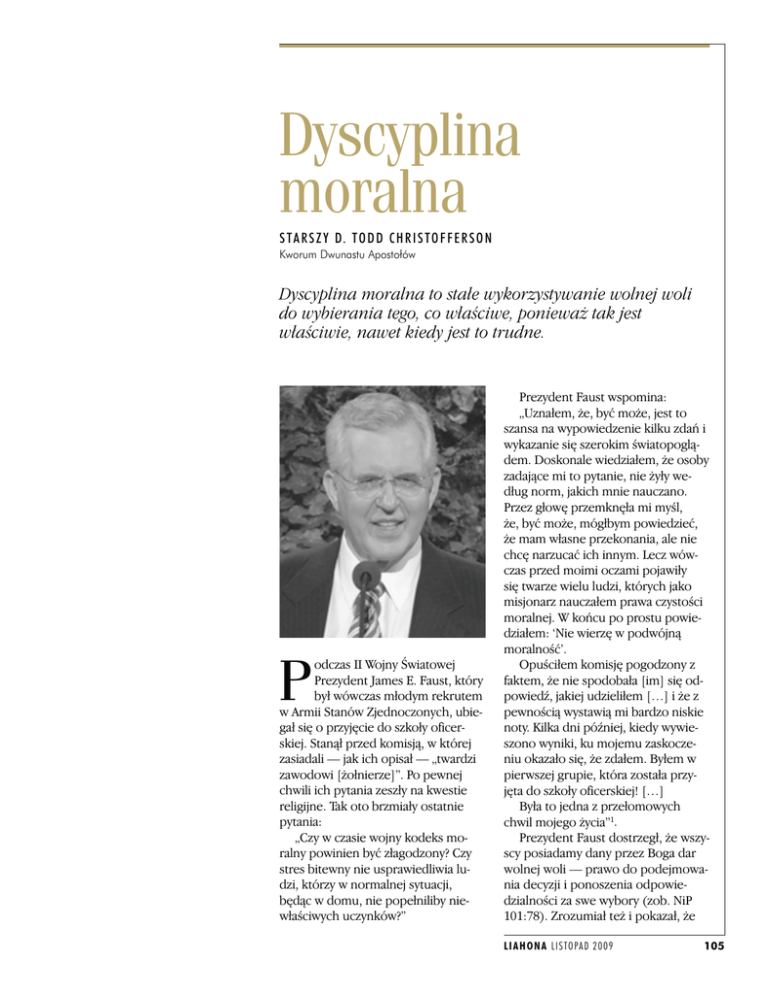 Dyscyplina moralna S TA R S Z Y D. TO D D C H R I S TO F F E R S O N Kworum Dwunastu Aposto∏ów Dyscyplina moralna to sta∏e wykorzystywanie wolnej woli do wybierania tego, co w∏aÊciwe, poniewa˝ tak jest w∏aÊciwie, nawet kiedy jest to trudne. P odczas II Wojny Âwiatowej Prezydent James E. Faust, który by∏ wówczas m∏odym rekrutem w Armii Stanów Zjednoczonych, ubiega∏ si´ o przyj´cie do szko∏y oficerskiej. Stanà∏ przed komisjà, w której zasiadali — jak ich opisa∏ — „twardzi zawodowi [˝o∏nierze]”. Po pewnej chwili ich pytania zesz∏y na kwestie religijne. Tak oto brzmia∏y ostatnie pytania: „Czy w czasie wojny kodeks moralny powinien byç z∏agodzony? Czy stres bitewny nie usprawiedliwia ludzi, którzy w normalnej sytuacji, b´dàc w domu, nie pope∏niliby niew∏aÊciwych uczynków?” Prezydent Faust wspomina: „Uzna∏em, ˝e, byç mo˝e, jest to szansa na wypowiedzenie kilku zdaƒ i wykazanie si´ szerokim Êwiatopoglàdem. Doskonale wiedzia∏em, ˝e osoby zadajàce mi to pytanie, nie ˝y∏y wed∏ug norm, jakich mnie nauczano. Przez g∏ow´ przemkn´∏a mi myÊl, ˝e, byç mo˝e, móg∏bym powiedzieç, ˝e mam w∏asne przekonania, ale nie chc´ narzucaç ich innym. Lecz wówczas przed moimi oczami pojawi∏y si´ twarze wielu ludzi, których jako misjonarz naucza∏em prawa czystoÊci moralnej. W koƒcu po prostu powiedzia∏em: ‘Nie wierz´ w podwójnà moralnoÊç’. OpuÊci∏em komisj´ pogodzony z faktem, ˝e nie spodoba∏a [im] si´ odpowiedê, jakiej udzieli∏em […] i ˝e z pewnoÊcià wystawià mi bardzo niskie noty. Kilka dni póêniej, kiedy wywieszono wyniki, ku mojemu zaskoczeniu okaza∏o si´, ˝e zda∏em. By∏em w pierwszej grupie, która zosta∏a przyj´ta do szko∏y oficerskiej! […] By∏a to jedna z prze∏omowych chwil mojego ˝ycia”1. Prezydent Faust dostrzeg∏, ˝e wszyscy posiadamy dany przez Boga dar wolnej woli — prawo do podejmowania decyzji i ponoszenia odpowiedzialnoÊci za swe wybory (zob. NiP 101:78). Zrozumia∏ te˝ i pokaza∏, ˝e L I A H O N A LISTOPAD 2009 105 aby osiàgnàç pozytywny rezultat, moralnej wolnej woli musi towarzyszyç moralna dyscyplina. Pod terminem „dyscyplina moralna” rozumiem samodyscyplin´ opartà na normach moralnych. Dyscyplina moralna to sta∏e wykorzystywanie wolnej woli do wybierania tego, co w∏aÊciwe, poniewa˝ tak jest w∏aÊciwie, nawet kiedy jest to trudne. To odrzucanie egocentrycznego ˝ycia na korzyÊç rozwijania charakteru godnego szacunku i prawdziwej 106 wielkoÊci, jakà si´ osiàga dzi´ki s∏u˝bie Chrystusowej (zob. Ew. Marka 10:42–45). Angielskie s∏owo dyscyplina ma ten sam rdzeƒ, co s∏owo disciple, czyli „uczeƒ”, co sugeruje, ˝e zgodnoÊç przyk∏adu i nauk Jezusa Chrystusa stanowi idealnà dyscyplin´, która, po∏àczona z Jego ∏askà, tworzy cnotliwego i moralnie znakomitego cz∏owieka. Moralna dyscyplina Jezusa zakorzeniona by∏a w Jego podporzàdkowaniu si´ Ojcu. WyjaÊni∏ Swoim uczniom: „Moim pokarmem jest pe∏niç wol´ tego, który mnie pos∏a∏, i dokonaç jego dzie∏a” (Ew. Jana 4:34). W ten sam sposób nasza dyscyplina moralna zakorzeniona jest w lojalnoÊci i oddaniu Ojcu i Synowi. To ewangelia Jezusa Chrystusa stanowi moralnà pewnoÊç, na której opiera si´ dyscyplina moralna. Spo∏eczeƒstwa, w których ˝yje wielu z nas, majà wi´cej ni˝ jedno pokolenie, któremu nie zaszczepiono dyscypliny moralnej. Nauczajà, ˝e prawda jest wzgl´dna i ˝e ka˝dy decyduje sam na w∏asne potrzeby, co jest w∏aÊciwe. Takie poj´cia, jak grzech czy z∏o zosta∏y pot´pione jako „osàdy wartoÊciujàce”. Jak opisuje to Pan, „ka˝dy cz∏owiek podà˝a w∏asnà drogà i za obrazem swego w∏asnego boga” (NiP 1:16). W konsekwencji, samodyscyplina zaczyna erodowaç, a spo∏eczeƒstwa sà zmuszone do podejmowania prób zaprowadzania porzàdku i ∏adu. Brak wewn´trznej kontroli ze strony obywateli rodzi zewn´trznà potrzeb´ kontroli ze strony paƒstwa. Pewien dziennikarz zauwa˝y∏, ˝e „d˝entelmeƒskie zachowanie [kiedyÊ, na przyk∏ad] chroni∏o kobiety przed ordynarnym zachowaniem. Dzisiaj oczekujemy, ˝e regulacje prawne dotyczàce napastowania seksualnego powstrzymajà ordynarne zachowanie. […] Policjanci i prawo nigdy nie zastàpià nawyków, tradycji i wartoÊci moralnych jako Êrodków regulujàcych ludzkie zachowanie. W najlepszym razie policja i system sàdownictwa karnego sà ostatnià rozpaczliwà linià obrony dla cywilizowanego spo∏eczeƒstwa. Wzrost naszego zaufania do praw, które majà regulowaç nasze zachowanie, jest miarà tego, na ile jesteÊmy cywilizowani”2. Na przewa˝ajàcych obszarach Êwiata doÊwiadczamy przed∏u˝ajàcej si´ i niszczàcej recesji ekonomicznej. Przyczyny tego sà wielorakie, lecz jednà z g∏ównych by∏a powszechna nieuczciwoÊç i nieetyczne zachowanie, szczególnie na rynku mieszkaniowym i finansowym w USA. Reakcje skoncentrowa∏y si´ na wprowadzaniu coraz wi´kszych i silniejszych regulacji. Byç mo˝e odwiedzie to niektórych od zachowania pozbawionego skrupu∏ów, lecz inni po prostu stanà si´ bardziej pomys∏owi w swych podst´pach3. Byç mo˝e, nigdy nie b´dzie wystarczajàcej liczby zasad tak precyzyjnie przemyÊlanych, by przewidzieç ka˝dà sytuacj´ i zabezpieczyç si´ przed nià, a jeÊli nawet by∏oby to mo˝liwe, egzekwowanie ich by∏oby prawdopodobnie kosztowne i ucià˝liwe. Takie podejÊcie prowadzi do ograniczenia wolnoÊci jednostki. Jak to wyrazi∏ w pami´tnej wypowiedzi Biskup Fulton J. Sheen: „Nie przyj´liÊmy jarzma Chrystusa, wi´c teraz musimy dr˝eç pod jarzmem cesarza”4. W koƒcu jest to jedyny wewn´trzny kompas moralny znajdujàcy si´ w ka˝dym cz∏owieku, który mo˝e skutecznie poradziç sobie zarówno z korzeniami, jak i symptomami upadku spo∏ecznego. Spo∏eczeƒstwa na pró˝no b´dà ustanawiaç podstawy wspólnego dobra, jeÊli grzech nie b´dzie nazwany grzech