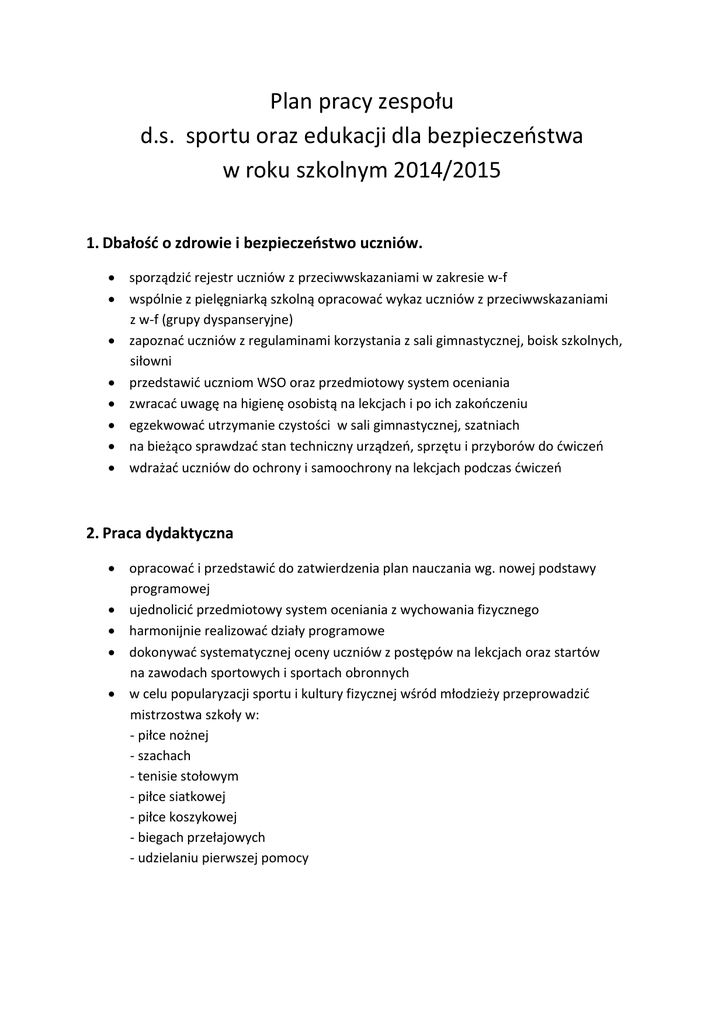 Plan pracy zespołu d.s. sportu oraz edukacji dla bezpieczeństwa w