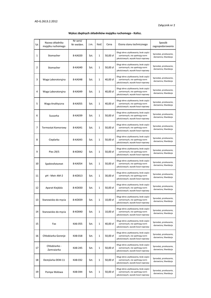 AD-G.2613.2.2012 Załącznik nr 2 Wykaz zbędnych składników majątku ruchomego - Kalisz. Nr serii/ Nr ewiden. J.m. Ilość Cena Ocena stanu technicznego Sposób zagospodarowania Stomacher 8-KA020 Szt. 1 50,00 zł Długi okres użytkowania, brak części zamiennych, nie spełniają norm jakościowych, wysoki koszt naprawy Sprzedaż, przekazanie, darowizna, likwidacja 2 Stomacher 8-KA040 Szt. 1 50,00 zł Długi okres użytkowania, brak części zamiennych, nie spełniają norm jakościowych, wysoki koszt naprawy Sprzedaż, przekazanie, darowizna, likwidacja 3 Waga Laboratoryjna 8-KA048 Szt. 1 40,00 zł Długi okres użytkowania, brak części zamiennych, nie spełniają norm jakościowych, wysoki koszt naprawy Sprzedaż, przekazanie, darowizna, likwidacja 4 Waga Laboratoryjna 8-KA049 Szt. 1 40,00 zł Długi okres użytkowania, brak części zamiennych, nie spełniają norm jakościowych, wysoki koszt naprawy Sprzedaż, przekazanie, darowizna, likwidacja 5 Waga Analityczna 8-KA055 Szt. 1 40,00 zł Długi okres użytkowania, brak części zamiennych, nie spełniają norm jakościowych, wysoki koszt naprawy Sprzedaż, przekazanie, darowizna, likwidacja 6 Suszarka 8-KA039 Szt. 1 50,00 zł Długi okres użytkowania, brak części zamiennych, nie spełniają norm jakościowych, wysoki koszt naprawy Sprzedaż, przekazanie, darowizna, likwidacja 7 Termostat Komorowy 8-KA041 Szt. 1 50,00 zł Długi okres użytkowania, brak części zamiennych, nie spełniają norm jakościowych, wysoki koszt naprawy Sprzedaż, przekazanie, darowizna, likwidacja 8 Cieplarka 8-KA043 Szt. 1 50,00 zł Długi okres użytkowania, brak części zamiennych, nie spełniają norm jakościowych, wysoki koszt naprawy Sprzedaż, przekazanie, darowizna, likwidacja 9 Piec 29/S 8-KO042 Szt. 1 50,00 zł Długi okres użytkowania, brak części zamiennych, nie spełniają norm jakościowych, wysoki koszt naprawy Sprzedaż, przekazanie, darowizna, likwidacja 10 Spektrofotomet 8-KA054 Szt. 1 50,00 zł Długi okres użytkowania, brak części zamiennych, nie spełniają norm jakościowych, wysoki koszt naprawy Sprzedaż, przekazanie, darowizna, likwidacja 11 pH - Metr AM-2 8-KO013 Szt. 1 30,00 zł Długi okres użytkowania, brak części zamiennych, nie spełniają norm jakościowych, wysoki koszt naprawy Sprzedaż, przekazanie, darowizna, likwidacja 12 Aparat Kiejdala 8-KO030 Szt. 1 50,00 zł Długi okres użytkowania, brak części zamiennych, nie spełniają norm jakościowych, wysoki koszt naprawy Sprzedaż, przekazanie, darowizna, likwidacja 13 Stanowisko do mycia 8-KO039 Szt. 1 10,00 zł Długi okres użytkowania, brak części zamiennych, nie spełniają norm jakościowych, wysoki koszt naprawy Sprzedaż, przekazanie, darowizna, likwidacja 14 Stanowisko do mycia 8-KO040 Szt. 1 10,00 zł Długi okres użytkowania, brak części zamiennych, nie spełniają norm jakościowych, wysoki koszt naprawy Sprzedaż, przekazanie, darowizna, likwidacja 15 Fax KA6-055 Szt. 1 40,00 zł Długi okres użytkowania, brak części zamiennych, nie spełniają norm jakościowych, wysoki koszt naprawy Sprzedaż, przekazanie, darowizna, likwidacja 16 Chłodziarka Gorenje KA8-018 Szt. 1 50,00 zł Długi okres użytkowania, brak części zamiennych, nie spełniają norm jakościowych, wysoki koszt naprawy Sprzedaż, przekazanie, darowizna, likwidacja 17 Chłodziarko Zamrażarka KA8-245 Szt. 1 50,00 zł Długi okres użytkowania, brak części zamiennych, nie spełniają norm jakościowych, wysoki koszt naprawy Sprzedaż, przekazanie, darowizna, likwidacja 18 Destylarka DEM-11 KA8-032 Szt. 1 50,00 zł Długi okres użytkowania, brak części zamiennych, nie spełniają norm jakościowych, wysoki koszt naprawy Sprzedaż, przekazanie, darowizna, likwidacja 19 Pompa Wałowa KA8-044 Szt. 1 50,00 zł Długi okres użytkowania, brak części zamiennych, nie spełniają norm jakościowych, wysoki koszt naprawy Sprzedaż, przekazanie, darowizna, likwidacja Lp. Nazwa składnika majątku ruchomego 1 20 Pompka Ręczna KA8-156 Szt. 1 20,00 zł Długi okres użytkowania, brak części zamiennych, nie spełniają norm jakościowych, wysoki koszt naprawy Sprzedaż, przekazanie, darowizna, likwidacja 21 Adapter do Gazu KA8-137 Szt. 1 20,00 zł Długi okres użytkowania, brak części zamiennych, nie spełniają norm jakościowych, wysoki koszt naprawy Sprzedaż, przekazanie, darowizna, likwidacja 22 Pojemnik na Eter KA8-163 Szt. 1 20,00 zł Długi okres użytkowania, brak części zamiennych, nie spełniają norm jakościowych, wysoki koszt naprawy Sprzedaż, przekazanie, darowizna, likwidacja 23 Palnik ręczny KA8-207 Szt. 1 30,00 zł Długi okres użytkowania, brak części zamiennych, nie spełniają norm jakościowych, wysoki koszt naprawy Sprzedaż, przekazanie, darowizna, likwidacja 24 Podgrzewacz KA8-002 Szt. 1 20,00 zł Długi okres użytkowania, brak części zamiennych, nie spełniają norm jakościowych, wysoki koszt naprawy Sprzedaż, przekazanie, darowizna, likwidacja 25 pH-metr KA8-216 Szt. 1 20,00 zł Długi okres użytkowania, brak części zamiennych, nie spełniają norm jakościowych, wysoki koszt naprawy Sprzedaż, przekazanie, darowizna, likwidacja 26 pH-metr KA8-039 Szt. 1 20,00 zł Długi okres użytkowania, brak części zamiennych, nie spełniają norm jakościowych, wysoki koszt naprawy Sprzedaż, przekazanie, darowizna, likwidacja 27 Zestaw pH metryczny KA8-087 Szt. 1 25,00 zł Długi okres użytkowania, brak części zamiennych, nie spełniają norm jakościowych, wysoki koszt naprawy Sprzedaż, przekazanie, darowizna, likwidacja 28 Sitka laboratoryjne KA8-164 Szt. 2 10,00 zł Długi okres użytkowania, brak części zamiennych, nie spełniają norm jakościowych, wysoki koszt naprawy Sprzedaż, przekazanie, darowizna, likwidacja 29 Ścianka ociekowa KA8-165 Szt. 2 10,00 zł Długi okres użytkowania, brak części zamiennych, nie spełniają norm jakościowych, wysoki koszt naprawy Sprzedaż, przekazanie, darowizna, likwidacja 30 Ścianka 