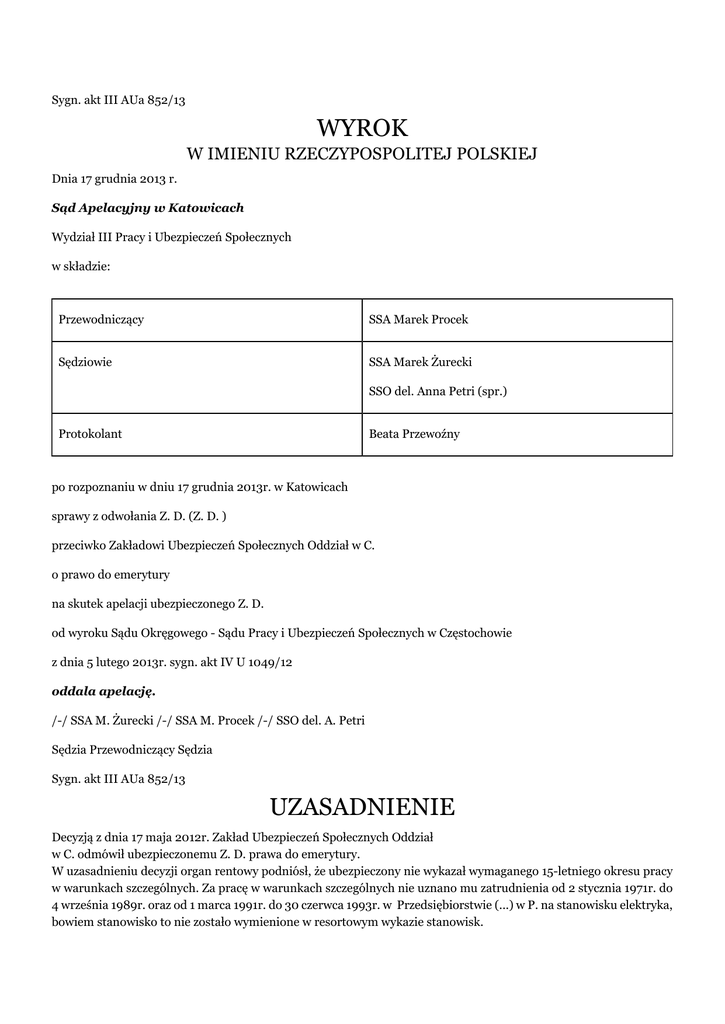 Sygn. akt III AUa 852/13 WYROK W IMIENIU RZECZYPOSPOLITEJ POLSKIEJ Dnia 17 grudnia 2013 r. Sąd Apelacyjny w Katowicach Wydział III Pracy i Ubezpieczeń Społecznych w składzie: Przewodniczący SSA Marek Procek Sędziowie SSA Marek Żurecki SSO del. Anna Petri (spr.) Protokolant Beata Przewoźny po rozpoznaniu w dniu 17 grudnia 2013r. w Katowicach sprawy z odwołania Z. D. (Z. D. ) przeciwko Zakładowi Ubezpieczeń Społecznych Oddział w C. o prawo do emerytury na skutek apelacji ubezpieczonego Z. D. od wyroku Sądu Okręgowego - Sądu Pracy i Ubezpieczeń Społecznych w Częstochowie z dnia 5 lutego 2013r. sygn. akt IV U 1049/12 oddala apelację. /-/ SSA M. Żurecki /-/ SSA M. Procek /-/ SSO del. A. Petri Sędzia Przewodniczący Sędzia Sygn. akt III AUa 852/13 UZASADNIENIE Decyzją z dnia 17 maja 2012r. Zakład Ubezpieczeń Społecznych Oddział w C. odmówił ubezpieczonemu Z. D. prawa do emerytury. W uzasadnieniu decyzji organ rentowy podniósł, że ubezpieczony nie wykazał wymaganego 15-letniego okresu pracy w warunkach szczególnych. Za pracę w warunkach szczególnych nie uznano mu zatrudnienia od 2 stycznia 1971r. do 4 września 1989r. oraz od 1 marca 1991r. do 30 czerwca 1993r. w Przedsiębiorstwie (...) w P. na stanowisku elektryka, bowiem stanowisko to nie zostało wymienione w resortowym wykazie stanowisk. Odwołanie od powyższej decyzji złożył ubezpieczony, wnosząc o jej zmianę i przyznanie prawa do emerytury. Domagał się uwzględnienia do stażu pracy w warunkach szczególnych spornego okresu pracy w (...). Powoływał się na przedłożone organowi rentowemu świadectwo wykonywania pracy w warunkach szczególnych, w którym wyraźnie zakwalifikowano jego pracę do wymienionej w dziale II pkt 5 wykazu A załącznika do zarządzenia Ministra Hutnictwa i Przemysłu Maszynowego z dnia 30 marca 1985r. - elektryka wysokiego napięcia. Organ rentowy wniósł o oddalenie odwołania, wywodząc jak w uzasadnieniu zaskarżonej decyzji. Podkreślił, iż ubezpieczony nie przepracował żadnego okresu w warunkach szczególnych. Sąd Okręgowy - Sąd Pracy i Ubezpieczeń Społecznych w Częstochowie wyrokiem z dnia 5 lutego 2013r. oddalił odwołanie. Sąd I instancji ustalił, iż ubezpieczony urodził się (...). Wniosek o emeryturę złożył w dniu 14 maja 2012r. Na dzień 1 stycznia 1999r. wykazał 31 lat, 1 miesiąc i 14 dni okresów składkowych i nieskładkowych. Nie pozostaje w stosunku pracy i nie jest członkiem OFE. Z ustaleń Sądu Okręgowego wynika, iż od dnia 1 lipca 1970r. ubezpieczony był zatrudniony w pełnym wymiarze czasu pracy w Przedsiębiorstwie (...) w P.. Jego pracodawca produkował samochody do przewozu osób tzw. osinobusy, budował obiekty z przeznaczeniem na zaplecza budów tzw. barakowozy, podajniki pneumatyczne, konstrukcje stalowe oraz cylindry hamulcowe do wagonów kolejowych. Początkowo ubezpieczony wykonywał pracę jako stażysta-elektryk w Warsztatach Remontowych w B. w ramach wstępnego stażu pracy, który ukończył 18 grudnia 1970r. Z dniem 1 stycznia 1971r. powierzono mu obowiązki elektryka w Warsztatach Remontowych. Wydział ten wykonywał tzw. małe inwestycje na terenie zakładu, prowadził naprawy i konserwacje wszystkich urządzeń produkcyjnych. W jego skład wchodziły brygady obróbki mechanicznej, brygady hydrauliczne, brygady ślusarskie i brygady elektryków. Ubezpieczony wykonywał pracę w ostatniej z wymienionych brygad, a dokładnie w brygadzie elektroinstalatorów. Zajmowała się ona głównie instalacjami i urządzeniami elektroenergetycznymi, tj. stacjami transformatorowo-rozdzielczymi, liniami elektrycznymi napowietrznymi o napięciu 15000 Volt, a także liniami kablowymi o napięciu do 15000 Volt na odcinkach między liniami napowietrznymi, a rozdzielniami elektrycznymi, jak również wyłącznikami mocy i rozłącznikami sekcyjnymi. Sąd Okręgowy ustalił, iż elektroinstalatorzy, w tym ubezpieczony, obsługiwali cały zakład, a więc wszystkie wydziały. Zasadniczo najpierw w warsztacie wykonywali prace przygotowawcze, bądź kierowano ich do poszczególnych wydziałów produkcyjnych oddalonych od siedziby zakładu i Wydziału Remontowego nawet do 10 km. Z uwagi na znaczne odległości, każdy z wydziałów miał oddzielną sieć elektryczną zasilającą o napięciu 15000 Volt oraz własny transformator. Przy urządzeniach elektroenergetycznych elektroinstalatorzy wykonywali prace konserwacyjne i pomiarowe. Konserwacja polegała na czyszczeniu urządzeń, pobieraniu próbek oleju transformatorowego, wykonywaniu pomiarów i badaniu w ten sposób stanu izolacji. Poza pracami przy urządzeniach wysokiego napięcia elektroinstalatorzy wykonywali również prace przy urządzeniach niskiego napięcia, tj. urządzeniach akumulatorowych, oświetleniowych i prostowniczych. Naprawiali też i konserwowali urządzenia typu spawarki, akumulatory, prasy i tokarki zasadniczo zasilane silnikami o napięciu 380 Volt. Obsługiwali też instalację oświetleniową o napięciu 230 Volt, w tym wymieniali żarówki. Elektroinstalatorzy podłączali również i odłączali od sieci maszyny i urządzenia, a także zajmowali się naprawą suwnic. Sąd I instancji ustalił, iż elektroinstalatorzy wykonywali swoje prace remontowe i konserwatorskie niezależnie od elektryków wydziałowych odpowiedzialnych za bieżące utrzymanie ruchu. Ponadto, realizowali drobne prace inwestycyjne polegające na rozbudowie sieci elektrycznej. Ogółem praca przy urządzeniach elektroenergetycznych zajmowała ubezpieczonemu około 65 % jego czasu pracy. Resztę czasu poświęcał na inne czynności, w tym dojazdy do poszczególnych zakładów. Wydział Remontów znajdował się bowiem w P., a Wydział Nadwozi Samochodów był w (...), Wydział Zaplecza Budów w D., 7 km od Wydziału Remontów, Wydział Pneumatyki i Zbiorników - w B., 6 km od Wydziału Remontów. Do dojazdów w czasie pracy do tych zakładów używano M.albo N.. Ponadto, w zakr