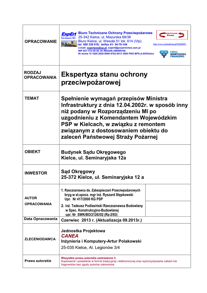 ExpErt Rok założenia 1995 OPRACOWANIE Biuro Techniczne Ochrony Przeciwpożarowe 25-342 Kielce, ul. Mazurska 68/38 Biuro Kielce, ul. Wesoła 51 lok. 614 (VIp) tel. 509 339 019; tel/fax 41- 34-70-144 e-mail: [email protected]; [email protected] RZETELNA Firma http://www.rzetelnafirma.pl/932Q4H5C/ NIP 657-172-39-30, Nr REGON 290099746 Nr konta 15 1020 2629 0000 9702 0013 3595 PKO BPS.A.IIO/Kielce RODZAJ OPRACOWANIA Ekspertyza stanu ochrony przeciwpożarowej TEMAT Spełnienie wymagań przepisów Ministra Infrastruktury z dnia 12.04.2002r. w sposób inny niż podany w Rozporządzeniu MI po uzgodnieniu z Komendantem Wojewódzkim PSP w Kielcach, w związku z remontem związanym z dostosowaniem obiektu do zaleceń Państwowej Straży Pożarnej OBIEKT Budynek Sądu Okręgowego Kielce, ul. Seminaryjska 12a INWESTOR Sąd Okręgowy 25-372 Kielce, ul. Seminaryjska 12 a AUTOR OPRACOWANIA 1. Rzeczoznawca ds. Zabezpieczeń Przeciwpożarowych bryg.w st.spocz. mgr inż. Ryszard Stępkowski Upr. Nr 417/2000 KG PSP 2. inż. Tadeusz Podlasiński Rzeczoznawca Budowlany w Spec. Konstrukcyjno-Budowlanej upr. Nr SWK/BO/2126//02 (Rz-2/93) Data Opracowania Czerwiec 2013 r. (Aktualizacja 09.2013r.) Jednostka Projektowa ZLECENIODAWCA CANEA Inżynieria i Komputery-Artur Polakowski 25-035 Kielce, Al. Legionów 3/4 Prawa autorskie Wszystkie prawa autorskie zastrzeżone ©. Kopiowanie i powielanie w formie tradycyjnej i elektronicznej oraz wykorzystywanie całości lub fragmentów bez zgody autorów zabronione EKSPERTYZA STANU OCHRONY PRZECIWPOŻAROWEJ Obiekt: Sąd Okręgowy Kielce, ul. Seminaryjska 12a Strona Stron 2 19 Spis treści 1. 2. 3. 4. 5. 5.1. 5.2. 5.3. 5.4. 5.5. 5.6. 5.7. 5.8. 5.9. 5.10. 5.11. 5.12. 5.13. 5.14. 6. 6.1. 6.2. 6.3. 7. 8. 9. 10. Wstęp…………………………………………………………………………………………………...................... Przedmiot, zakres i cel opracowania………………………………………………………….………………....… Ogólna charakterystyka obiektu (gabaryty, konstrukcja, przeznaczenie, usytuowanie)……….……............ Warunki budowlano – instalacyjne, ich stan techniczny ( związany z ochroną przeciwpożarową)………… Zakres remontu budynku.......................…………………………….…….……………………………….……... Charakterystyka pożarowa……………………………………………………………………………………….… Powierzchnia, wysokość i liczba kondygnacji……………………………………..…………..……………….… Odległość od obiektów sąsiadujących…………………………………………………….……………..……….. Parametry pożarowe występujących substancji palnych………………………………………………..…....... Przewidywana gęstość obciążenia ogniowego…………………………………………………………............. Kategoria zagrożenia ludzi, przewidywana liczba osób na każdej kondygnacji ……………………………… Ocena zagrożenia wybuchem pomieszczeń oraz przestrzeni zewnętrznych……………………………....… Podział obiektu na strefy pożarowe……………………………………………………………………………..… Klasa odporności pożarowej budynku oraz klasa odporności ogniowej i stopień rozprzestrzeniania ognia przez elementy budowlane………………………………..………………………………………………………... Warunki ewakuacji, oświetlenie awaryjne………………………………………………………...………………. Sposób zabezpieczenia przeciwpożarowego instalacji użytkowych, a w szczególności: wentylacyjnej, ogrzewczej, gazowej, elektroenergetycznej, odgromowej, kontroli dostępu……...………………………...... Dobór urządzeń przeciwpożarowych w obiekcie …………………………………………………..……… Wyposażenie w gaśnice i inny sprzęt gaśniczy lub ratownicz……………………………………………..…… Zaopatrzenie w wodę do zewnętrznego gaszenia pożaru………………………..…………………………….. Drogi pożarowe……………………………………………………………………………………………………… Zakres niezgodności z przepisami………………………………………………………………..….………....… Wskazanie wszystkich występujących w budynku niezgodności z przepisami technicznobudowlanymi i przeciwpożarowymi…………………………..…………………………………………..……..... Wskazanie niezgodności w zakresie przepisów techniczno – budowlanych i przeciwpożarowych, które zostaną doprowadzone w budynku do stanu zgodnego z przepisami……………….….……………... Wskazanie niezgodności w zakresie przepisów techniczno – budowlanych i przeciwpożarowych, które nie zostaną doprowadzone w budynku do stanu zgodnego z przepisami…………………….………. Przyjęte rozwiązania (ponadstandardowe) zastępcze inne niż określają to przepisy techniczno – budowlane zapewniające zabezpieczenie przeciwpożarowe obiektu (rekompensujące niezgodności niemożliwe do usunięcia w zabezpieczeniu przeciwpożarowym w stosunku do wymagań przepisów) – wyszczególnienie proponowanych rozwiązań zastępczych……………………………………….…………… Analiza i ocena wpływu rozwiązań zastępczych na poziom bezpieczeństwa pożarowego, służąca wskazaniu niepogorszenia warunków ochrony przeciwpożarowej……………………................................. Opinia techniczna budynku Sądu Okręgowego w Kielcach przy ulicy Seminaryjskiej 12a dotycząca stanu konstrukcji budynku w zakresie niezbędnym do określenia klasy odporności ogniowej el