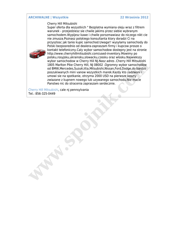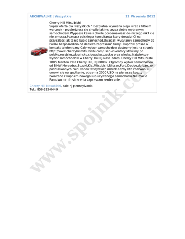 ARCHIWALNE | Wszystkie 22 Września 2012 w w w .s po jn ik Cherry Hill Mitsubishi, cale nj pennsylvania Tel.: 856-325-0449 .c o m Cherry Hill Mitsubishi Super oferta dla wszystkich " Bezplatna wymiana oleju wraz z filtrem warunek - przejedziesz sie chwile jakims przez siebie wybranym samochodem.Wypijesz kawe i chwile porozmawiasz do niczego nikt cie nie zmusza.Poznasz polskiego konsultanta ktory doradzi Ci na przyszlosc jak tanio kupic samochod.Uwaga!! wysylamy samochody do Polski bezposrednio od dealera-zapraszam firmy i kupcow prosze o kontakt telefoniczny.Caly wybor samochodow dostepny jest na stronie http://www.cherryhillmitsubishi.com/used-inventory.Mowimy po polsku,rosyjsku,ukrainsku,slowacku,czesku oraz wlosku.Najwiekszy wybor samochodow w Cherry Hiil NJ.Nasz adres .Cherry Hill Mitsubishi 1805 Marlton Pike Cherry Hill, NJ 08002 .Ogromny wybor samochodow od BMW,Mercedes,Suzuki,Kia,Mitsubishi,Nissan,Ford,Dodge,do bardzo poszukiwanych mini vanow wszystkich marek.Kazdy kto zadzwoni i umowi sie na spotkanie, otrzyma 2000 USD na pierwsze koszty zwiazane z kupnem nowego lub uzywanego samochodu.Nie macie Panstwo nic do stracenia zapraszam serdecznie.