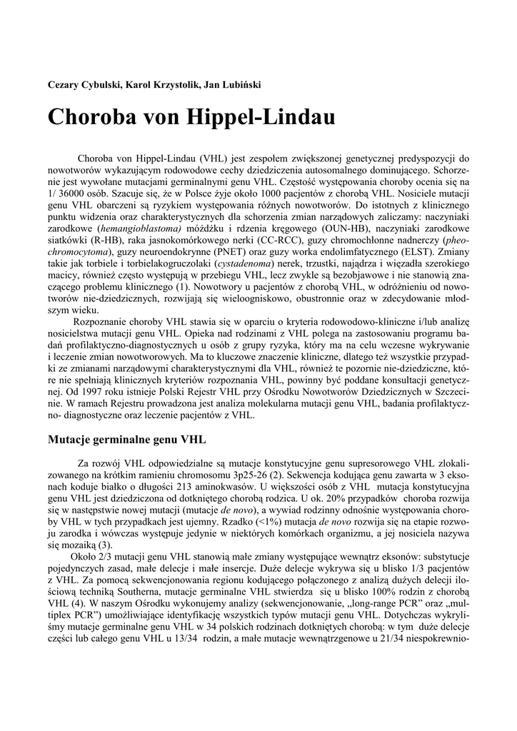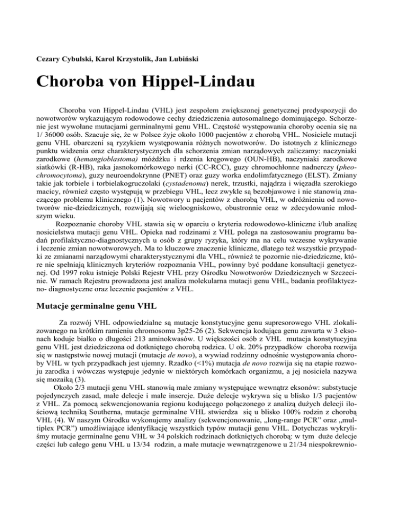 Cezary Cybulski, Karol Krzystolik, Jan Lubiński Choroba von Hippel-Lindau Choroba von Hippel-Lindau (VHL) jest zespołem zwiększonej genetycznej predyspozycji do nowotworów wykazującym rodowodowe cechy dziedziczenia autosomalnego dominującego. Schorzenie jest wywołane mutacjami germinalnymi genu VHL. Częstość występowania choroby ocenia się na 1/ 36000 osób. Szacuje się, Ŝe w Polsce Ŝyje około 1000 pacjentów z chorobą VHL. Nosiciele mutacji genu VHL obarczeni są ryzykiem występowania róŜnych nowotworów. Do istotnych z klinicznego punktu widzenia oraz charakterystycznych dla schorzenia zmian narządowych zaliczamy: naczyniaki zarodkowe (hemangioblastoma) móŜdŜku i rdzenia kręgowego (OUN-HB), naczyniaki zarodkowe siatkówki (R-HB), raka jasnokomórkowego nerki (CC-RCC), guzy chromochłonne nadnerczy (pheochromocytoma), guzy neuroendokrynne (PNET) oraz guzy worka endolimfatycznego (ELST). Zmiany takie jak torbiele i torbielakogruczolaki (cystadenoma) nerek, trzustki, najądrza i więzadła szerokiego macicy, równieŜ często występują w przebiegu VHL, lecz zwykle są bezobjawowe i nie stanowią znaczącego problemu klinicznego (1). Nowotwory u pacjentów z chorobą VHL, w odróŜnieniu od nowotworów nie-dziedzicznych, rozwijają się wieloogniskowo, obustronnie oraz w zdecydowanie młodszym wieku. Rozpoznanie choroby VHL stawia się w oparciu o kryteria rodowodowo-kliniczne i/lub analizę nosicielstwa mutacji genu VHL. Opieka nad rodzinami z VHL polega na zastosowaniu programu badań profilaktyczno-diagnostycznych u osób z grupy ryzyka, który ma na celu wczesne wykrywanie i leczenie zmian nowotworowych. Ma to kluczowe znaczenie kliniczne, dlatego teŜ wszystkie przypadki ze zmianami narządowymi charakterystycznymi dla VHL, równieŜ te pozornie nie-dziedziczne, które nie spełniają klinicznych kryteriów rozpoznania VHL, powinny być poddane konsultacji genetycznej. Od 1997 roku istnieje Polski Rejestr VHL przy Ośrodku Nowotworów Dziedzicznych w Szczecinie. W ramach Rejestru prowadzona jest analiza molekularna mutacji genu VHL, badania profilaktyczno- diagnostyczne oraz leczenie pacjentów z VHL. Mutacje germinalne genu VHL Za rozwój VHL odpowiedzialne są mutacje konstytucyjne genu supresorowego VHL zlokalizowanego na krótkim ramieniu chromosomu 3p25-26 (2). Sekwencja kodująca genu zawarta w 3 eksonach koduje białko o długości 213 aminokwasów. U większości osób z VHL mutacja konstytucyjna genu VHL jest dziedziczona od dotkniętego chorobą rodzica. U ok. 20% przypadków choroba rozwija się w następstwie nowej mutacji (mutacje de novo), a wywiad rodzinny odnośnie występowania choroby VHL w tych przypadkach jest ujemny. Rzadko (<1%) mutacja de novo rozwija się na etapie rozwoju zarodka i wówczas występuje jedynie w niektórych komórkach organizmu, a jej nosiciela nazywa się mozaiką (3). Około 2/3 mutacji genu VHL stanowią małe zmiany występujące wewnątrz eksonów: substytucje pojedynczych zasad, małe delecje i małe insercje. DuŜe delecje wykrywa się u blisko 1/3 pacjentów z VHL. Za pomocą sekwencjonowania regionu kodującego połączonego z analizą duŜych delecji ilościową techniką Southerna, mutacje germinalne VHL stwierdza się u blisko 100% rodzin z chorobą VHL (4). W naszym Ośrodku wykonujemy analizy (sekwencjonowanie, „long-range PCR” oraz „multiplex PCR”) umoŜliwiające identyfikację wszystkich typów mutacji genu VHL. Dotychczas wykryliśmy mutacje germinalne genu VHL w 34 polskich rodzinach dotkniętych chorobą: w tym duŜe delecje części lub całego genu VHL u 13/34 rodzin, a małe mutacje wewnątrzgenowe u 21/34 niespokrewnio- nych polskich rodzin z VHL (5, 6, 7). Analiza genu VHL jest rutynowo przeprowadzana u pacjentów z chorobą VHL rozpoznaną definitywnie oraz u osób z podejrzeniem choroby VHL. Szczególne znaczenie naleŜy przypisać badaniu DNA w przypadkach podejrzanych o VHL, lecz nie spełniających klinicznych kryteriów VHL. W takich trudnych diagnostycznie przypadkach wynik badania molekularnego często przesądza o rozpoznaniu. Podział kliniczny VHL Zaobserwowano, Ŝe rodziny z chorobą VHL róŜnią się pod względem manifestacji narządowych choroby, co zaleŜy od charakteru uszkodzenia genu VHL. W pewnych rodzinach (około 90% ogółu rodzin z VHL) występują naczyniaki zarodkowe ośrodkowego układu nerwowego i siatkówki, rak nerki, lecz nie stwierdza się występowania pheochromocytoma. Rodziny, w których nie występuje pheochromocytoma określa się jako VHL typu 1. W około 10% rodzin stwierdza się zmiany w obrębie siatkówki, układu nerwowego, nerek oraz dodatkowo występowanie guza nadnerczy. Rodziny, w których występuje pheochromocytoma określa się jako VHL typu 2 i dzieli się na 3 podtypy w zaleŜności od częstości występowania raka nerki: typ 2A – niewielkie ryzyko raka nerki, typ 2B – częste występowanie raka nerki. Rzadko stwierdza się przypadki, w których obserwuje się rodzinne występowanie pheochromocytoma, bez innych manifestacji narządowych VHL. Takie przypadki określane są jako VHL typu 2C. Analiza genu VHL ujawniła, Ŝe prawie wszystkie przypadki choroby VHL typu 2 wywołane są poprzez niewielkie uszkodzenie genu VHL (uszkodzenie pojedynczych nukleotydów w DNA powodujące zaburzenie jednego aminokwasu w białku VHL, które są określane mianem mutacji typu „missense”), a większość pacjentów z VHL typu 1 posiada rozległe uszkodzenie genu VHL (o charakterze delecji lub insercji) (8). Podział kliniczny choroby VHL jest niezwykle istotny z praktycznego punktu widzenia, gdyŜ członkowie rodzin typu 2 obciąŜeni są znacznym ryzykiem guza nadnerczy i powinni być bardzo starannie badani w kierunku występowania pheochromocytoma, bowiem guz nadnerczy jest często pierwszym objawem choroby u tych pacjentów (8). Kliniczne kryteria rozpoznania VHL Rozpoznanie choroby VHL stawiane jest na podstawie spełnienia następując
