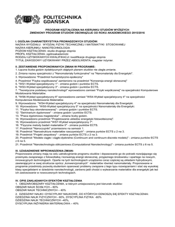 PROGRAM KSZTAŁCENIA NA KIERUNKU STUDIÓW WYŻSZYCH ZMIENIONY PROGRAM STUDIÓW OBOWIĄZUJE OD ROKU AKADEMICKIEGO 2015/2016 I. OGÓLNA CHARAKTERYSTYKA PROWADZONYCH STUDIÓW: NAZWA WYDZIAŁU: WYDZIAŁ FIZYKI TECHNICZNEJ I MATEMATYKI STOSOWANEJ NAZWA KIERUNKU: NANOTECHNOLOGIA POZIOM KSZTAŁCENIA: studia drugiego stopnia PROFIL KSZTAŁCENIA: ogólnoakademicki RODZAJ UZYSKIWANYCH KWALIFIKACJI: kwalifikacje drugiego stopnia TYTUŁ ZAWODOWY UZYSKIWANY PRZEZ ABSOLWENTA: magister inżynier. II. ZESTAWIENIE PROPONOWANYCH ZMIAN W PROGRAMIE: 1. Łączna liczba godzin dydaktycznych objętych planem studiów nie uległa zmianie. 2. Zmiana nazwy specjalności z "Nanomateriały funkcjonalne" na "Nanomateriały dla Energetyki". 3. Wprowadzono "Przedmiot humanistyczno-społeczny" 4. Przedmiot "Fizyka współczesna" zamieniono na przedmiot "Konwersja energii słonecznej" 5. "WS1-Wykład specjalistyczny 1" - zmiana godzin i punktów ECTS. 6. "WS3-Wykład specjalistyczny 3" - zmiana godzin i punktów ECTS. 7. "Teoretyczne podstawy nanotechnologii" wprowadzono zamiast "Fizyki współczenej" na specjalności Komputerowe Modelowanie Materiałów. 8. "WS6-Wykład specjalistyczny 6" wprowadzono zamiast "WS4-Wykład specjalistyczny 4" na specjalności Komputerowe Modelowanie Materiałów. 9. Wprowadzono "WS4-Wykład specjalistyczny 4" na specjalności Nanomateriały dla Energetyki. 10. Wprowadzono "WS5-Wykład specjalistyczny 5" na specjalności Nanomateriały dla Energetyki. 11. "Fizyka fazy skondensowanej" - zmiana godzin i punktów ECTS. 12. "Seminarium dyplomowe" - zmiana godzin i punktów ECTS. 13. "Praca dyplomowa magisterska" - zmiana liczby godzin. 14. Wprowadzono przedmiot "Projektowanie układów energetyki fotowoltaicznej". 15. Wprowadzono przedmiot "WS7-Wykład wspecjalistyczny 7". 16. "Fizyczne metody badań materiałów II" - zmiana punktów ECTS. 17. Przedmiot "Nanoczujniki" przeniesiono na semestr 1. 18. Przedmiot "Nanostruktura materiałów rzeczywistych" - zmiana punków ECTS z 2 na 3. 19. Przedmiot "Projekt zespołowy" - zmiana punków ECTS z 2 na 3. 20. Przedmiot "Modele ciągłe i ciągło-dyskretne (Continuum and continuum-discrete models)" - zmiana punków ECTS z 6 na 5. 21. Przedmiot "Nanotechnologia obliczeniowa (Computational Nanotechnology)" - zmiana punków ECTS z 6 na 5. III. UZASADNIENIE WPROWADZENIA ZMIAN: Proponowane zmiany mają na celu uatrakcyjnienie programu studiów i dopasowanie go do potrzeb rozwijającego się przemysłu związanego z fotowoltaiką i konwersją energii słonecznej, przyjaznego środowisku i opartego na nowych, innowacyjnych technologiach. Oparte na tych technologiach urządzenia coraz częściej są układami hybrydowymi, zawierającymi w swej strukturze oprócz „konwencjonalnych” materiałów również nanomateriały. Proponowane w programie przedmioty pozwolą studentom opanować problemy związane z tego typu rozwiązaniami i stać się wysokiej klasy specjalistami w dziedzinie nanotechnologii, zarówno jeśli chodzi o wytwarzanie materiałów dla energetyki jak też ich zastosowanie w nowoczesnych technologiach. IV. OPIS ZAKŁADANYCH EFEKTÓW KSZTAŁCENIA 1. OBSZAR/OBSZARY KSZTAŁCENIA, w których umiejscowiony jest kierunek studiów: OBSZAR NAUK ŚCISŁYCH – 60% OBSZAR NAUK TECHNICZNYCH – 40% 2. DZIEDZINY NAUKI I DYSCYPLINY NAUKOWE, DO KTÓRYCH ODNOSZĄ SIĘ EFEKTY KSZTAŁCENIA: DZIEDZINA NAUK FIZYCZNYCH - 60%, DYSCYPLINA FIZYKA -60% DZIEDZINA NAUK TECHNICZNYCH –40%, DYSCYPLINA INŻYNIERIA MATERIAŁOWA – 40% 3. CELE KSZTAŁCENIA: Wykształcenie absolwenta posiadającego szeroką, uporządkowaną i pogłębioną wiedzę w zakresie podstaw nanotechnologii i dyscyplin pokrewnych oraz ich zastosowań praktycznych. Absolwent jest przygotowany do kontynuowania nauki na studiach III stopnia (doktoranckich), do pracy na stanowiskach naukowych i inżynieryjnotechnicznych w instytutach naukowych i laboratoriach naukowo-badawczych, a także do pracy w przemyśle, w szczególności w firmach pośredniczących w transferze wiedzy z obszaru nauki do gospodarki. 4. SYLWETKA ABSOLWENTA: Absolwent po zakończeniu studiów będzie posiadać: - poszerzoną wiedzę ogólną z zakresu fizyki; - wiedzę ogólną z zakresu inżynierii materiałowej; - wiedzę podstawową z zakresu nanobiotechnologii i nanochemii; - pogłębioną wiedzę szczegółową z nanotechnologii i innych nauk w obszarach odpowiadającym profilom poszczególnych specjalności; - umiejętność analizowania procesów i zjawisk fizycznych najistotniejszych dla badanych problemów; - umiejętność projektowania urządzeń i stanowisk pomiarowych; - umiejętność popularyzacji osiągnięć nauki i techniki. 5. EFEKTY KSZTAŁCENIA: WIEDZA Symbol Osoba posiadająca kwalifikacje drugiego stopnia: K_W01 Posiada poszerzoną i uporządkowaną wiedzę w zakresie nauki o materiałach. K_W02 Ma pogłębioną, podbudowaną teoretycznie, szczegółową wiedzę w zakresie wybranego działu nanotechnologii oraz, w stopniu adekwatnym do potrzeb, w zakresie pokrewnych dziedzin nauki lub techniki. K_W03 Ma ogólną wiedzę o aktualnych kierunkach rozwoju i najnowszych odkryciach w zakresie fizyki, chemii, technologii i zastosowań nanostruktur. Posiada pogłębioną praktyczną i teoretyczną znajomość fizycznych i chemicznych metod eksperymentalnych nanotechnologii. K_W04 K_W05 K_W06 K_W07 K_W08 K_W09 Odniesienie do obszarowych efektów kształcenia X2A_W01 T2A_W01 X2A_W01 T2A_W02 X2A_W06 T2A_W05 X2A_W06 X2A_W05 X2A_W03 T2A_W07 T2A_W05 InzA_W01 InzA_W02 InzA_W05 Posiada pogłębioną znajomość metod matematycznych, X2A_W02 numerycznych i symulacyjnych, klasycznych i kwantowych, stosowanych przy X2A_W03 modelowaniu nanostruktur. X2A_W04 T2A_W01 Posiada poszerzoną wiedzę dotyczącą metodyki pracy w laboratorium fizycznym, popartą X2A_W03 doświadczeniem w pracy laboratoryjnej. Zna zasady bezpieczeństwa i higieny pracy w X2A_W07 stopniu pozwalającym na samodzielną pracę na stanowisku badawczym lub p