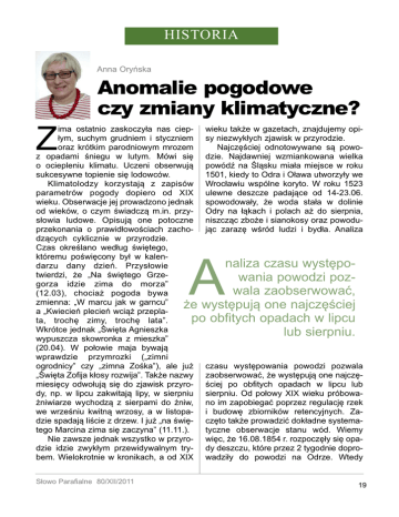 HISTORIA Anomalie pogodowe czy zmiany klimatyczne? Anna Oryńska Z ima ostatnio zaskoczyła nas ciep- wieku także w gazetach, znajdujemy opiłym, suchym grudniem i styczniem sy niezwykłych zjawisk w przyrodzie. oraz krótkim parodniowym mrozem Najczęściej odnotowywane są powoz opadami śniegu w lutym. Mówi się dzie. Najdawniej wzmiankowana wielka o ociepleniu klimatu. Uczeni obserwują powódź na Śląsku miała miejsce w roku sukcesywne topienie się lodowców. 1501, kiedy to Odra i Oława utworzyły we Klimatolodzy korzystają z zapisów Wrocławiu wspólne koryto. W roku 1523 parametrów pogody dopiero od XIX ulewne deszcze padające od 14-23.06. wieku. Obserwacje jej prowadzono jednak spowodowały, że woda stała w dolinie od wieków, o czym świadczą m.in. przy- Odry na łąkach i polach aż do sierpnia, słowia ludowe. Opisują one potoczne niszcząc zboże i sianokosy oraz powoduprzekonania o prawidłowościach zacho- jąc zarazę wśród ludzi i bydła. Analiza dzących cyklicznie w przyrodzie. Czas określano według świętego, któremu poświęcony był w kalennaliza czasu występodarzu dany dzień. Przysłowie twierdzi, że „Na świętego Grzewania powodzi pozgorza idzie zima do morza” wala zaobserwować, (12.03), chociaż pogoda bywa zmienna: „W marcu jak w garncu” że występują one najczęściej a „Kwiecień plecień wciąż przeplapo obfitych opadach w lipcu ta, trochę zimy, trochę lata”. Wkrótce jednak „Święta Agnieszka lub sierpniu. wypuszcza skowronka z mieszka” (20.04). W połowie maja bywają wprawdzie przymrozki („zimni ogrodnicy” czy „zimna Zośka”), ale już czasu występowania powodzi pozwala „Święta Zofija kłosy rozwija”. Także nazwy zaobserwować, że występują one najczęmiesięcy odwołują się do zjawisk przyro- ściej po obfitych opadach w lipcu lub dy, np. w lipcu zakwitają lipy, w sierpniu sierpniu. Od połowy XIX wieku próboważniwiarze wychodzą z sierpami do żniw, no im zapobiegać poprzez regulację rzek we wrześniu kwitną wrzosy, a w listopa- i budowę zbiorników retencyjnych. Zadzie spadają liście z drzew. I już „na świę- częto także prowadzić dokładne systematego Marcina zima się zaczyna” (11.11.). tyczne obserwacje stanu wód. Wiemy Nie zawsze jednak wszystko w przyro- więc, że 16.08.1854 r. rozpoczęły się opadzie idzie zwykłym przewidywalnym try- dy deszczu, które przez 2 tygodnie doprobem. Wielokrotnie w kronikach, a od XIX wadziły do powodzi na Odrze. Wtedy A Słowo Parafialne 80/XII/2011 19 Wielkanoc 2012 (25.08.) w Głogowie odnotowano najwyższy poziom wody 673 cm. 09.07.1903 r. zapisano najwyższy opad dobowy w zlewni górnej Odry, który wyniósł 240 mm. Podczas katastrofalnej powodzi w 1929 r. w nocy z 13/14.07. w Brzegu Dolnym poziom wody Odry wyniósł 746 cm. Pamiętne wydarzenie nastąpiło 05.07. 1958 r.: podczas wielkiej fali powodziowej o godz. 4.20 nastąpił przelew przez kaskadę zapory w Pilichowicach, a 5.07. 1958 r. o godz. 18.00 także przelew przez upusty boczne zapory w Leśnej. Podobna sytuacja miała miejsce podczas tzw. powodzi tysiąclecia w 1997 r.: 20.07. woda przelała się przez zaporę w Pilichowicach. Największa fala powodziowa przeszła wówczas przez Wrocław w nocy z 13 na 14 lipca, a poziom fali kulminacyjnej w Głogowie wyniósł wtedy 715 cm, zaś druga fala kulminacyjna w Głogowie parę dni później sięgnęła 667 cm. 20 Kroniki notowały także inne anomalie np. niespotykane susze. W lecie 1455 r. deszcz nie padał przez 16 tygodni i wyschła całkowicie Odra. W 1504 r. w okolicach Lubania deszcz nie spadł przez 10 miesięcy, a w 1590 r. z powodu suszy powysychały rzeki m.in. Bóbr, Kaczawa, Kwisa, Oława i Widawa. W latach 1726 27 wielkie posuchy na Śląsku doprowadziły do klęski nieurodzaju i głodu. W 1824 r. w rejencji legnickiej młyny stały bezczynne z powodu braku wody w rzekach. Historycy zwracają uwagę na to, że w XVI wieku nastąpiło wyraźne ochłodzenie klimatu. Zima 1513/1514 r. była wyjątkowo ostra i długotrwała: mróz trzymał bez przerwy od 24 października przez 5 miesięcy! Wtedy to w Głogowie i Zielonej Górze wymarzły winnice. Ich istnienie świadczy o łagodnym klimacie. Z powodu mroźnej zimy 1556/57 chłopi zdejmowali poszycie z dachów, aby ciąć i parzyć słomę ze strzech na paszę dla bydła, by ocalić je od śmierci głodowej. Rok 1587 przyniósł mokre i zimne lato oraz wylewy rzek. Wczesna zima spowodowała, że warzywa i jare zboża nie dojrzały. Żniwiarze żęli zboże w kożuchach, a na tzw. przednówkach, gdy nie było jeszcze nowych plonów, ludzie cierpieli głód i wzrastała ich zapadalność na choroby i śmiertelność. Odnotowywano także inne nietypowe zjawiska: 14.05.1619 r. wszystkie rzeki w Karkonoszach pokryła gruba warstwa lodu, 16.05.1633 r. w Karkonoszach spadł wielki śnieg, a w niektórych rejonach Śląska opady śniegu odnotowano w lipcu 1732 r. Śnieg w lipcu pojawił się także obficie 12.07.1888 r. w najwyższych partiach Sudetów. W dniach 07-09.04. 1864 r. z powodu obfitych opadów śniegu Słowo Parafialne 81/IV/2012 Wydarzenia Dzierżoniów pozbawiony był połączenia kolejowego. Najniższą temperaturę powietrza odnotowano w rejonach górskich w nocy 02/03.03.1929 r. -42 stopnie Celsjusza. Tragiczne wydarzenie miało miejsce 20.03.1968 r., gdy ze stoków Białego Jaru zeszła lawina dł. 600 m, szer. 80 m i wys. czoła 12 m – zginęło w niej 19 turystów. Bywały także zimy bardzo łagodne. Odnotowano, że w 1473 r. już 12.03. zakwitły róże. Na przełomie sierpnia i września 1530 r. oraz września i października 1552 r. po raz drugi zakwitły drzewa owocowe, głóg, tarnina i róże. W 1575 r. cieszył wielki urodzaj winnej latorośli i owoców na całym Śląsku. O niespotykanej w zimie wysokiej temperaturze ma świadczyć zapis w kronice Kamiennej Góry, że 01.01.1771 r. było tak ciepło, iż wielu mieszkańców miasta chod