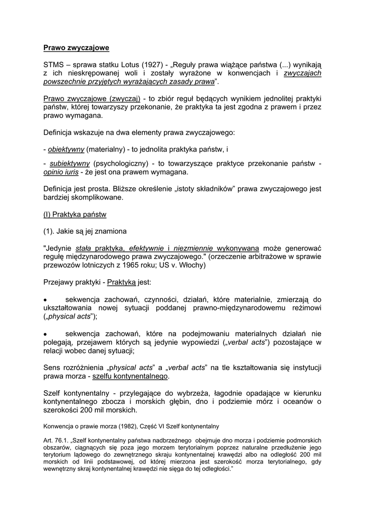 Prawo zwyczajowe STMS – sprawa statku Lotus (1927) - „Reguły prawa wiążące państwa (...) wynikają z ich nieskrępowanej woli i zostały wyrażone w konwencjach i zwyczajach powszechnie przyjętych wyrażających zasady prawa”. Prawo zwyczajowe (zwyczaj) - to zbiór reguł będących wynikiem jednolitej praktyki państw, której towarzyszy przekonanie, że praktyka ta jest zgodna z prawem i przez prawo wymagana. Definicja wskazuje na dwa elementy prawa zwyczajowego: - obiektywny (materialny) - to jednolita praktyka państw, i - subiektywny (psychologiczny) - to towarzyszące praktyce przekonanie państw opinio iuris - że jest ona prawem wymagana. Definicja jest prosta. Bliższe określenie „istoty składników” prawa zwyczajowego jest bardziej skomplikowane. (I) Praktyka państw (1). Jakie są jej znamiona "Jedynie stała praktyka, efektywnie i niezmiennie wykonywana może generować regułę międzynarodowego prawa zwyczajowego." (orzeczenie arbitrażowe w sprawie przewozów lotniczych z 1965 roku; US v. Włochy) Przejawy praktyki - Praktyką jest: • sekwencja zachowań, czynności, działań, które materialnie, zmierzają do ukształtowania nowej sytuacji poddanej prawno-międzynarodowemu reżimowi („physical acts”); • sekwencja zachowań, które na podejmowaniu materialnych działań nie polegają, przejawem których są jedynie wypowiedzi („verbal acts”) pozostające w relacji wobec danej sytuacji; Sens rozróżnienia „physical acts” a „verbal acts” na tle kształtowania się instytucji prawa morza - szelfu kontynentalnego. Szelf kontynentalny - przylegające do wybrzeża, łagodnie opadające w kierunku kontynentalnego zbocza i morskich głębin, dno i podziemie mórz i oceanów o szerokości 200 mil morskich. Konwencja o prawie morza (1982), Część VI Szelf kontynentalny Art. 76.1. „Szelf kontynentalny państwa nadbrzeżnego obejmuje dno morza i podziemie podmorskich obszarów, ciągnących się poza jego morzem terytorialnym poprzez naturalne przedłużenie jego terytorium lądowego do zewnętrznego skraju kontynentalnej krawędzi albo na odległość 200 mil morskich od linii podstawowej, od której mierzona jest szerokość morza terytorialnego, gdy wewnętrzny skraj kontynentalnej krawędzi nie sięga do tej odległości.” Prawa państw nadbrzeżnych na szelfie normowane były do 1958 roku - w dacie tej przyjęto konwencję o szelfie (Genewa) - wyłącznie prawem zwyczajowym kształtowanym: - z jednej strony, przez inicjowaną praktykę jego eksploatacji; - z drugiej przez proklamację prezydenta USA Trumana z 28. 09. 1945 r., o prawie państwa nadbrzeżnego (US) do zawłaszczenia bogactw szelfu; Proklamacja stanowiła, m.in., że “having concern for the urgency of conserving and prudently utilizing its natural resources, the Government of the United States regards the natural resources of the subsoil and sea-bed of the continental shelf beneath the high seas but contiguous to the coasts of the United States as appertaining to the United States, subject to its jurisdiction and control”. (2). Czyje zachowania ? Przede wszystkim organów państwa, które są bezpośrednio zaangażowane w stosunki międzynarodowe; prezydenta, premiera, ministra spraw zagranicznych, służby zagranicznej (dyplomatycznej – misje stałe, misje ad hoc (specjalne), misje w organizacjach międzynarodowych). Efektem kontaktów dwustronnych, wielostronnych, realizowanych na forach organizacji międzynarodowych są m.in., deklaracje wspólne, jednostronne oświadczenia, dokumentacja konferencji i spotkań, korespondencja dyplomatyczna – opisujące, sygnalizujące (bądź nie) praktykę państw (physical acts/verbal acts). Początkowo „praktykę suwerennych państw” łączono wyłącznie z wypowiedziami przedstawicieli – organów – bezpośrednio zaangażowanych w służbę zagraniczną państwa. To restryktywne podejście zostało zarzucone na przełomie XIX/XX wieku współcześnie świadectwem praktyki są także zachowania innych organów państwa, a więc m.in., - organów prawodawczych (ustawodawczych); - innych organów administracji państwowej (niezależnie od szczebla); - a także organów sądowych. Świadectwem tej rozszerzenia kręgu ‘praktykujących’ organów państwa, przykład orzeczenia Sądu Najwyższego Stanów Zjednoczonych w sprawie Paquete Habana – (1900). Sprawę tę wywołało zatrzymanie i zajęcie (1898) statku rybackiego (Paquete Habana) przez flotę wojenną Stanów Zjednoczonych blokującą Kubę należącą do Hiszpanii, z którą to Stany pozostawały w wojnie. Zatrzymanie statku wywołało pytanie: czy jego zajęcie było zgodne z prawem międzynarodowym, prawem zwyczajowym ? Czyja praktyka zdaniem Sądu świadczyła o ukształtowaniu się reguły prawa zwyczajowego mające zastosowanie w sprawie ? Sąd wskazał m.in. na: - wydane przez króla Anglii Henryka IV w latach 1403 i 1406 edykty; traktat zawarty miedzy Karolem V i Franciszkiem I z 1521 roku; regulację holenderską z 1536 roku; praktykę morską w trakcie wojny o niepodległość Stanów Zjednoczonych; list Ludwika XVI z 5.06.1779 roku kierowany do admirała floty francuskiej; - traktat zawarty pomiędzy US a Prusami 1785 roku; - rozkaz dowodzącego grupą okrętów amerykańskich blokujących wybrzeże Meksyku, przekazany na piśmie dowódcom z dnia 14.05.1846 roku; - praktykę floty francuskiej podczas wojny krymskiej i wojny z Prusami; - regulację japońską przyjętą w 1894 na początku wojny z Chinami itd. SN US w sprawie Paquete Habana – (1900) stwierdził, że „(...) przegląd tych precedensów w sposób oczywisty dowodzi, powszechnej zgody cywilizowanych narodów świata, iż oto niezależnie od traktatowych postanowień i innych aktów władzy publicznej, jest ukształtowaną regułą prawa międzynarodowego (...) przyjętą przez walczących, że statki rybackie dokonujące połowów u wybrzeży, łącznie z ich wyposażeniem, ładunkiem