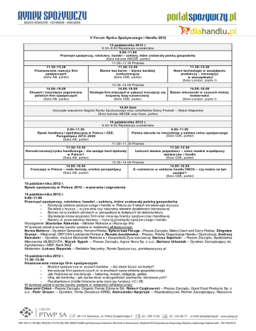 V Forum Rynku Spożyw czego i Handlu 2012 15 października 2012 r. 8.30–9.00 Rejestracja uczestników 9.00–11.00 Przemysł spożyw czy, rolnictw o, handel – sektory, które uratow ały polską gospodarkę (Sala balowa ABCDE, parter) 11.30–13.30 Finansow anie rozw oj u firm spożyw czych (Sala AB, parter) 11.00–11.30 Przerwa 11.30–13.30 Biznes bez barier – biznes bardziej konkurencyj ny (Sala CDE, parter) 14.00–16.00 Eksport i inw estycj e zagraniczne polskich firm spożyw czych (Sala AB, parter) 13.30–14.00 Przerwa 14.00–16.00 Strategie firm mięsnych w sytuacj i kurczącej się kraj ow ej bazy surow cow ej (Sala CDE, parter) 11.30–13.30 Now e technologie w zarządzaniu produkcj ą – inw estycj e w oszczędności (Sala Londyn, piętro I) 14.00–16.00 Biznes mleczarski w czasach niskiej rentow ności (Sala Londyn, piętro I) 19.00 Gala Uroczyste wręczenie Nagród Rynku Spożywczego oraz certyfikatów Dobry Produkt – Wybór Ekspertów (Sala balowa ABCDE oraz foyer, parter) 16 października 2012 r. 8.30–9.00 Rejestracja uczestników 9.00–11.00 9.00–11.00 Rynek handlow y i dystrybucyj ny w Polsce i CEE. Polska otw arta na inw estorów z sektora rolno–spożyw czego (Sala CDE, parter) Perspektyw a 2012–2020 (Sala AB, parter) 11.00–11.30 Przerwa 11.30–13.30 11.30–13.30 Kierunki ew olucj i rynku handlow ego – kto zastąpi hard dyskonty Łańcuch dostaw przyszłości – now e modele w spółpracy w Polsce? dostaw ców i handlu (Sala AB, parter) (Sala CDE, parter) 13.30–14.00 Przerwa 14.00–16.00 14.00–16.00 Franczyza w Polsce – małe formaty, w ielkie perspektyw y E–commerce w sektorze handlu FMCG – czy można na tym (Sala AB, parter) zarobić? (Sala CDE, parter) 15 października 2012 r. Rynek spożyw czy w Polsce 2012 – w yzw ania i zagrożenia 15 października 2012 r. 9.00–11.00 Przem ysł spożyw czy, rolnictw o, handel – sektory, które uratow ały polską gospodarkę – Kondycja sektora spożyw czego i handlu w Polsce po 5 latach św iatow ego kryzysu – Św iatow y kryzys – w yzw anie czy naturalny element działalności biznesow ej – Biznes na w ysokich obrotach w perspektyw ie kolejnych lat dekoniunktury – Stymulacja innow acyjności firm oraz rozw oju branży spożyw czej i handlow ej – Bariery w prow adzeniu biznesu – rozw ój przemysłu spożyw czego i handlu Wystąpienie: Stanisław Kalem ba – Minister Rolnictw a i Rozw oju Wsi W dyskusji udział w ezmą (osoby podane w kolejności alfabetycznej): Enrico Bottero – Dyrektor Generalny, Ferrero Polska; Sylw eriusz Faruga – Prezes Zarządu, Makro Cash and Carry Polska; Zbigniew Grycan – Właściciel, GRYCAN Lodziarnie Firmow e; Renata Juszkiewicz – Prezes, Polska Organizacja Handlu i Dystrybucji; Andrzej Kow alski – Dyrektor, Instytut Ekonomiki Rolnictw a i Gospodarki Żyw nościow ej; Dariusz Sapiński – Prezes Zarządu, Spółdzielnia Mleczarska MLEKOVITA; Marek Sypek – Prezes Zarządu, Agros Nova Sp. z o.o.; Bartosz Urbaniak – Dyrektor Zarządzający ds. Agrobiznesu i MSP, Bank BGŻ Moderator: Łukasz Stępniak – Redaktor Naczelny, Rynek Spożyw czy, portalspozyczy.pl 15 października 2012 r. 11.30–13.30 Finansow anie rozw oju firm spożyw czych – Branża spożyw cza w oczach banków – kto może liczyć na kredyt? – Inw estycje firm spożyw czych w w arunkach spow olnienia gospodarczego – Jak finansow ać inw estycje – faktoring, kredyt, obligacje, giełda – Ufaj, ale kontroluj – jak spraw dzać w iarygodność partnerów biznesow ych? – Pozabankow e źródła finansow ania rozw oju fundusz VC i PE W dyskusji udział w ezmą (osoby podane w kolejności alfabetycznej): Sław omir Chłoń – Prezes Zarządu, Organic Farma Zdrow ia SA; Robert Czajkow ski – Prezes Zarządu, Good Food Products Sp. z o.o.; Piotr Grauer – Dyrektor, Firma Doradcza KPMG; Aleksander Kacprzyk – Współzałożyciel, Partner Zarządzający, Resource Partners; Dam ian Oszajca – Dyrektor ds. Sprzedaży Faktoringu – Klienci Strategiczni, Raiffeisen Bank Polska SA; Paw eł Sobków – Wiceprezes Zarządu, Zakłady Mięsne Henryk Kania SA Moderator: Wojciech Kuśpik – Prezes Zarządu, Grupa PTWP SA, Wydaw ca, magazyn Rynek Spożyw czy, portalspozyw czy.pl, dlahandlu.pl Prezentacja: Inw estycje funduszy PE na rynku spożywczym w Polsce. Piotr Grauer – Dyrektor, Firma Doradcza KPMG 15 października 2012 r. 11.30–13.30 Biznes bez barier – biznes bardziej konkurencyjny – Jeden urząd, lepsza koordynacja – kontrola jakości i bezpieczeństw a żyw ności – Handel i przetw órstw o – jasne zasady w spółpracy partnerów biznesow ych – Wymagania sieci handlow ych w obec dostaw ców – now e trendy – Nakłady na badania i rozw ój – ulgi i dofinansow anie ze strony państw a – Praw o gospodarcze, praw o pracy – uproszczenia i uelastycznienie procedur W dyskusji udział w ezmą (osoby podane w kolejności alfabetycznej): Dariusz Bogdan – Podsekretarz Stanu, Ministerstw o Gospodarki; Grzegorz Grabka – Dyrektor Jednostki Certyfikującej Systemy Zarządzania, TÜV Rheinland Polska; Kam il Kliniew ski – Prezes Zarządu, Hygienika SA; Renata Juszkiew icz – Prezes Zarządu, Polska Organizacja Handlu i Dystrybucji; Marian Ow erko – Prezes Zarządu, Bakalland SA; Marek Sypek – Prezes Zarządu, Agros Nova Sp. z o.o.; Leszek Wiw ała – Prezes Zarządu, Zw iązek Pracodaw ców Polski Przemysł Spirytusow y Moderator: Andrzej Gantner – Dyrektor Generalny, Polska Federacja Producentów Żyw ności Zw iązek Pracodaw ców 15 października 2012 r. 11.30–13.30 Now e technologie w zarządzaniu produkcją – inw estycje w oszczędności – Now e technologie w przetw órstw ie oraz produkcji żyw ności i napojów – Planow anie i optymalizacja procesów technologicznych – Efektyw ne zarządzanie produkcją w branży spożyw czej – Systemy IT – budow anie konkurencyjności poprzez systemy informatyczne – Automatyzacja 