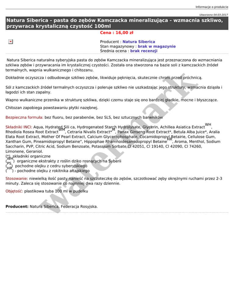 Informacje o produkcie Utworzono 04-03-2017 Natura Siberica - pasta do zębów Kamczacka mineralizująca - wzmacnia szkliwo, przywraca krystaliczną czystość 100ml Cena : 16,00 zł Producent : Natura Siberica Stan magazynowy : brak w magazynie Średnia ocena : brak recenzji Natura Siberica naturalna syberyjska pasta do zębów Kamczacka mineralizująca jest przeznaczona do wzmacniania szkliwa zębów i przywracania im krystalicznej czystości. Została ona stworzona na bazie soli z kamczackich źródeł termalnych, wapnia wulkanicznego i chitozanu. er m ar k Dokładnie oczyszcza i odbudowuje szkliwo zębów, likwiduje pęknięcia, skutecznie chroni przed próchnicą. Sól z kamczackich źródeł termalnych oczyszcza i poleruje szkliwo nie uszkadzając jego struktury, wzmacnia dziąsła i łagodzi ich stan zapalny. Wapno wulkaniczne przenika w strukturę szkliwa, dzięki czemu staje się ono bardziej gładkie, mocne i błyszczące. Chitozan zapobiega powstawaniu płytki nazębnej. Bezpieczna formuła: bez fluoru, bez parabenów, bez SLS, bez sztucznych barwników at WH Składniki INCI: Aqua, Hydrated Sili ca, Hydrogenated Starch Hydrolysate, Glycerin, Achillea Asiatica Extract , WM M Rhodiola Rosea Root Extract , Cetraria Nivalis Extract* , Panax Ginseng Root Extract*, Betula Alba Juice*, Aralia Elata Root Extract, Mother Of Pearl Extract, Calcium Glycerophosphate, Cocamidopropyl Betairie, Cellulose Gum, HR Xanthan Gum, Pineamidopropyl Betaine", Hippophae Rhamnoidesamidopropyl Betaine , Aroma, Menthol, Sodium Saccharin, PVP, Citric Acid, Sodium Benzoate, Potassium Sorbate,Cl 42051, Cl 19140, Cl 42090, Cl 74260, Limonene, Geraniol. (*) składniki organiczne WH ( ) organiczne ekstrakty z roślin dziko rosnących na Syberii PS ( ) pochodne olejku z cedru syberyjskiego HR ( ) - pochodne olejku z rokitnika ałtajskiego Stosowanie: niewielką ilość pasty nanieść na szczoteczkę do zębów, szczotkować zęby okrężnymi ruchami przez 2-3 minuty. Zaleca się stosowanie co najmniej dwa razy dziennie. w Objętość: plastikowa tuba 100 ml w pudełku Producent: Natura Siberica, Federacja Rosyjska.