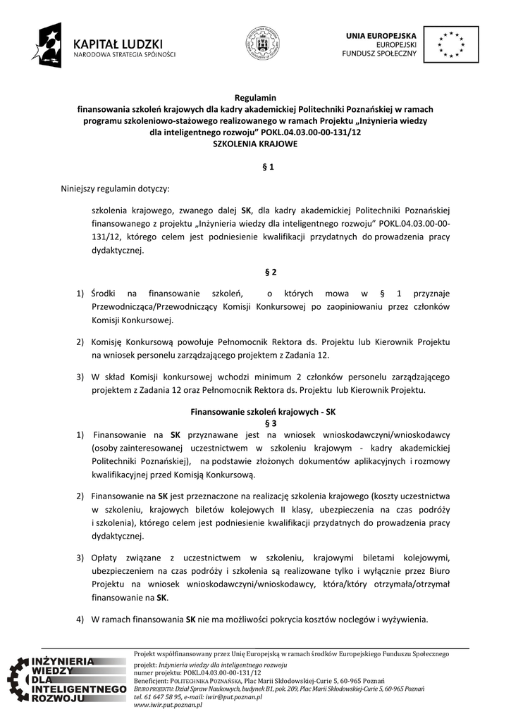 Regulamin finansowania szkoleń krajowych dla kadry akademickiej Politechniki Poznańskiej w ramach programu szkoleniowo-stażowego realizowanego w ramach Projektu „Inżynieria wiedzy dla inteligentnego rozwoju” POKL.04.03.00-00-131/12 SZKOLENIA KRAJOWE §1 Niniejszy regulamin dotyczy: szkolenia krajowego, zwanego dalej SK, dla kadry akademickiej Politechniki Poznańskiej finansowanego z projektu „Inżynieria wiedzy dla inteligentnego rozwoju” POKL.04.03.00-00131/12, którego celem jest podniesienie kwalifikacji przydatnych do prowadzenia pracy dydaktycznej. §2 1) Środki na finansowanie szkoleń, o których mowa w § 1 przyznaje Przewodnicząca/Przewodniczący Komisji Konkursowej po zaopiniowaniu przez członków Komisji Konkursowej. 2) Komisję Konkursową powołuje Pełnomocnik Rektora ds. Projektu lub Kierownik Projektu na wniosek personelu zarządzającego projektem z Zadania 12. 3) W skład Komisji konkursowej wchodzi minimum 2 członków personelu zarządzającego projektem z Zadania 12 oraz Pełnomocnik Rektora ds. Projektu lub Kierownik Projektu. Finansowanie szkoleń krajowych - SK §3 1) Finansowanie na SK przyznawane jest na wniosek wnioskodawczyni/wnioskodawcy (osoby zainteresowanej uczestnictwem w szkoleniu krajowym - kadry akademickiej Politechniki Poznańskiej), na podstawie złożonych dokumentów aplikacyjnych i rozmowy kwalifikacyjnej przed Komisją Konkursową. 2) Finansowanie na SK jest przeznaczone na realizację szkolenia krajowego (koszty uczestnictwa w szkoleniu, krajowych biletów kolejowych II klasy, ubezpieczenia na czas podróży i szkolenia), którego celem jest podniesienie kwalifikacji przydatnych do prowadzenia pracy dydaktycznej. 3) Opłaty związane z uczestnictwem w szkoleniu, krajowymi biletami kolejowymi, ubezpieczeniem na czas podróży i szkolenia są realizowane tylko i wyłącznie przez Biuro Projektu na wniosek wnioskodawczyni/wnioskodawcy, która/który otrzymała/otrzymał finansowanie na SK. 4) W ramach finansowania SK nie ma możliwości pokrycia kosztów noclegów i wyżywienia. Projekt współfinansowany przez Unię Europejską w ramach środków Europejskiego Funduszu Społecznego projekt: Inżynieria wiedzy dla inteligentnego rozwoju numer projektu: POKL.04.03.00-00-131/12 Beneficjent: POLITECHNIKA POZNAŃSKA, Plac Marii Skłodowskiej-Curie 5, 60-965 Poznań BIURO PROJEKTU: Dział Spraw Naukowych, budynek B1, pok. 209, Plac Marii Skłodowskiej-Curie 5, 60-965 Poznań tel. 61 647 58 95, e-mail: [email protected] www.iwir.put.poznan.pl 5) Rekrutacja na SK jest dwustopniowa, przy czym przez I stopień rekrutacji należy rozumieć złożenie kompletu poprawnie wypełnionych dokumentów, a przez II stopień rekrutacji należy rozumieć rozmowę kwalifikacyjną. 6) Lista wnioskodawców zakwalifikowanych do udziału w szkoleniu zostanie podana na stronie internetowej projektu: iwir.put.poznan.pl. 7) Wysokość finansowania na SK wynosi do 2 400,00 złotych wliczając podatki wynikające z obowiązujących krajowych przepisów prawa, związane z uczestnictwem w szkoleniu, zakup krajowych biletów kolejowych i ubezpieczenie na czas podróży i szkolenia. 8) W szczególnych przypadkach istnieje możliwość zwiększenia finansowania na SK z oszczędności powstałych w trakcie realizacji Projektu na pisemny wniosek z uzasadnieniem złożonym przez wnioskodawczynię/wnioskodawcę do Biura Projektu wraz z dokumentami niezbędnymi do I etapu rekrutacji. Proces rekrutacji §4 1) Członkowie personelu zarządzającego projektem wchodzący w skład Komisji Konkursowej po zaopiniowaniu kandydatów na SK przekazują listę wnioskodawców (lista główna i lista rezerwowa) do ostatecznej akceptacji Przewodniczącej/Przewodniczącemu Komisji Konkursowej w terminie 2 dni roboczych. 2) Przewodnicząca/Przewodniczący Komisji Konkursowej zatwierdza listę wnioskodawców (lista główna i lista rezerwowa) w terminie 2 dni roboczych. 3) Wnioskodawcom przysługuje możliwość odwołania się od decyzji o nie przyznaniu finansowania na SK w formie pisemnej (przedmiotowe odwołanie należy złożyć w formie pisemnej w terminie 2 dni roboczych od ogłoszenia wyników rekrutacji I lub II stopnia) w Biurze Projektu, którego adres jest dostępny na stronie internetowej projektu: iwir.put.poznan.pl. 4) Przewodnicząca/Przewodniczący Komisji Konkursowej podejmuje decyzję o przywróceniu danych Wnioskodawców do I lub II stopnia rekrutacji i informuje o tym poprzez e-mail w terminie 2 dni roboczych. 5) Wnioskodawcom przysługuje możliwość odwołania się od decyzji o nie przyznaniu finansowania na SK tylko jeden raz na I etapie rekrutacji i jeden raz na II etapie rekrutacji. 6) W procesie rekrutacji na szkolenia preferowane będą kobiety i osoby w wieku 45+. Projekt współfinansowany przez Unię Europejską w ramach środków Europejskiego Funduszu Społecznego projekt: Inżynieria wiedzy dla inteligentnego rozwoju numer projektu: POKL.04.03.00-00-131/12 Beneficjent: POLITECHNIKA POZNAŃSKA, Plac Marii Skłodowskiej-Curie 5, 60-965 Poznań BIURO PROJEKTU: Dział Spraw Naukowych, budynek B1, pok. 209, Plac Marii Skłodowskiej-Curie 5, 60-965 Poznań tel. 61 647 58 95, e-mail: [email protected] www.iwir.put.poznan.pl Postanowienia końcowe §5 1) Wnioskodawcy przez podpisanie deklaracji uczestnictwa w Projekcie akceptują warunki niniejszego regulaminu. 2) Aktualna treść Regulaminu znajduje się w Biurze Projektu, którego adres jest dostępny na stronie internetowej projektu: www.iwir.put.poznan.pl oraz w miejscu rekrutacji na szkolenia krajowe. 3) Regulamin wchodzi w życie z dniem 22 kwietnia 2014 roku. Projekt współfinansowany przez Unię Europejską w ramach środków Europejskiego Funduszu Społecznego projekt: Inżynieria wiedzy dla inteligentnego rozwoju numer projektu: POKL.04.03.00-00-131/12 Beneficjent: POLITECHNIKA POZNAŃSKA, Plac Marii Skłodowskiej-Curie 5, 60-965 Poznań BIURO PROJEKTU: Dział Spraw Naukowych, budynek B1, pok. 209, Pla