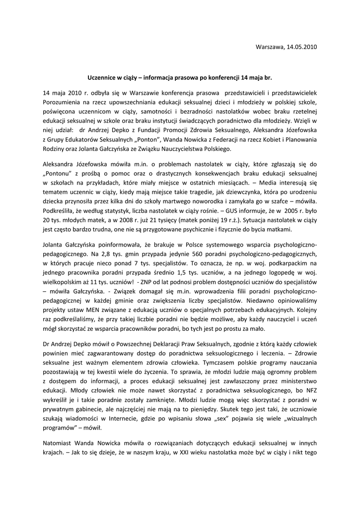 Warszawa, 14.05.2010 Uczennice w ciąży – informacja prasowa po konferencji 14 maja br. 14 maja 2010 r. odbyła się w Warszawie konferencja prasowa przedstawicieli i przedstawicielek Porozumienia na rzecz upowszechniania edukacji seksualnej dzieci i młodzieży w polskiej szkole, poświęcona uczennicom w ciąży, samotności i bezradności nastolatków wobec braku rzetelnej edukacji seksualnej w szkole oraz braku instytucji świadczących poradnictwo dla młodzieży. Wzięli w niej udział: dr Andrzej Depko z Fundacji Promocji Zdrowia Seksualnego, Aleksandra Józefowska z Grupy Edukatorów Seksualnych „Ponton”, Wanda Nowicka z Federacji na rzecz Kobiet i Planowania Rodziny oraz Jolanta Gałczyoska ze Związku Nauczycielstwa Polskiego. Aleksandra Józefowska mówiła m.in. o problemach nastolatek w ciąży, które zgłaszają się do „Pontonu” z prośbą o pomoc oraz o drastycznych konsekwencjach braku edukacji seksualnej w szkołach na przykładach, które miały miejsce w ostatnich miesiącach. – Media interesują się tematem uczennic w ciąży, kiedy mają miejsce takie tragedie, jak dziewczynka, która po urodzeniu dziecka przynosiła przez kilka dni do szkoły martwego noworodka i zamykała go w szafce – mówiła. Podkreśliła, że według statystyk, liczba nastolatek w ciąży rośnie. – GUS informuje, że w 2005 r. było 20 tys. młodych matek, a w 2008 r. już 21 tysięcy (matek poniżej 19 r.ż.). Sytuacja nastolatek w ciąży jest często bardzo trudna, one nie są przygotowane psychicznie i fizycznie do bycia matkami. Jolanta Gałczyoska poinformowała, że brakuje w Polsce systemowego wsparcia psychologicznopedagogicznego. Na 2,8 tys. gmin przypada jedynie 560 poradni psychologiczno-pedagogicznych, w których pracuje nieco ponad 7 tys. specjalistów. To oznacza, że np. w woj. podkarpackim na jednego pracownika poradni przypada średnio 1,5 tys. uczniów, a na jednego logopedę w woj. wielkopolskim aż 11 tys. uczniów! - ZNP od lat podnosi problem dostępności uczniów do specjalistów – mówiła Gałczyoska. - Związek domagał się m.in. wprowadzenia filii poradni psychologicznopedagogicznej w każdej gminie oraz zwiększenia liczby specjalistów. Niedawno opiniowaliśmy projekty ustaw MEN związane z edukacją uczniów o specjalnych potrzebach edukacyjnych. Kolejny raz podkreślaliśmy, że przy takiej liczbie poradni nie będzie możliwe, aby każdy nauczyciel i uczeo mógł skorzystad ze wsparcia pracowników poradni, bo tych jest po prostu za mało. Dr Andrzej Depko mówił o Powszechnej Deklaracji Praw Seksualnych, zgodnie z którą każdy człowiek powinien mied zagwarantowany dostęp do poradnictwa seksuologicznego i leczenia. – Zdrowie seksualne jest ważnym elementem zdrowia człowieka. Tymczasem polskie programy nauczania pozostawiają w tej kwestii wiele do życzenia. To sprawia, że młodzi ludzie mają ogromny problem z dostępem do informacji, a proces edukacji seksualnej jest zawłaszczony przez ministerstwo edukacji. Młody człowiek nie może nawet skorzystad z poradnictwa seksuologicznego, bo NFZ wykreślił je i takie poradnie zostały zamknięte. Młodzi ludzie mogą więc skorzystad z poradni w prywatnym gabinecie, ale najczęściej nie mają na to pieniędzy. Skutek tego jest taki, że uczniowie szukają wiadomości w Internecie, gdzie po wpisaniu słowa „sex” pojawia się wiele „wizualnych programów” – mówił. Natomiast Wanda Nowicka mówiła o rozwiązaniach dotyczących edukacji seksualnej w innych krajach. – Jak to się dzieje, że w naszym kraju, w XXI wieku nastolatka może byd w ciąży i nikt tego przez 9 miesięcy nie dostrzega. To zjawisko pokazuje, że mamy w Polsce poważny problem. Rząd od wielu lat nie robi nic, by pomóc młodym ludziom, łamie prawo nie zapewniając im rzetelnej edukacji seksualnej. Od lat także RE i ONZ zalecają nam wprowadzenie programów z zakresu wychowania seksualnego. W większości krajów UE młodzi ludzie mają dostęp do tzw. poradni przyjaznych młodzieży, w których pracują specjaliści przygotowani do rozmów z nastolatkami oraz do edukacji seksualnej w szkołach i to już od najmłodszych lat – podkreślała. Dodała, że w Polsce liczba młodych matek nie pokrywa się z liczbą ciąż. – Tych ostatnich może byd znacznie więcej, ponieważ nie mamy danych ile nastolatek przerwało ciążę. Dane mówią jedynie o liczbie matek – mówiła. Porozumienie na rzecz upowszechniania edukacji seksualnej dzieci i młodzieży w polskiej szkole zostało związane w styczniu 2009 r. Jego sygnatariuszami są m.in.: Federacja na rzecz Kobiet i Planowania Rodziny, Fundacja Dzieci Niczyje, Fundacja Promocji Zdrowia Seksualnego, Gender Studies UW, Grupa Edukatorów Seksualnych "Ponton”, Polskie Centrum Zdrowia Seksualnego (Londyn), Stowarzyszenie "W stronę dziewcząt", Towarzystwo Rozwoju Rodziny, Związek Nauczycielstwa Polskiego oraz dr Andrzej Depko, dr Alicja Długołęcka, prof. Zbigniew Izdebski, prof. Stanisław Obirek, prof. Zbigniew Lew-Starowicz i prof. Magdalena Środa.