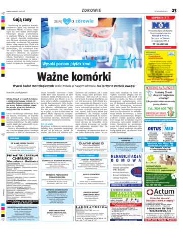 z drowi e www.nowosci.com.pl 27 grudnia 2013 SUPEROFERTA Goją rany Trombocyty to podłużne komórki, pozbawione jądra. Gdy dochodzi do uszkodzenia tkanki, w osoczu rozpoczyna się seria reakcji chemicznych. Fibrynogen zostaje przekształcony w cząsteczki fibryny, te zaś zlepiają się, tworząc siateczkę zasklepiającą ranę. W siatce tej zostają umieszczone erytrocyty i trombocyty. Tak powstaje skrzep, który czopuje ranę. Płytki krwi nie przypominają ani białych krwinek (leukocytów), ani czerwonych krwinek (erytrocytów). Każdy przypadek wyraźnego obniżenia się poziomu płytek krwi wymaga pilnej konsultacji lekarza. Szczególnie niepokojące są pojawienie się wybroczyn na skórze i znaczne obniżenie się liczby krwinek białych lub poziomu hemoglobiny. 56 6235605 www.przychodnia.torun.pl REZONANS MAGNETYCZNY TOMOGRAFIA KOMPUTEROWA Ważne komórki DZIŚ TELEFON - DZIŚ BADANIE www.tomograf.torun.pl Wyniki badań morfologicznych wiele mówią o naszym zdrowiu. Na co warto zwrócić uwagę? Jest ich wiele W jednym milimetrze sześciennym ludzkiej krwi powinno znajdować się od 150 do 400 tys. płytek. To ważne, aby było ich właśnie tyle. DIETETYKA CHIRURGIA DOM SENIORA AS GERIATRIA walka z nadwagą i otyłością, odchudzanie bez efektu jojo, zdrowe odchudzanie Toruń, ul. Panny Marii 3, tel. 56 622 55 25 1646813BDBHB 315313T2BBB Specjalista chirurg Kamica pęcherzyka żółciowego, przepukliny, operacje laparoskopowe, konsultacje Tel. 605-379-491 www.chirurgzalucki.pl 2008212TRTHA DR N.MED. MAREK ZAŁUCKI 317713T2BBA 2006712TRTHA „DOKTOR” PODGÓRNA 12 www.zdrowiedlatorunia.pl UMAWIANIE WIZYT tel. 606-364-342 1190113TRTHA chirurgia neurochirurgia naczyniowa neurologia chirurgia reumatologia ortopedia urologia rehabilitacja fizykoterapia Rejestracja kom. 781 997 899, 883-666-659, tel. 56 621 11 83 DOM ZDROWIA, III PIĘTRO ul. Szosa Chełmińska 84/86 www.ortusmed.pl Schorzenia Kręgosłupa Lekarz Adam Madarasz rej. 603-675-001 Utraciłeś zdrowie? Straciłeś członka rodziny? • wypadki komunikacyjne • wypadki przy pracy, w gosp. rolnym • inne szkody osobowe i majątkowe POMAGAMY UZYSKAĆ ODSZKODOWANIE 1678713BDBHB 2023512TRBRA 318913T2BBA 1415713TRBRA C M Y K Prywatne Centrum Ortopedii i Rehabilitacji LEKARSKI GABINET ZWALCZANIA BÓLU NATYCHMIASTOWA POMOC PROTETYCZNA, Wyszyńskiego 11a/61. 56/645-45-72. ODCHUDZAMY TORUŃ POWIEDZ ZNAJOMYM!!! 39zł EKO-MED Prywatna Poradnia Chirurgiczna dr n. med. Krzysztof Kroina - Porady i zabiegi chirurgiczne - Leczenie ran przewlekłych - Diagnostyka USG + Doppler - Diagnostyka przewodu pokarmowego - Dermatologia estetyczna: botox, kwas hialuronowy. 503-199-743, www.ekomed.webege.com Tel. 500 603 705 - ćwiczenia indywidualne - metody specjalne (PNF, Bobath) - masaże lecznicze koszt wizyty - drenaż limfatyczny - zabiegi fizykalne 215913T3BKA TORUŃ ul. Wielkie Garbary 15 tel. 56 62 10 597; kom. 785 109 291 Rejestracja: www.gamadent.net NAJLEPSZE ZNIECZULENIA NAJTAŃSZE PROTEZY BEZPŁATNE PRZEGLĄDY 2001212TRTHA 2023412TRBRC nowości CENTRUM STOMATOLOGII I PROTETYKI GAMADENT 316813T2BBB 61013TRTHA MAREK STRAWIŃSKI Operacje ortopedyczne. Konsultacje. Gabinet Toruń, ul. Bartkiewiczówny 89 Tel. 603-607-202; www.strawinski-ortopeda.pl Tylko poważnie zainteresowane osoby prosimy o kontakt: REHABILITACJA D O M O W A ZESPOŁY LEKARSKIE 56/639-43-30; 509-370-706 KARDIOLOG, PSYCHOLOG, USG, DOPPLER, ECHO SERCA, CHIRURG, UROLOG, TRUDNO GOJĄCE RANY, CHRAPANIE, BEZDECH www.doktor.net.pl Profesjonalne leczenie i rehabilitacja dla seniorów! Kompleksowa opieka zdrowotna! „Solanki” Uzdrowisko Inowrocław Sp. z o.o. ul. Solankowa 77, 88-100 Inowrocław tel. 52 35 63 283 lub 52 35 63 287 www.solanki.pl Szukamy 25 osób chcących bezpiecznie schudnąć! 2011812TRTHA Lekarz nie tylko go osłuchuje. Bada też brzuch. Stwierdza, że wątroba jest powiększona. Zleca badania morfologiczne. Jednym z badań jest poziom płytek krwi. To, jaki wyjdzie wynik, może dać odpowiedź na pytanie, na co choruje. Krew to płynna tkanka składająca się z bezbarwnego płynu zwanego osoczem, w którym zawieszone są szym ciele znajduje się wiele narządów. Czasami ulegają one mikrouszkodzeniom. Jeśli płytek krwi będzie za mało, nie będą w stanie zaczopować uszkodzonego miejsca. W skrajnych wypadkach może dojść do krwawienia wewnątrz ciała, które może być bardzo niebezpieczne. Największym zagrożeniem jest krwawienie do ośrodkowego układu nerwowego, a także do układu pokarmowego. Nieprawidłowe wyniki poziomu płytek krwi mogą być wynikiem choroby wirusowej, zażywania niektórych leków. Narażenia na promieniowanie lub niektóre substancje chemiczne. Lekarz analizuje nie tylko liczbę płytek krwi, ale również inne wyniki morfologii. 99013BIBIB Młody chłopak przyszedł do lekarza z podejrzeniem grypy. Jednak nie wszystkie objawy wskazują na to, że ma grypę. Bolą go mięśnie, stawy. Ma wysoka gorączkę. Jednak nie boli gardło i nie ma kataru. Zarówno ich nadmiar, jak i mała liczba, mogą mieć poważne konsekwencje. Jeśli jest ich za dużo, krew może krzepnąć zbyt łatwo, co nie jest korzystne. Jeśli płytek brakuje, pojawiają się kłopoty z krzepnięciem. Oczywiście do tego, aby krew zakrzepła potrzebne są jeszcze inne czynniki. Ważne jest osocze. Nawet, jeśli liczna płytek jest prawidłowa, ale brakuje innych czynników potrzebnych do wytworzenia skrzepu z osocza, krew nie krzepnie. To właśnie problem osób, które cierpią na hemofilię. Krew może dłużej krzepnąć też wtedy, gdy zażywamy niektóre leki. Na przykład aspirynę. Problemy z krzepnięciem krwi to nie tylko skaleczony palec. W na- SCHUDNIJ NA ZAWSZE !!! 1180513BDBHB liczne komórki: czerwone i białe ciałka krwi oraz wyraźnie od nich mniejsze płytki. Podstawowym zadaniem płytek jest dbanie o to, by krew nie wyciekała z uszkodzonych naczyń krwionośnych. Gdy dochodzi do uszkodzenia, płytki pełnią rolę plastra, z