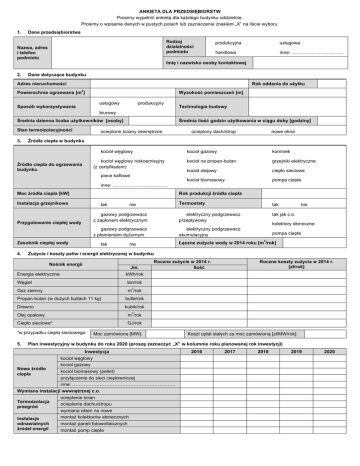 ANKIETA DLA PRZEDSIĘBIORSTW Prosimy wypełnić ankietę dla każdego budynku oddzielnie. Prosimy o wpisanie danych w pustych polach lub zaznaczenie znakiem „X” na liście wyboru. 1. Dane przedsiębiorstwa Rodzaj działalności podmiotu Nazwa, adres i telefon podmiotu produkcyjna usługowa handlowa inne: …………………………... Imię i nazwisko osoby kontaktowej 2. Dane dotyczące budynku Adres nieruchomości Rok oddania do użytku 2 Powierzchnia ogrzewana [m ] Wysokość pomieszczeń [m] usługowy Sposób wykorzystywania produkcyjny Technologia budowy biurowy Średnia dzienna liczba użytkowników [osoby] Stan termoizolacyjności 3. Średnia ilość godzin użytkowania w ciągu doby [godziny] ocieplone ściany zewnętrzne ocieplony dach/strop nowe okna Źródła ciepła w budynku kocioł węglowy kocioł węglowy niskoemisyjny (z certyfikatem) Źródło ciepła do ogrzewania budynku piece kaflowe kocioł gazowy kominek kocioł na propan-butan grzejniki elektryczne kocioł olejowy ciepło sieciowe kocioł biomasowy pompa ciepła inne: ………………...………….. Moc źródła ciepła [kW] Rok produkcji źródła ciepła Instalacja grzejnikowa Przygotowanie ciepłej wody Zasobnik ciepłej wody 4. Termostaty tak gazowy podgrzewacz z zapłonem elektrycznym elektryczny podgrzewacz przepływowy tak jak c.o. gazowy podgrzewacz z płomieniem dyżurnym elektryczny podgrzewacz akumulacyjny tak nie tak kolektory słoneczne pompa ciepła 3 Łączne zużycie wody w 2014 roku [m /rok] nie Zużycie i koszty paliw i energii elektrycznej w budynku Nośnik energii Jm. Energia elektryczna Roczne zużycie w 2014 r. Ilość Roczne koszty zużycia w 2014 r. [zł/rok] kWh/rok Węgiel ton/rok Gaz ziemny m /rok 3 Propan-butan (w dużych butlach 11 kg) butle/rok Drewno kubik/rok 3 Olej opałowy m /rok Ciepło sieciowe* GJ/rok *w przypadku ciepła sieciowego 5. nie Moc zamówiona [MW]: Koszt opłat stałych za moc zamówioną [zł/MW/rok]: Plan inwestycyjny w budynku do roku 2020 (proszę zaznaczyć „X” w kolumnie roku planowanej rok inwestycji) Inwestycja Nowe źródło ciepła kocioł węglowy kocioł gazowy kocioł biomasowy (pellet) przyłączenie do sieci ciepłowniczej inne: ………………………………………………………. Wymiana instalacji wewnętrznej c.o. ocieplenie ścian Termoizolacja ocieplenie dachu/stropu przegród wymiana okien na nowe montaż kolektorów słonecznych Instalacje odnawialnych źródeł energii montaż paneli fotowoltaicznych montaż pomp ciepła 2016 2017 2018 2019 2020 6. Użytkowane pojazdy Samochody osobowe Ilość [szt.] Samochody dostawcze Ilość [szt.] 7. Średnie miesięczne zużycie paliwa [l] Średnie miesięczne zużycie paliwa [l] ON LPG benzyna ON LPG Instalacje odnawialnych źródeł energii w przedsiębiorstwie 2 Ilość [szt.] Kolektory słoneczne Typ Łączna powierzchnia czynna [m ] płaskie płaskie próżniowe Panele fotowoltaiczne Pompy ciepła Typ rurowe próżniowe Łączna powierzchnia czynna [m ] monokrystaliczne Ilość [szt.] Moc [kW] 2 Ilość [szt.] 8. benzyna polikrystaliczne Moc [kW] Typ Moc [kW] amorficzne powietrze - woda solanka - woda Instalacje technologiczne w przedsiębiorstwie: zużycie i koszty paliw i energii elektrycznej Nośnik energii Roczne zużycie w 2014 r. Ilość Jm. Energia elektryczna Roczne koszty zużycia w 2014 r. [zł/rok] kWh/rok Węgiel ton/rok Gaz ziemny m /rok 3 Propan-butan (w dużych butlach 11 kg) butle/rok Drewno kubik/rok 3 Olej opałowy m /rok Ciepło sieciowe* GJ/rok *w przypadku energii elektrycznej Moc zamówiona [MW]: Koszt opłat stałych za moc zamówioną [zł/MW/rok]: **w przypadku ciepła sieciowego Moc zamówiona [MW]: Koszt opłat stałych za moc zamówioną [zł/MW/rok]: 9. woda - woda Instalacje technologiczne w przedsiębiorstwie: krótka charakterystyka Proszę podać krótki opis instalacji pracujących dla potrzeb przedsiębiorstwa, w szczególności: a) funkcję / przeznaczenie, b) wydajność / przerób (w ujęciu dobowym i rocznym), c) sposób zagospodarowania produktów ubocznych, d) zainstalowane urządzenia ochrony środowiska (np. odpylające, odsiarczające itp.) i ich sprawność, e) opis urządzeń wpływających na ochronę klimatu / racjonalne użytkowanie energii (np. urządzenia do odzysku biogazu). 10. Instalacje technologiczne w przedsiębiorstwie: plan inwestycyjny (jeśli dotyczy) Ogólny zakres rzeczowy (np. wymiana urządzeń, budowa nowej linii technologicznej itp.) Planowany rok (lata) realizacji Szacunkowe nakłady [tys. zł] Źródło finansowania Szacunkowe zużycie nośników energii po realizacji inwestycji (proszę podać rodzaj, jednostkę i ilość) Wypełniający ankietę oświadcza, że wyraża zgodę na przetwarzanie danych osobowych dla celów opracowania Planu Gospodarki Niskoemisyjnej dla Gminy Szczyrk, zgodnie z ustawą z dnia 29 sierpnia 1997 r. o ochronie danych osobowych (tj. Dz. U. Nr 101 z 2002 r., poz. 926 z późn. zm.)