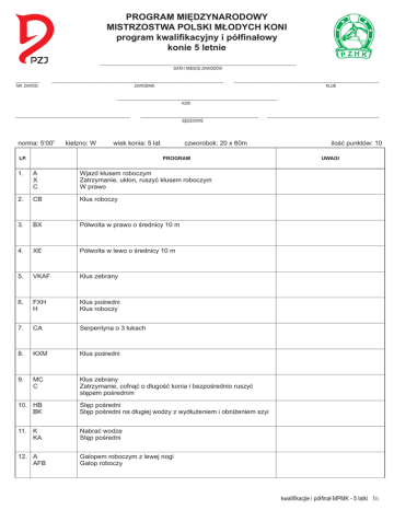 PROGRAM MIĘDZYNARODOWY MISTRZOSTWA POLSKI MŁODYCH KONI program kwalifikacyjny i półfinałowy konie 5 letnie _________________________________________________________________ DATA I MIESCE ZAWODÓW ________ _________________________________________________________ NR. ZAWOD. ________________________________________________ ZAWODNIK KLUB _____________________________________________________ ______________________________________ KOŃ _______________________________________ norma: 5’00” kiełzno: W SĘDZIOWIE wiek konia: 5 lat LP. _____________________________________ czworobok: 20 x 60m PROGRAM 1. A X C Wjazd kłusem roboczym Zatrzymanie, ukłon, ruszyć kłusem roboczym W prawo 2. CB Kłus roboczy 3. BX Półwolta w prawo o średnicy 10 m 4. XE Półwolta w lewo o średnicy 10 m 5. VKAF Kłus zebrany 6. FXH H Kłus pośredni Kłus roboczy 7. CA Serpentyna o 3 łukach 8. KXM Kłus pośredni 9. MC C Kłus zebrany Zatrzymanie, cofnąć o długość konia i bezpośrednio ruszyć stępem pośrednim 10. HB BK Stęp pośredni Stęp pośredni na długiej wodzy z wydłużeniem i obniżeniem szyi 11. K KA Nabrać wodze Stęp pośredni 12. A AFB Galopem roboczym z lewej nogi Galop roboczy ilość punktów: 10 UWAGI kwalifikacjie i półfinał MPMK - 5 latki 1/3 13. BRSE E Galopem pośrednim, pomiędzy R i S pół koła o średnicy 20 m Galopem zebranym 14. KDE Półwolta o średnicy 10 m, powrócić na ślad w E 15. EH Kontrgalop Zwykła zmiana nogi Przed H 16. ME Zmiana kierunku 17. EK K Kontrgalop Kłus roboczy 18. KAFP PV Kłus roboczy Pół koła o średnicy 20 m w kłusie anglezowanym na długiej wodzy z wydłużeniem i obniżeniem szyi Nabrać wodze Pomiędzy 19. A X ViK Na linię środkową Zatrzymanie, nieruchomość, ukłon Opuścić czworobok stępem na długiej wodzy w A Pomyłki: 1-sza - 0,1 pkt. 2-ga - 0,2 pkt. 3-cia - eliminacja kwalifikacjie i półfinał MPMK - 5 latki 2/3 ARKUSZ DO WPISYWANIA WYNIKÓW KONKURSÓW MPMK KRYTERIA OCENY UWAGI KOMISJI OCENY KOMISJI*) STĘP • Takt • Aktywność • Obszerność wykroku • Umiejętność skrócenia i wydłużenia chodu, KŁUS • Takt • Równowaga (samoniesienie) • Ekspresja i rozluźnienie grzbietu • Impuls, zarówno w skróceniach, jak i dodaniach • Zaangażowanie zadu i elastyczność kroków • Dążność do ruchu naprzód (wyrażona przez tendencję do krycia przestrzeni) GALOP • Takt • Akceptacja wędzidła i rozluźnienie w potylicy • Równowaga (samoniesienie) • Ekspresja i rozluźnienie grzbietu • Zaangażowanie zadu i elastyczność kroków • Dążność do ruchu naprzód POTENCJAŁ PRZYSZŁEGO KONIA UJEŻDŻENIOWEGO • Posłuszeństwo • Zdolności • Impuls, giętkość • Ruchliwość i lekkość przodu • Swoboda, rozluźnienie, atletyzm • Potencjał do zebrania WRAŻENIE OGÓLNE Oprócz chodów i standardu wyszkolenia sędziowie muszą ocenić, czy koń posiada wystarczający naturalny talent, aby osiągnąć wyższy poziom ujeżdżenia. Wrażenie ogólne opiera się na: • Standardzie wyszkolenia zgodnie ze skalą wyszkolenia, w tym jakości chodów, rozluźnieniu, łatwości i płynności wykonywania ćwiczeń. • Potencjale i predyspozycjach konia do treningu ujeżdżeniowego. Odpowiedni koń ujeżdżeniowy charakteryzuje się właściwym temperamentem, budową i ekspresją. Maść i wzrost konia nie są brane pod uwagę. WYNIK (Oceną końcową jest suma punktów za wszystkie elementy podzielona przez 5, podana z dokładnością do 0,01. Punkty za ew. pomyłki odejmowane są od oceny końcowej.) *) oceny cząstkowe podawane są z dokładnością do 0,1 punktu _______________________________________ podpis Komisji Sędziowskiej Wydanie FEI 2009. Aktualizacja 2014 r. kwalifikacjie i półfinał MPMK - 5 latki 3/3