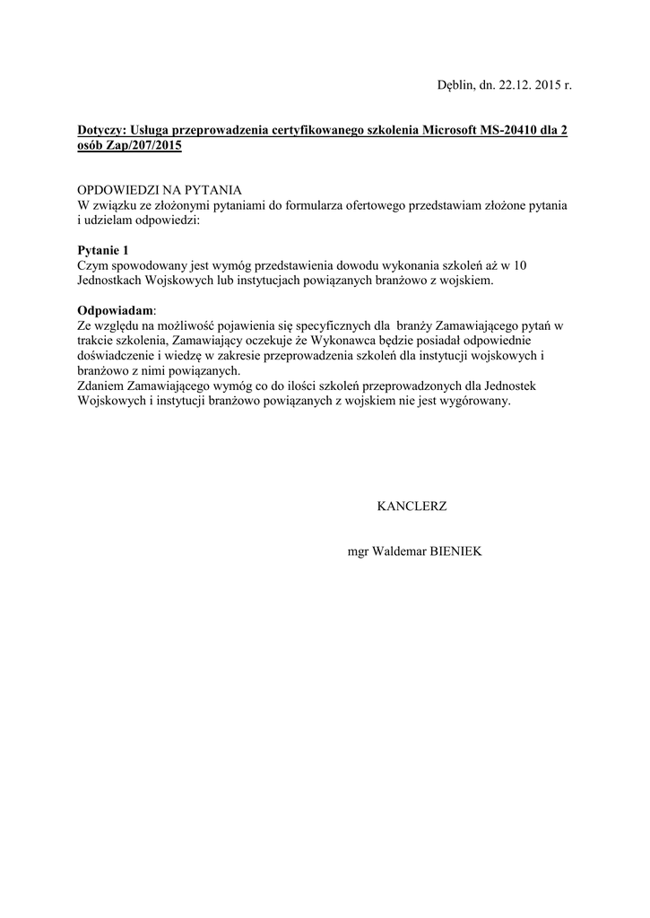 Dęblin, dn. 22.12. 2015 r. Dotyczy: Usługa przeprowadzenia certyfikowanego szkolenia Microsoft MS-20410 dla 2 osób Zap/207/2015 OPDOWIEDZI NA PYTANIA W związku ze złożonymi pytaniami do formularza ofertowego przedstawiam złożone pytania i udzielam odpowiedzi: Pytanie 1 Czym spowodowany jest wymóg przedstawienia dowodu wykonania szkoleń aż w 10 Jednostkach Wojskowych lub instytucjach powiązanych branżowo z wojskiem. Odpowiadam: Ze względu na możliwość pojawienia się specyficznych dla branży Zamawiającego pytań w trakcie szkolenia, Zamawiający oczekuje że Wykonawca będzie posiadał odpowiednie doświadczenie i wiedzę w zakresie przeprowadzenia szkoleń dla instytucji wojskowych i branżowo z nimi powiązanych. Zdaniem Zamawiającego wymóg co do ilości szkoleń przeprowadzonych dla Jednostek Wojskowych i instytucji branżowo powiązanych z wojskiem nie jest wygórowany. KANCLERZ mgr Waldemar BIENIEK