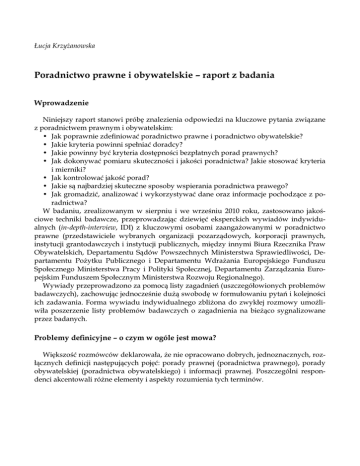Łucja Krzyżanowska Poradnictwo prawne i obywatelskie – raport z badania Wprowadzenie Niniejszy raport stanowi próbę znalezienia odpowiedzi na kluczowe pytania związane z poradnictwem prawnym i obywatelskim: • Jak poprawnie zdefiniować poradnictwo prawne i poradnictwo obywatelskie? • Jakie kryteria powinni spełniać doradcy? • Jakie powinny być kryteria dostępności bezpłatnych porad prawnych? • Jak dokonywać pomiaru skuteczności i jakości poradnictwa? Jakie stosować kryteria i mierniki? • Jak kontrolować jakość porad? • Jakie są najbardziej skuteczne sposoby wspierania poradnictwa prawego? • Jak gromadzić, analizować i wykorzystywać dane oraz informacje pochodzące z poradnictwa? W badaniu, zrealizowanym w sierpniu i we wrześniu 2010 roku, zastosowano jakościowe techniki badawcze, przeprowadzając dziewięć eksperckich wywiadów indywidualnych (in-depth-interview, IDI) z kluczowymi osobami zaangażowanymi w poradnictwo prawne (przedstawiciele wybranych organizacji pozarządowych, korporacji prawnych, instytucji grantodawczych i instytucji publicznych, między innymi Biura Rzecznika Praw Obywatelskich, Departamentu Sądów Powszechnych Ministerstwa Sprawiedliwości, Departamentu Pożytku Publicznego i Departamentu Wdrażania Europejskiego Funduszu Społecznego Ministerstwa Pracy i Polityki Społecznej, Departamentu Zarządzania Europejskim Funduszem Społecznym Ministerstwa Rozwoju Regionalnego). Wywiady przeprowadzono za pomocą listy zagadnień (uszczegółowionych problemów badawczych), zachowując jednocześnie dużą swobodę w formułowaniu pytań i kolejności ich zadawania. Forma wywiadu indywidualnego zbliżona do zwykłej rozmowy umożliwiła poszerzenie listy problemów badawczych o zagadnienia na bieżąco sygnalizowane przez badanych. Problemy definicyjne – o czym w ogóle jest mowa? Większość rozmówców deklarowała, że nie opracowano dobrych, jednoznacznych, rozłącznych definicji następujących pojęć: porady prawnej (poradnictwa prawnego), porady obywatelskiej (poradnictwa obywatelskiego) i informacji prawnej. Poszczególni respondenci akcentowali różne elementy i aspekty rozumienia tych terminów. 12 Łucja Krzyżanowska Poradnictwo prawne Rozważając poradnictwo prawne, mocno podkreślano, że są to fachowe porady udzielane przez osoby kompetentne, które mają udokumentowaną dyplomem wiedzę (prawnicy, adwokaci, radcowie prawni, studenci prawa pod nadzorem profesorów). Wyraźnie akcentowano również konkretność (rzeczowość) porady prawnej, która nie może być abstrakcyjna, ale musi być mocno osadzona w określonych realiach, zindywidualizowana, skupiona na konkretnej osobie i sytuacji. W ramach porady klient dowiaduje się, w jaki sposób i przy użyciu jakich narzędzi prawnych może rozwiązać swój problem (poprowadzić swoją sprawę). Zdarzały się również opinie, w których podkreślano problemy, jakich zwykle dotyczą porady: nieskomplikowane kwestie prawne, wstępny etap sprawy, poradnictwo dotyczące spraw codziennych (prawo pracy, problemy związane z mieszkaniami, prawo rodzinne i alimentacyjne, zaopatrzenie społeczne: renty, emerytury, relacje z administracją). Niektórzy rozmówcy zwracali szczególną uwagę na to, że cechą porady prawnej jest brak możliwości reprezentowania klienta w sądzie przez osobę udzielającą porady. Sporo miejsca poświęcono także kwestii finansowania poradnictwa. Rozmówcy podkreślali, że poradnictwo nie musi – choć oczywiście może być – bezpłatne. Jest to pomoc nieodpłatna z punktu widzenia beneficjenta, co nie oznacza, że musi być jednak świadczona charytatywnie. Rolą państwa jest znalezienie środków na finansowanie tej pomocy. Jeden z badanych zaproponował wprowadzenie rozróżnienia na poradę prawną i pomoc prawną. Porada prawna miałaby być pomocą przedsądową, gdy spór nie jest jeszcze zinstytucjonalizowany. Byłaby to również porada zindywidualizowana, oparta na konkretnych przepisach osadzonych w określonych realiach. Z kolei pomoc prawna miałaby obejmować reprezentację klienta przed sądem i wymagałaby od osoby ją świadczącej znacznie większych kwalifikacji niż wystarczające do udzielania porady prawnej. Najważniejsze cechy porady prawnej: • nieodpłatna, • udzielana przez specjalistę, • zindywidualizowana, • konkretna, • niebędąca reprezentacją przed sądem, • często dotycząca codziennych, niezbyt skomplikowanych spraw. Rozmówcy wspominali także o szerszym znaczeniu poradnictwa prawnego. Wielu obywateli, gdyby nie miało możliwości skorzystania z bezpłatnej porady, w ogóle nie zdawałoby sobie sprawy z tego, że ma do czegoś prawo. Poradnictwo buduje zatem obywatelskie społeczeństwo otwarte, w którym ludzie się dowiadują, że mają nie tylko prawa, ale także obowiązki. Poza prowadzeniem działalności informacyjnej i rozwiązywaniem problemów biura porad propagują prawo i edukują społeczeństwo. Poradnictwo prawne może i powinno pełnić również funkcję edukacyjną – kształtować świadomość prawną i informować obywateli, a nie tylko rozwiązywać ich problemy. Według jednego z badanych, poradnictwo prawne można potraktować jako profilaktykę, przyjmując następujące założenie: jeśli w odpowiednim momencie obywatel zdobędzie wiedzę, to w przyszłości nie popełni błędów. Poradnictwo prawne i obywatelskie – raport z badania 13 Poradnictwo prawne ma także szansę zmienić stan, który od dłuższego czasu można obserwować w Polsce: Polacy mają niską wiedzę i świadomość prawną, co prowadzi do braku zaufania do zawodów prawniczych, to zaś przekłada się na niską wiedzę. Szeroki dostęp do porad prawnych może przełamać to niewłaściwe rozumowanie. Informacja prawna Przez udzielenie informacji prawnej rozmówcy rozumieli udzielenie podstawowych informacji (jakie przepisy regulują określony obszar problemowy, do jakiego sądu
