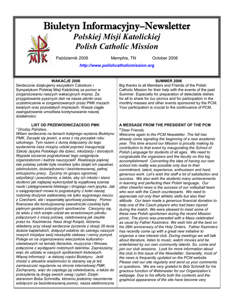 Biuletyn Informacyjny–Newsletter Polskiej Misji Katolickiej Polish Catholic Mission Październik 2006 Memphis, TN October 2006 http://www.polishcatholicmission.org WAKACJE 2006 Serdecznie dziękujemy wszystkim Członkom i Sympatykom Polskiej Misji Katolickiej za pomoc w zorganizowaniu naszych wakacyjnych imprez. Za przygotowanie pysznych dań na nasze pikniki oraz uczestniczenie w zorganizowanych przez PMK mszach świętych oraz pozostałych imprezach. Wasze ciągłe zaangażowanie umożliwia kontynuowanie naszej działalności. SUMMER 2006 Big thanks to all Members and Friends of the Polish Catholic Mission for their help with the events of the past Summer. Especially for preparation of delectable dishes for all to share for our picnics and for participation in the monthly masses and other events sponsored by the PCM. Your participation is crucial to the continuance of PCM. LIST OD PRZEWODNICZĄCEGO PMK ” Drodzy Państwo, Witam serdecznie na łamach kolejnego wydania Biuletynu PMK. Zaczęła się jesień, a wraz z nią początek roku szkolnego. Tym razem z dumą dołączamy do tego wydarzenia nasz misyjny udział poprzez inaugurację Szkoły Języka Polskiego dla dzieci, młodzieży i dorosłych. Wypada szczerze pogratulować tego osiągnięcia organizatorom i kadrze nauczycieli! Realizacja pięknej idei polskiej szkółki była możliwa tylko dzięki ich zapałowi, zdolnościom, doświadczeniu i bezinteresownej, pełnej entuzjazmu pracy. Życzmy im gorąco ogromnej satysfakcji i powodzenia, a także, aby ich młodsi i starsi studenci jak najlepiej wykorzystali tę wyjątkową szansę nauki i pielęgnowania bliskiego i drogiego nam języka. Jak o osiągnięciach mowa to pogratulujmy z kolei naszej rodzimej drużynie siatkarskiej nie tylko wygranego meczu z Czechami, ale i wspaniałej sportowej postawy. Pomoc finansowa dla kontuzjowanej zawodniczki czeskiej była pięknym gestem polonijnych sportowców. Cieszymy się, że wielu z nich wzięło udział we wrześniowym pikniku połączonym z mszą polową, celebrowaną jak zwykle przez ks. Kazimierza. Nasz drogi Ksiądz, któremu składamy przy okazji serdeczne życzenia z okazji 26-lecia ślubów kapłańskich, dołączył ostatnio do szeregu naszych nowych inicjatyw swój niezwykle ciekawy i cenny pomysł. Polega on na organizowaniu wieczorków kulturalnooświatowych na tematy literackie, muzyczne i filmowe, połączone z występami rodzimych talentów. Zapraszamy, więc do udziału w naszych spotkaniach klubowych. Więcej informacji - w dalszej części Biuletynu. Jeśli chodzi o aktualne wiadomości to staramy się je też zamieszczać regularnie na stronie internetowej PMK. Zachęcamy, więc do częstego jej odwiedzania, a także do przesyłania tą drogą swoich uwag i pytań. Dzięki staraniom Boba Schmidta, któremu jesteśmy niezmiernie wdzięczni za bezinteresowną pomoc, nasza elektroniczna A MESSAGE FROM THE PRESIDENT OF THE PCM “Dear Friends, Welcome again to the PCM Newsletter. The fall has already come signaling the beginning of a new academic year. This time around our Mission is proudly making its contribution to that event by inaugurating the School of Polish Language for students of all ages. We need to congratulate the organizers and the faculty on this big accomplishment! Converting the idea of having our own school into reality was possible only due to their commitment, talent, experience, enthusiasm and hard, generous work. Let’s wish the staff a lot of satisfaction and success. We also wish the students many achievements in learning and perfecting their Polish language. Our other cheerful news is the success of our volleyball team who won with the Czech counterparts. We need to appreciate not only their athletic skills but also their attitude. Our team made a generous financial donation to help one of the Czech players who had been injured during the match. We were pleased to meet some of these new Polish sportsmen during the recent Mission picnic. The picnic was preceded with a Mass celebrated as usual by Father Kazimierz. We wish him all the best on his 26th anniversary of the Holy Orders. Father Kazimierz has recently come up with a great new initiative to organize a new interest club. During meetings we will talk about literature, listen to music, watch movies and be entertained by our own community talents. So, come and join our club sessions. Look for more information about the club in this issue of the Newsletter. Generally, most of the news is frequently updated on the PCM website. Please visit our site regularly and send us your comments or questions. We are very grateful to Bob Schmidt for his gracious function of Webmaster for our Organization’s webpage. Due to his efforts both the contents and the graphical appearance of the site have become very wizytówka na cały świat nabiera rumieńców pod względem treści i szaty graficznej. Można tu znaleźć na przykład ”Refleksje ks. Kazimierza”, a niedługo spodziewamy się nowego wydania „Kultury bez Miary” redagowanej przez grupę naszych utalentowanych redaktorek. A propos nowości to ci, którzy uczęszczają, na co-miesięczne polskie msze mogli już dwa razy posłuchać nowo powstałego zespołu śpiewaczego PMK. Nasz chórek pragnie zachęcić wszystkich do wspólnego śpiewu, a także podkreślić uroczysty charakter spotkań w Domu Bożym. Ostatni kwartał każdego roku zwykle obfituje w liczne imprezy. Szczegóły na temat najbliższych uroczystych mszy, obchodów Święta Zmarłych, Święta Niepodległości, Andrzejków, Wigilii i Sylwestra znajdą nasi Czytelnicy w Biuletynie i w internecie. Zapraszamy Państwa do udziału w tych imprezach bardzo, bardzo serdecznie. Proszę, pamietajmy, że jesteśmy organizacją otwartą dla wszystkich przyjaciół i sympatyków polskiej społeczności, niezależnie od narodowości, pochodzenia i wyznawanej religii. Każdy może być członkiem Polskiej Misji Katolickiej. Poprzez opłacenie 