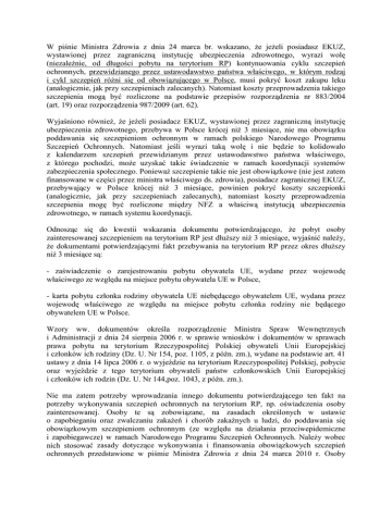 W piśnie Ministra Zdrowia z dnia 24 marca br. wskazano, Ŝe jeŜeli posiadasz EKUZ, wystawionej przez zagraniczną instytucję ubezpieczenia zdrowotnego, wyrazi wolę (niezaleŜnie, od długości pobytu na terytorium RP) kontynuowania cyklu szczepień ochronnych, przewidzianego przez ustawodawstwo państwa właściwego, w którym rodzaj i cykl szczepień róŜni się od obowiązującego w Polsce, musi pokryć koszt zakupu leku (analogicznie, jak przy szczepieniach zalecanych). Natomiast koszty przeprowadzenia takiego szczepienia mogą być rozliczone na podstawie przepisów rozporządzenia nr 883/2004 (art. 19) oraz rozporządzenia 987/2009 (art. 62). Wyjaśniono równieŜ, Ŝe jeŜeli posiadacz EKUZ, wystawionej przez zagraniczną instytucję ubezpieczenia zdrowotnego, przebywa w Polsce krócej niŜ 3 miesiące, nie ma obowiązku poddawania się szczepieniom ochronnym w ramach polskiego Narodowego Programu Szczepień Ochronnych. Natomiast jeśli wyrazi taką wolę i nie będzie to kolidowało z kalendarzem szczepień przewidzianym przez ustawodawstwo państwa właściwego, z którego pochodzi, moŜe uzyskać takie świadczenie w ramach koordynacji systemów zabezpieczenia społecznego. PoniewaŜ szczepienie takie nie jest obowiązkowe (nie jest zatem finansowane w części przez ministra właściwego ds. zdrowia), posiadacz zagranicznej EKUZ, przebywający w Polsce krócej niŜ 3 miesiące, powinien pokryć koszty szczepionki (analogicznie, jak przy szczepieniach zalecanych), natomiast koszty przeprowadzenia szczepienia mogę być rozliczone między NFZ a właściwą instytucją ubezpieczenia zdrowotnego, w ramach systemu koordynacji. Odnosząc się do kwestii wskazania dokumentu potwierdzającego, Ŝe pobyt osoby zainteresowanej szczepieniem na terytorium RP jest dłuŜszy niŜ 3 miesiące, wyjaśnić naleŜy, Ŝe dokumentami potwierdzającymi fakt przebywania na terytorium RP przez okres dłuŜszy niŜ 3 miesiące są: - zaświadczenie o zarejestrowaniu pobytu obywatela UE, wydane przez wojewodę właściwego ze względu na miejsce pobytu obywatela UE w Polsce, - karta pobytu członka rodziny obywatela UE niebędącego obywatelem UE, wydana przez wojewodę właściwego ze względu na miejsce pobytu członka rodziny nie będącego obywatelem UE w Polsce. Wzory ww. dokumentów określa rozporządzenie Ministra Spraw Wewnętrznych i Administracji z dnia 24 sierpnia 2006 r. w sprawie wniosków i dokumentów w sprawach prawa pobytu na terytorium Rzeczypospolitej Polskiej obywateli Unii Europejskiej i członków ich rodziny (Dz. U. Nr 154, poz. 1105, z późn. zm.), wydane na podstawie art. 41 ustawy z dnia 14 lipca 2006 r. o wyjeździe na terytorium Rzeczypospolitej Polskiej, pobycie oraz wyjeździe z tego terytorium obywateli państw członkowskich Unii Europejskiej i członków ich rodzin (Dz. U. Nr 144,poz. 1043, z późn. zm.). Nie ma zatem potrzeby wprowadzania innego dokumentu potwierdzającego ten fakt na potrzeby wykonywania szczepień ochronnych na terytorium RP, np. oświadczenia osoby zainteresowanej. Osoby te są zobowiązane, na zasadach określonych w ustawie o zapobieganiu oraz zwalczaniu zakaŜeń i chorób zakaźnych u ludzi, do poddawania się obowiązkowym szczepieniom ochronnym (ze względu na działania przeciwepidemiczne i zapobiegawcze) w ramach Narodowego Programu Szczepień Ochronnych. NaleŜy wobec nich stosować zasady dotyczące wykonywania i finansowania obowiązkowych szczepień ochronnych przedstawione w piśmie Ministra Zdrowia z dnia 24 marca 2010 r. Osoby zainteresowane wykonywaniem szczepienia określonego w Komunikacie Głównego Inspektora Sanitarnego z dnia 22.10.2009n r. w sprawie Programu Szczepień Ochronnych na rok 2010 (i analogicznie na następne lata), a zatem zgodnego z polskim kalendarzem szczepień ochronnych, powinny okazać ww. dokumenty potwierdzające fakt przebywania na terytorium RP przez okres dłuŜszy niŜ 3 miesiące. W kaŜdym przypadku wysokość dawki i rodzaj preparatu ustalić musi lekarz ubezpieczenia zdrowotnego, przeprowadzający badanie kwalifikacyjne lub konsultację specjalistyczną (które są niezbędne), biorąc pod uwagę stan zdrowia pacjenta, jego wiek i dokumentację dotyczącą szczepień ochronnych przeprowadzonych w państwie właściwym, o ile zostanie udostępniona. W interesie osoby mającej poddać się szczepieniu (czy to zgodnemu z polskim kalendarzem szczepień, czy przewidzianym w ustawodawstwie państwa właściwego) leŜy wykazanie, Ŝe nie otrzymała ona identycznego szczepienia w państwie zamieszkania/ubezpieczenia, jednakŜe nie moŜna wskazać jednolitego dokumentu pozwalającego na potwierdzenie tego faktu. Podkreślić jednoczenie naleŜy, Ŝe jeŜeli lekarz poweźmie jakiekolwiek wątpliwości, co do wskazań medycznych, moŜe/powinien odmówić zakwalifikowania pacjenta do szczepienia i jego wykonania na terytorium RP.