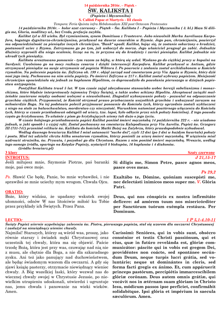14 października 2016r. – Piątek - ŚW. KALIKSTA I (Papieża i Męczennika) S. Callisti Papae et Martyris - III classis Tempora: Feria Quinta infra Hebdomadam XXI post Octavam Pentecostes 14 pażdziernika 2016r. - kolor szat czerwony - Piątek – Św. Kaliksta I – Papieża i Męczennika ( 3. kl.) Msza Si diligis me, Gloria, modlitwy wł., bez Credo, prefacja zwykła. Kalikst żył w III wieku. Był rzymianinem, synem Domitiusa z Trastevere. Jako niewolnik Marka Aureliusza Karpofora, bogatego dygnitarza-chrześcijanina, przebywał na dworze cesarskim w Rzymie. Jego pan, chrześcijanin, powierzył mu odpowiedzialność za pieniądze innych chrześcijan. "Bank" upadł. Kalikst, bojąc się, że zostanie oskarżony o kradzież, postanowił uciec z Rzymu. Zatrzymano go po tym, jak wskoczył do morza. Jego właściciel pragnął go zabić. Jednakże dłużnicy wyprosili dla niego ocalenie, licząc na to, że przyzna się do kradzieży i zwróci pieniądze. Kalikst jednakże nie ukradł tych pieniędzy. Kaliksta aresztowano ponownie - tym razem za bójkę, w którą się wdał. Wysłano go do ciężkiej pracy w kopalni na Sardynii. Uwolniono go na mocy rozkazu cesarza i dzięki interwencji Karpofora. Kalikst przebywał w Antium, gdzie otrzymywał pieniądze na swoje utrzymanie od papieża Wiktora I. Po powrocie z zesłania został archidiakonem w Kościele rzymskim. Na polecenie papieża św. Zefiryna ok. 199 r. objął zarząd nad cmentarzem przy Via Appia w Rzymie, który dziś nosi jego imię. Pochowano na nim wielu papieży. Po śmierci Zefiryna w 217 r. Kalikst został wybrany papieżem. Mniejszość chrześcijan opowiedziała się jednak za kapłanem Hipolitem, co doprowadziło do powołania pierwszego w dziejach papiestwa antypapieża. Pontyfikat Kaliksta trwał 5 lat. W tym czasie zajął zdecydowane stanowisko wobec herezji sabelianizmu i monarchizmu, które błędnie interpretowały tajemnicę Trójcy Świętej, a także wobec schizmy Hipolita. Akceptował związki małżeńskie zawierane między osobami wolnymi a niewolnikami. Złagodził wykonywanie pokuty - pozwalał na odpuszczanie grzechów ciężkich. Przypomniał, że Kościół otrzymał prawo przebaczania wszystkich grzechów i wskazywał zarazem na miłosierdzie Boga. Na tej podstawie polecił przyjmować ponownie do Kościoła tych, którzy uprzednio zostali wykluczeni z niego na stałe za bałwochwalstwo, morderstwo czy nieczystość. Warunkiem natomiast powtórnego włączenia do Kościoła tych, którzy w czasie prześladowań odstąpili od wiary, tzw. lapsi, było odbycie przez nich pokuty kościelnej. Z tego powodu często go krytykowano. To właśnie z pism go krytykujących wiemy tak dużo o jego życiu. W czasie kolejnego prześladowania papież Kalikst poniósł śmierć męczeńską 14 października 222 r. - nie wiadomo jednak, w jaki sposób i z czyjej ręki. Został pochowany na cmentarzu Kalepodiusza przy Via Aurelia. Papież św. Grzegorz III (731-741) przeniósł relikwie św. Kaliksta do kościoła Matki Bożej na Zatybrzu, który prawdopodobnie wybudował. Według dawnego brewiarza Kalikst I miał ustanowić "suche dni", czyli 12 dni (po 3 dni w każdym kwartale) pokuty i postu. Miał też udzielić chrztu kilku senatorom rzymskim, którzy ponieśli za wiarę śmierć męczeńską. W więzieniu miał uzdrowić strażnika, św. Prywata, i pozyskać go dla Chrystusa. Razem z nim poniósł śmierć męczeńską. Wreszcie, według tego samego źródła, opartego na Księdze Papieży, wyświęcił 8 biskupów, 16 kapłanów i 4 diakonów. (źródło: brewiarz.pl) 3 klasy Szaty czerwone INTROITUS: J 21,15-17 Jeśli miłujesz mnie, Szymonie Piotrze, paś baranki Si díligis me, Simon Petre, pasce agnos meos, moje, paś owce moje. pasce oves meas. Ps 29,2 Ps. Sławić Cie będę, Panie, bo mnie wybawiłeś, i nie Exaltábo te, Dómine, quóniam suscepísti me, sprawiłeś ze mnie uciechy mym wrogom. Chwała Ojcu. nec delectásti inimícos meos super me. V. Glória Patri. ORATIO: Boże, który widzisz, że upadamy wskutek swojej Deus, qui nos cónspicis ex nostra infirmitáte ułomności, odnów W nas litościwie miłość ku Tobie defícere: ad amórem tuum nos misericórditer przez przykłady ich Świętych. Przez Pana. per Sanctórum tuórum exémpla restáura. Per Dominum. LECTIO: 1 P 5,1-4.10-11 Święty Papież wiernie wypełniając zalecenia św. Piotra, pierwszego papieża, stał się wzorem dla owczarni Chrystusowej i zasłużył na niewiędnący wieniec chwały. Najmilsi! Starszych, którzy są wśród was, proszę, jako równie starszy i świadek męki Chrystusowej oraz uczestnik tej chwały, która ma się objawić. Paście trzodę Bożą, która jest przy was, czuwając nad nią nie z musu, ale chętnie dla Boga, a nie dla szkaradnego zysku. Ani też jako panujący nad duchowieństwem, ale będąc świadomym wzorem dla owczarni. A gdy się zjawi książę pasterzy, otrzymacie niewiędnący wieniec chwały. A Bóg wszelkiej łaski, który wezwał nas do wiecznej chwały swojej w Chrystusie Jezusie, po niewielkim utrapieniu udoskonali, utwierdzi i ugruntuje nas, jemu chwała i panowanie na wieki wieków. Amen. Caríssimi: Senióres, qui in vobis sunt, obsécro consénior et testis Christi passiónum, qui et eius, quæ in futúro revelánda est, glóriæ communicátor: páscite qui in vobis est gregem Dei, providéntes non coácte, sed spontánee secúndum Deum, neque turpis lucri grátia, sed voluntárie; neque ut dominántes in cleris, sed forma facti gregis ex ánimo. Et, cum appáruerit princeps pastórum, percipiétis immarcescíbilem glóriæ corónam. Deus autem omnis grátiæ, qui vocávit nos in ætérnam suam glóriam in Christo Iesu, módicum passos ipse perfíciet, confirmábit solidabítque. Ipsi glória et impérium in saecula sæculórum. Amen. Ps 106,32.31 Exáltent eum in Ecclésia plebis: et in cáthedra seniórum laudent eum. V. Confiteántur Dómino misericórdiæ eius; et mirabí