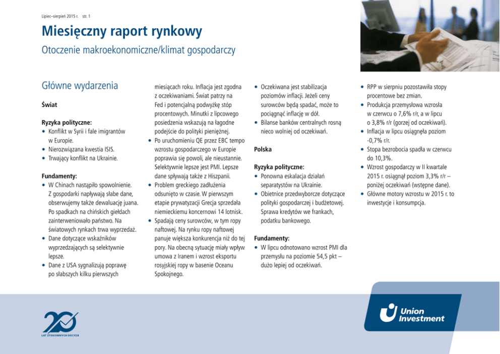 Lipiec–sierpień 2015 r. str. 1 Miesięczny raport rynkowy Otoczenie makroekonomiczne/klimat gospodarczy Główne wydarzenia Świat Ryzyka polityczne: • Konflikt w Syrii i fale imigrantów w Europie. • Nierozwiązana kwestia ISIS. • Trwający konflikt na Ukrainie. Fundamenty: • W Chinach nastąpiło spowolnienie. Z gospodarki napływają słabe dane, obserwujemy także dewaluację juana. Po spadkach na chińskich giełdach zainterweniowało państwo. Na światowych rynkach trwa wyprzedaż. • Dane dotyczące wskaźników wyprzedzających są selektywnie lepsze. • Dane z USA sygnalizują poprawę po słabszych kilku pierwszych miesiącach roku. Inflacja jest zgodna z oczekiwaniami. Świat patrzy na Fed i potencjalną podwyżkę stóp procentowych. Minutki z lipcowego posiedzenia wskazują na łagodne podejście do polityki pieniężnej. • Po uruchomieniu QE przez EBC tempo wzrostu gospodarczego w Europie poprawia się powoli, ale nieustannie. Selektywnie lepsze jest PMI. Lepsze dane spływają także z Hiszpanii. • Problem greckiego zadłużenia odsunięto w czasie. W pierwszym etapie prywatyzacji Grecja sprzedała niemieckiemu koncernowi 14 lotnisk. • Spadają ceny surowców, w tym ropy naftowej. Na rynku ropy naftowej panuje większa konkurencja niż do tej pory. Na obecną sytuację miały wpływ umowa z Iranem i wzrost eksportu rosyjskiej ropy w basenie Oceanu Spokojnego. • Oczekiwana jest stabilizacja poziomów inflacji. Jeżeli ceny surowców będą spadać, może to pociągnąć inflację w dół. • Bilanse banków centralnych rosną nieco wolniej od oczekiwań. • RPP w sierpniu pozostawiła stopy • • Polska • Ryzyka polityczne: • Ponowna eskalacja działań separatystów na Ukrainie. • Obietnice przedwyborcze dotyczące polityki gospodarczej i budżetowej. Sprawa kredytów we frankach, podatku bankowego. • Fundamenty: • W lipcu odnotowano wzrost PMI dla przemysłu na poziomie 54,5 pkt – dużo lepiej od oczekiwań. • procentowe bez zmian. Produkcja przemysłowa wzrosła w czerwcu o 7,6% r/r, a w lipcu o 3,8% r/r (gorzej od oczekiwań). Inflacja w lipcu osiągnęła poziom -0,7% r/r. Stopa bezrobocia spadła w czerwcu do 10,3%. Wzrost gospodarczy w II kwartale 2015 r. osiągnął poziom 3,3% r/r – poniżej oczekiwań (wstępne dane). Główne motory wzrostu w 2015 r. to inwestycje i konsumpcja. Lipiec–sierpień 2015 r. str. 2 Miesięczny raport rynkowy Otoczenie makroekonomiczne/klimat gospodarczy Sentyment • Poprawiają się nastroje analityków związane z sytuacją w całej strefie euro (lepsze dane z Hiszpanii). • Nastroje inwestorów w zasadzie się nie zmieniły. Europa • Pogarszają się nastroje analityków w zakresie sytuacji w Niemczech. • Na pogorszenie nastrojów wpływała głównie sytuacja w Chinach. USA • W USA obserwujemy lekkie pogorszenie nastrojów. Indeks Conference Board znalazł się poniżej poziomów z zeszłego roku. • Nastroje pozostają znacząco lepsze niż w Europie. Sentyment w USA Conference Board Sentix ZEW UE Indeks Michigan ZEW Niemcy 0 20 40 60 Sierpień Lipiec Rok wstecz Źródło: Bloomberg, opracowanie własne, dane na dzień 18.08.2015 r. -16 0 4 24 44 Sierpień Lipiec Rok wstecz Źródło: Bloomberg, opracowanie własne, dane na dzień 18.08.2015 r. 64 84 80 100 120 Lipiec–sierpień 2015 r. str. 3 Miesięczny raport rynkowy Otoczenie makroekonomiczne/klimat gospodarczy Polityka banków centralnych w skrócie Gdzie powinny być stopy procentowe według reguły Taylora Podstawowe stopy procentowe banków centralnych 4,20 2,05 0,10 3,00 3,40 0,00 1,55 0,30 0,50 0,05 0,05 0,05 0,05 0,65 0,90 0,05 0,05 0,05 2,81 3,17 0,15 0,05 -9,70 -7,25 -4,80 -3,30 -3,30 -2,00 -5,68 -4,12 -5 Turcja, po podwyżkach z zeszłego roku, dokonała kilku obniżek Węgry poniżej Polski 10 -10 -15 RPP obniża stopy do poziomu 1,5% 6 4 -15,35 -13,90 0,05 2,32 2,63 12 8 -0,55 EBC obcina stopy do 0,05% 2 Stopy obecnie Reguła Taylora, styczeń 2015 r. Reguła Taylora, sierpień 2015 r. Źródło: Bloomberg, Baseline Taylor Rule Model, opracowanie własne, dane na dzień 18.08.2015 r. Polska Węgry EBC Fed UK Turcja Sie ‘15 Wrz ‘14 Paź ‘13 Lis ‘12 Gru ‘11 Sty ‘11 Mar ‘10 Kwi ‘09 Maj ‘08 Cze ‘07 Lip ‘06 Japonia UK Szwajcaria Portugalia Grecja Hiszpania Włochy Francja Niemcy Non-core euro Core-euro Euro Fed -20 Sie‘05 0 Paź ‘04 0 0,25 Stopy procentowe w % 5 5,15 5,45 10 Wydłużony okres niskich stóp w gospodarkach rozwiniętych i nie tylko Źródło: Bloomberg, opracowanie własne, dane na dzień 18.08.2015 r. USA – czy stopy w górę we wrześniu 2015 r.? Lipiec–sierpień 2015 r. str. 4 Miesięczny raport rynkowy Otoczenie makroekonomiczne/klimat gospodarczy Bilanse banków centralnych Wartość bilansu POBC w juanach spadła W mld USD 6000 12 000 Fed mówi o zmniejszaniu skali dodruku pieniądza 5000 10 000 4000 8000 3000 6000 2000 4000 Projekcja EBC QE i BoJ 1000 2000 Fed BoJ EBC POBC Razem (prawa oś) Razem – tylko EBC (szacunek) BoJ – szacunek EBC QE – szacunek Źródło: Bloomberg, opracowanie własne, dane na dzień 18.08.2015 r. Wrz ‘16 Wrz ‘14 Wrz ‘12 Wrz ‘10 Wrz ‘08 0 Wrz ‘06 0 Wrz ‘04 Fed, powiększyły w ostatnim miesiącu swoje bilanse – do poziomu nieco niższego niż projekcja. • Fed wygasił QE3 i reinwestuje środki z zapadających obligacji, jednak inwestuje w instrumenty o krótszych terminach zapadalności. • EBC od marca 2015 r. skupuje papiery za ok. 60 miliardów euro miesięcznie. Słabsze dane lub turbulencje na rynkach obligacji mogą powodować przyspieszenie tempa interwencji. Japonii był najszybszy od kilku lat. Po lekkim wyhamowaniu nastąpił dalszy wzrost aktywów. Bank Japonii zamierza zwiększać swój bilans o 80 bln jenów rocznie (ok. 68 mld dolarów). • Wartość bilansu Ludowego Banku Chin spadła do poziomu niższego niż na początku 2015 r. W ostatnich dniach – prawdopodobnie w reakcji na zawirowania rynkowe 