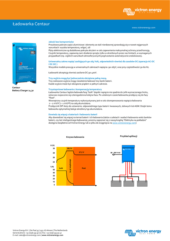 Ładowarka Centaur www.victronenergy.com Jakość bez kompromisów Proszkowo pokryte części aluminiowe i elementy ze stali nierdzewnej sprawdzają się w nawet najgorszych warunkach: wysoka temperatura, wilgoć, sól Płyty elektroniczne są dodatkowo pokryte akrylem w celu zapewnienia maksymalnej ochrony przed korozją. Czujniki temperatury, zapewnią nam działanie sprzętu tylko w określonych przez nas limitach, w wymaganych przypadkach (np. ciężkich warunkach atmosferycznych) prąd zostanie automatycznie zredukowany. Uniwersalny zakres napięć zasilających 90-265 Volt, odpowiednich również dla zasobów DC (operacje AC-DC i DC-DC ) Wszystkie modele pracują w uniwersalnych zakresach napięcia: 90-265V, oraz przy częstotliwości 50-60 Hz. Ładowarki akceptują również zasilanie DC 90-400V. Trzy wyjścia mogą być jednocześnie obciążone pełną mocą. Trzy izolowane wyjścia mogą niezależnie ładować trzy banki baterii. Każde wyjście może być obciążone prądem w pełnym zakresie. Centaur Battery Charger 24 30 Trzystopniowe ładowanie z kompensacją temperatury Ładowarka Centaur będzie ładowała fazą “bulk” dopóki napięcie nie spadnie do 70% wyznaczonego limitu, wówczas rozpocznie się czterogodzinna kolejna faza. Po ustalonym czasie ładowarka przełączy się do fazy “float”. Wewnętrzny czujnik temperatury wykorzystywany jest w celu skompensowania napięcia ładowania z – 2 mV/ºC (– 1 mV/ºF) na celę akumulatora. Przełącznik DIP służy do ustawienia odpowiedniego typu baterii: kwasowych, żelowych lub AGM. Dzięki temu ładowarka optymalniej ładuje określony typ akumulatora. Dowiedz się więcej o bateriach i ładowaniu baterii Aby dowiedzieć się więcej na temat baterii i ich ładowania (także o zaletach i wadach ładowania wielu banków baterii, czy też inteligentnego ładowania), prosimy zapoznać się z naszą książką “Elektryka na pokładzie” dostępna bezpłatnie od Victron Energy lub w pliku do ściągnięcia na www.victronenergy.com) Krzywa ładowania U (V) 28,5 V 30 27,2 V 28 26 I (A) 50 bulk 40 30 20 10 0 Victron Energy B.V. | De Paal 35 | 1351 JG Almere | The Netherlands General phone: +31 (0)36 535 97 00 | Fax: +31 (0)36 535 97 40 E-mail: [email protected] | www.victronenergy.com absorption (4 h) 24 float Przykład aplikacji Ładowarka Centaur 12/20 12/30 24/16 12/40 12/50 Napięcie wejścia (V AC) 90 – 265 Napięcie wejścia (V DC) 90 – 400 Częstotliwość wejścia (Hz) 45 – 65 Współczynnik mocy 12/100 24/60 60 / 30 80 / 40 100 / 60 320 - 800 160 - 400 400 - 1000 240 - 600 14,3 / 28,5 (1) 13,5 / 27,0 (1) 3 20 30 / 16 40 50 Amperomierz główny Tak Charakterystyka ładowania Rekomendowana pojemnośc baterii (Ah) 12/80 24/40 1 Napięcie ładowania ‘‘absorpcja‘’(V DC) Napięcie ładowania”float” (V DC) Ilość wyjść Charge current (A) (2) 12/60 24/30 IUoU (ładowanie trzyfazowe) 80 - 200 120 - 300 45 - 150 Czujnik temperatury 160 - 400 200 - 500 240 - 600 120 - 300 Wewnętrzny, - 2mV / °C (- 1mV / °F) na celę akumulatora Wymuszone chłodzenie Tak, wentylator kontrolowany temperaturowo i prądowo Ochrona Zabezpieczenie przeciwzwarciowe wyjścia, przeciążeniowe temperaturowe Praca w zakresie temp. - 20 to 60°C (0 - 140°F) Wykonanie iskrobezpieczne Tak Wilgotność (bez kondensacji) max 95% ZAŁĄCZNIKI Materiał i kolor Przyłącza baterii aluminium (niebieski RAL 5012) M6 studs M6 studs M8 studs Przyłącza AC M8 studs Kategoria ochrony Waga kg (lbs) Wymiary (wysokość x szerokość x głębokość) -[mm] - w calach M8 studs M8 studs M8 studs screw-clamp 4 mm² (AWG 6) IP 20 3,8 (8.4) 3,8 (8.4) 5 (11) 5 (11) 5 (11) 12 (26) 12 (26) 355x215x110 (14.0x8.5x4.3) 355x215x110 (14.0x8.5x4.3) 426x239x135 (16.8x9.4x5.3) 426x239x135 (16.8x9.4x5.3) 426x239x135 (16.8x9.4x5.3) 505x255x130 (19.9x10.0x5.2) 505x255x130 (19.9x10.0x5.2) STANDARDY Bezpieczeństwo EN 60335-1, EN 60335-2-29, UL 1236 Emisja EN 55014-1, EN 61000-3-2 Obojętność dla środowiska EN 55014-2, EN 61000-3-3 1) Standardowe ustawienia. Optymalne płynne napięcie ładowania dla akumulatora kwasowego, żelowego lub AGM, wybierane poprzez przełącznik charakterystyk. 2) Do 40 °C (100 °F) .Wyjście Bedzie redukowane średnio do 80% przy 50 °C (120 °F) i do 60 % przy 60 °C (140°F). Installation made easy 1. BMV-700 Battery Monitor Battery Alarm T Monitor baterii BMV – 700 charakteryzuje się systemem zaawansowanej mikroprocesorowej kontroli połączonej z wysokiej czułości systemem pomiarów napięcia oraz prądu ładowania, rozładowywania baterii. Oprócz tego oprogramowanie zawiera kompletna kalkulację algorytmiczną, taką jak formuła Puekert'a, która determinuję dokładny stan naładowania baterii. BMV – 700 selektywnie wyświetla napięcie baterii, prąd, zużyte amperogodziny oraz czas pozostały do pełnego rozładowania baterii. Wizualizacja stanu baterii (stan niski lub wysoki) wraz z alarmem dźwiękowym. Victron Energy B.V. | De Paal 35 | 1351 JG Almere | The Netherlands General phone: +31 (0)36 535 97 00 | Fax: +31 (0)36 535 97 40 E-mail: [email protected] | www.victronenergy.com 2. Zamocować oddzielną płytkę montażową (A) do ściany w miejscu, gdzie ma się znajdować ładowarka i zaczepić na niej ładowarkę Centaur. Zamocować dół tylnej ścianki (B) do ściany.