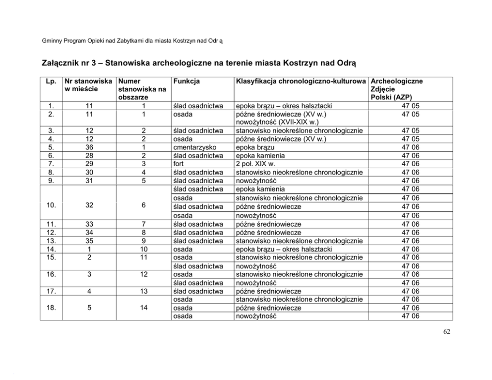 Załącznik nr 3 – Stanowiska archeologiczne na terenie miasta