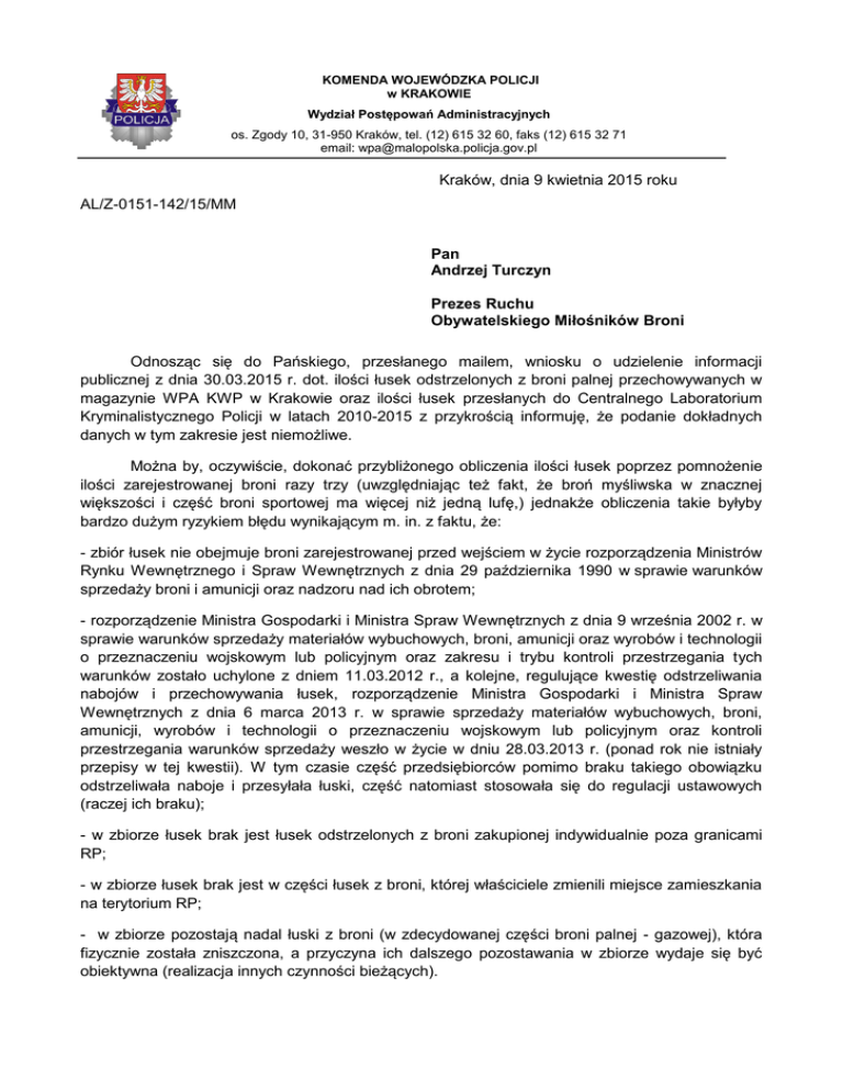 KOMENDA WOJEWÓDZKA POLICJI w KRAKOWIE Wydział Postępowań Administracyjnych os. Zgody 10, 31-950 Kraków, tel. (12) 615 32 60, faks (12) 615 32 71 email: [email protected] Kraków, dnia 9 kwietnia 2015 roku AL/Z-0151-142/15/MM Pan Andrzej Turczyn Prezes Ruchu Obywatelskiego Miłośników Broni Odnosząc się do Pańskiego, przesłanego mailem, wniosku o udzielenie informacji publicznej z dnia 30.03.2015 r. dot. ilości łusek odstrzelonych z broni palnej przechowywanych w magazynie WPA KWP w Krakowie oraz ilości łusek przesłanych do Centralnego Laboratorium Kryminalistycznego Policji w latach 2010-2015 z przykrością informuję, że podanie dokładnych danych w tym zakresie jest niemożliwe. Można by, oczywiście, dokonać przybliżonego obliczenia ilości łusek poprzez pomnożenie ilości zarejestrowanej broni razy trzy (uwzględniając też fakt, że broń myśliwska w znacznej większości i część broni sportowej ma więcej niż jedną lufę,) jednakże obliczenia takie byłyby bardzo dużym ryzykiem błędu wynikającym m. in. z faktu, że: - zbiór łusek nie obejmuje broni zarejestrowanej przed wejściem w życie rozporządzenia Ministrów Rynku Wewnętrznego i Spraw Wewnętrznych z dnia 29 października 1990 w sprawie warunków sprzedaży broni i amunicji oraz nadzoru nad ich obrotem; - rozporządzenie Ministra Gospodarki i Ministra Spraw Wewnętrznych z dnia 9 września 2002 r. w sprawie warunków sprzedaży materiałów wybuchowych, broni, amunicji oraz wyrobów i technologii o przeznaczeniu wojskowym lub policyjnym oraz zakresu i trybu kontroli przestrzegania tych warunków zostało uchylone z dniem 11.03.2012 r., a kolejne, regulujące kwestię odstrzeliwania nabojów i przechowywania łusek, rozporządzenie Ministra Gospodarki i Ministra Spraw Wewnętrznych z dnia 6 marca 2013 r. w sprawie sprzedaży materiałów wybuchowych, broni, amunicji, wyrobów i technologii o przeznaczeniu wojskowym lub policyjnym oraz kontroli przestrzegania warunków sprzedaży weszło w życie w dniu 28.03.2013 r. (ponad rok nie istniały przepisy w tej kwestii). W tym czasie część przedsiębiorców pomimo braku takiego obowiązku odstrzeliwała naboje i przesyłała łuski, część natomiast stosowała się do regulacji ustawowych (raczej ich braku); - w zbiorze łusek brak jest łusek odstrzelonych z broni zakupionej indywidualnie poza granicami RP; - w zbiorze łusek brak jest w części łusek z broni, której właściciele zmienili miejsce zamieszkania na terytorium RP; - w zbiorze pozostają nadal łuski z broni (w zdecydowanej części broni palnej - gazowej), która fizycznie została zniszczona, a przyczyna ich dalszego pozostawania w zbiorze wydaje się być obiektywna (realizacja innych czynności bieżących). Rozumiejąc, że nie było Pańskim zamiarem żądanie fizycznego liczenia ilości łusek pozostających w zbiorze WPA KWP w Krakowie liczę, że przyjmie Pan informację w przekazanej przez mnie formie. Odnosząc się do kwestii ilości łusek przesłanych w latach 2010-2015 do Centralnego Laboratorium Kryminalistycznego Policji informuję, że nie przewidywałem, by takie dane ilościowe były potrzebne i nie były one zbierane. Stwierdzić mogę jedynie, że w przypadku rejestracji broni utraconej, gdy odstrzelone łuski znajdowały się w aktach posiadacza broni (dotyczyło to w większości łusek z broni palnej gazowej i małokalibrowej broni sportowej) były one przesyłane. Określić mogę, że nie były to istotne ilości. Mam nadzieję, że przekazana informacja będzie wystarczająca. NACZELNIK Wydziału Postępowań Administracyjnych Komendy Wojewódzkiej Policji w Krakowie Wykonano 1 egz. przesłano pocztą elektroniczną [email protected] MM. mł. insp. mgr Leszek Szopa Elektronicznie podpisany przez Leszek Andrzej Szopa, NACZELNIK WYDZIAŁU WYDZIAŁU POSTĘPOWAŃ ADMINISTRACYJNYCH DN: c=PL, givenName=Leszek Andrzej, sn=Szopa, cn=Leszek Andrzej Szopa, cn=NACZELNIK WYDZIAŁU WYDZIAŁU POSTĘPOWAŃ ADMINISTRACYJNYCH, serialNumber=PESEL: 56020807576, o=Komenda Wojewódzka Policji w Krakowie, st=małopolskie, l=Kraków, postalAddress=Mogilska 109, 31-571, Kraków Data: 2015.04.10 09:38:36 +02'00'
