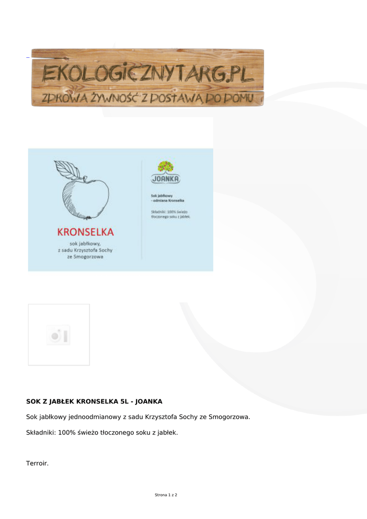 SOK Z JABŁEK KRONSELKA 5L - JOANKA Sok jabłkowy jednoodmianowy z sadu Krzysztofa Sochy ze Smogorzowa. Składniki: 100% świeżo tłoczonego soku z jabłek. Terroir. Strona 1 z 2 Jako pierwsi z producentów soków jabłkowych oznaczamy nie tylko odmiany, z których sok został wyprodukowany, ale też miejsca uprawiania owoców, czyli ich terroir. Jest to słowo stosowane powszechnie w winiarstwie, a oznaczające siedlisko winorośli. Składa się nań: miejsce, gdzie jest uprawa wraz z jego klimatem, glebą, ukształtowaniem powierzchni i cieków wodnych, ale także uświęcony tradycją sposób uprawy. Znając terroir możemy się domyślić jaki smak będzie miał finalny produkt, bo każda z jego cech ma wpływ na jakość i specyfikę owocu. To, co dotyczy winorośli, naszym zdaniem dotyczy również jabłek i wszelkich produktów jakie z nich utrzymujemy. Smak soku pochodzącego z tej samej odmiany różni się w zależności od miejsca, w którym rosły owoce. Dlatego oznaczamy zarówno miejscowość w której rośnie sad, jak i konkretny sad należący do pojedynczego rolnika. Powoli zdobywamy wiedzę o naszych terroir. Wiemy, że za kilka lat będziemy widzieli lepiej wszelkie zależności pomiędzy miejscem skąd pochodzą owoce, a jakością soku. Ale już teraz takie podejście gwarantuje bezkompromisową jakość naszych produktów. Zbigniew Kmieć i Joanka Szewczyk Strona 2 z 2
