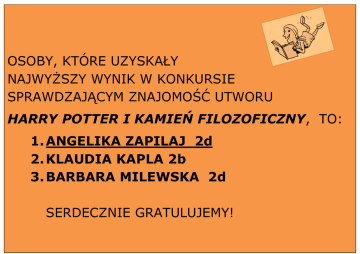 OSOBY, KTÓRE UZYSKAŁY NAJWYŻSZY WYNIK W KONKURSIE SPRAWDZAJĄCYM ZNAJOMOŚĆ UTWORU HARRY POTTER I KAMIEŃ FILOZOFICZNY, TO: 1. ANGELIKA ZAPILAJ 2d 2. KLAUDIA KAPLA 2b 3. BARBARA MILEWSKA 2d SERDECZNIE GRATULUJEMY!